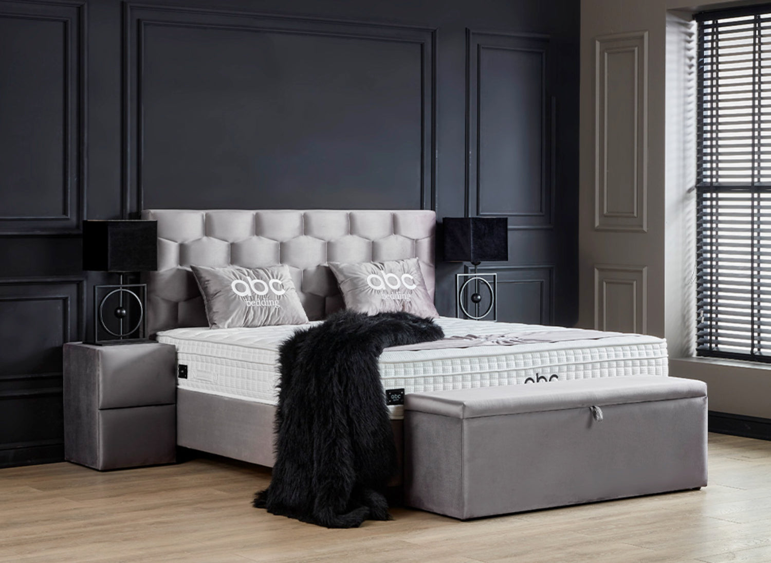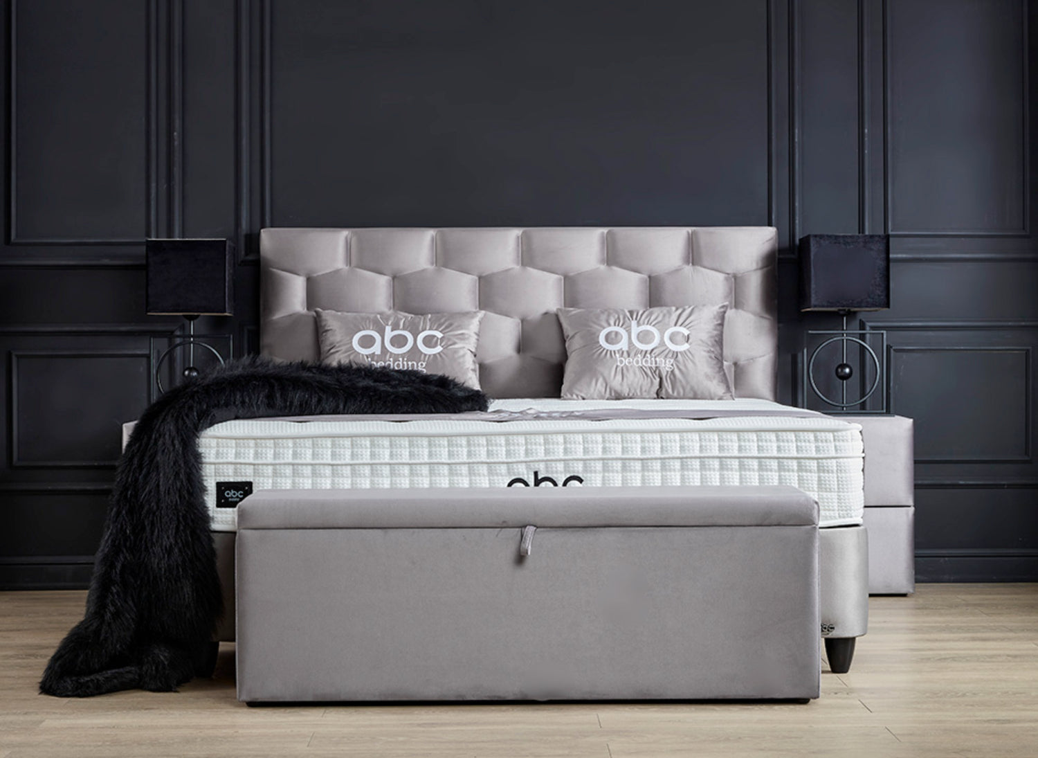 Das Palermo Boxspringbett besticht durch seine elegante Gestaltung in der Farbe Grau. Der luxuriöse Samtbezug (Farbcode 104TS) verleiht dem Bett eine zeitlose Ästhetik, die sich harmonisch in unterschiedliche Schlafzimmerdekore einfügt. Das hohe Block-Kopfteil mit einer Höhe von ca. 122 cm präsentiert sich in einem klassischen und luxuriöses Design aus. Die geometrische, wagenartige Polsterung sorgt für eine einzigartige Optik, die Tiefer und Struktur schafft. Diese aufwendige Gestaltung macht das Kopfteil zu einem stillvollen Hingucker und fügt sich harmonisch in verschiedene Einrichtungsstille ein. Der hochwertige, samtige Bezug in einem Grau verleiht dem Kopfteil eine weiche, einladende Haptik und gleichzeitig eine edle Optik. Der Großzügige Höhe und die Seitenteile des Kopfteils bieten nicht nur optisch beeindruckende Präsenz, sondern auch praktische Nutzen als bequeme Rückenlehne. Diese Gestaltung sorgt für ein angenehmes Anlehnen beim Lesen oder Fernsehen im Bett. Das harmonische Zusammenspiel aus Material, Farbe und Design macht dieses Kopfteil zu einem zentralen Element des Bettes und setzt in jedem Schlafzimmer stilvolle Akzente.