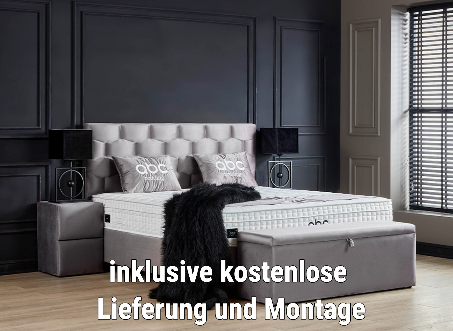 Boxspringbett Palermo Grau Voll-orthopädisches Komfortbett mit Bettkasten, Stauraum, inkl. kostenlose Lieferung und Montage
