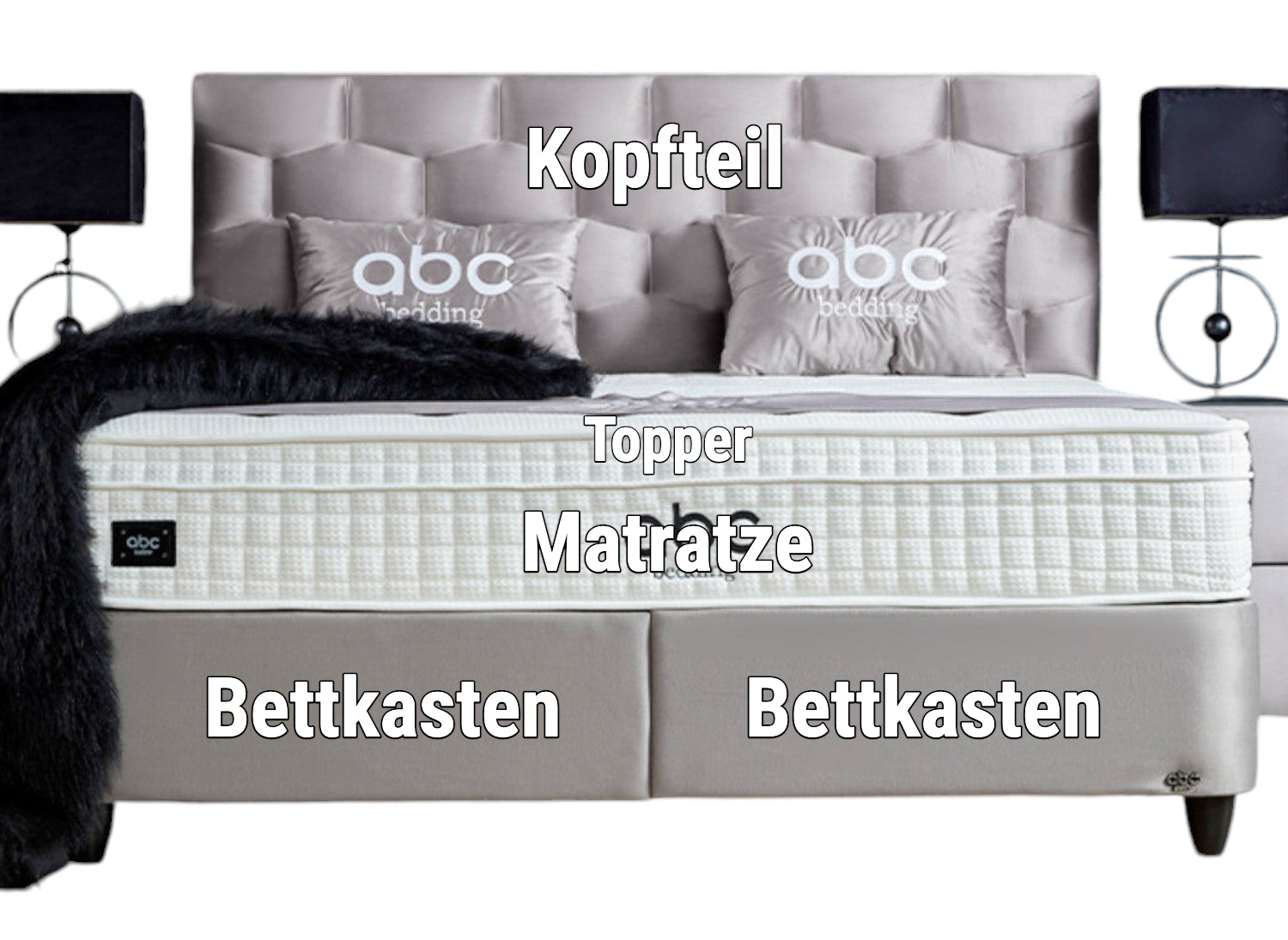 Bettbreite 180 cm. Farbe Grau, gepolsterte Kopfteil mit Steppung (ca. Höhe 122 cm), Liegehöhe ca. 66 cm, H3/H4 - Medium/Hard: 5-Zonen-Federkernmatratzen bis 120kg/je Seite (vollorthopädisch, antibakteriell, atmungsaktiv), Kaltschaum-Toper, 2 x Bettkasten (90 x 200 cm) mit hochwertige Gasfedern System, Metallrahmen. Das Bett wird ohne Dekoration, ohne Nachtkonsolen, ohne Bettruhe und ohne Kissen geliefert. Kann als Option zum Bett bestellt werden: Nachtkonsole/n (B/H/T ca. 40 x 63 x 43 cm) und Bettruhe (B/H/T ca. 140 x 50 x 43 cm). Die Farbe des Artikels kann im Vergleich zu den Fotos auf der Website leicht abweichen, was auf die Lichtverhältnisse in den verschiedenen Räumen zurückzuführen ist. Es kann heller oder dunkler aussehen.