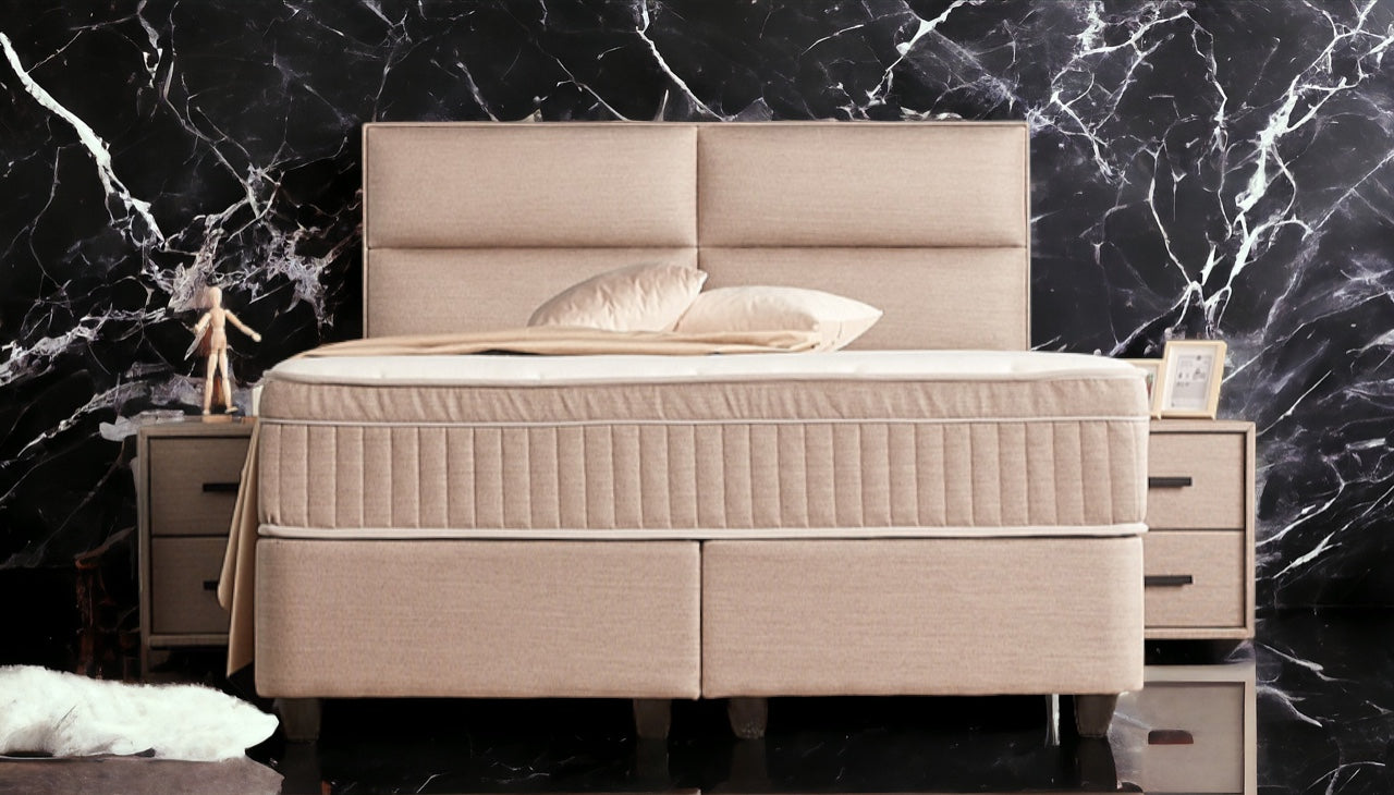 Boxspringbett Senna Beige/Braun Voll-orthopädisches Komfortbett mit Bettkasten, Stauraum, inkl. kostenlose Lieferung und Montage