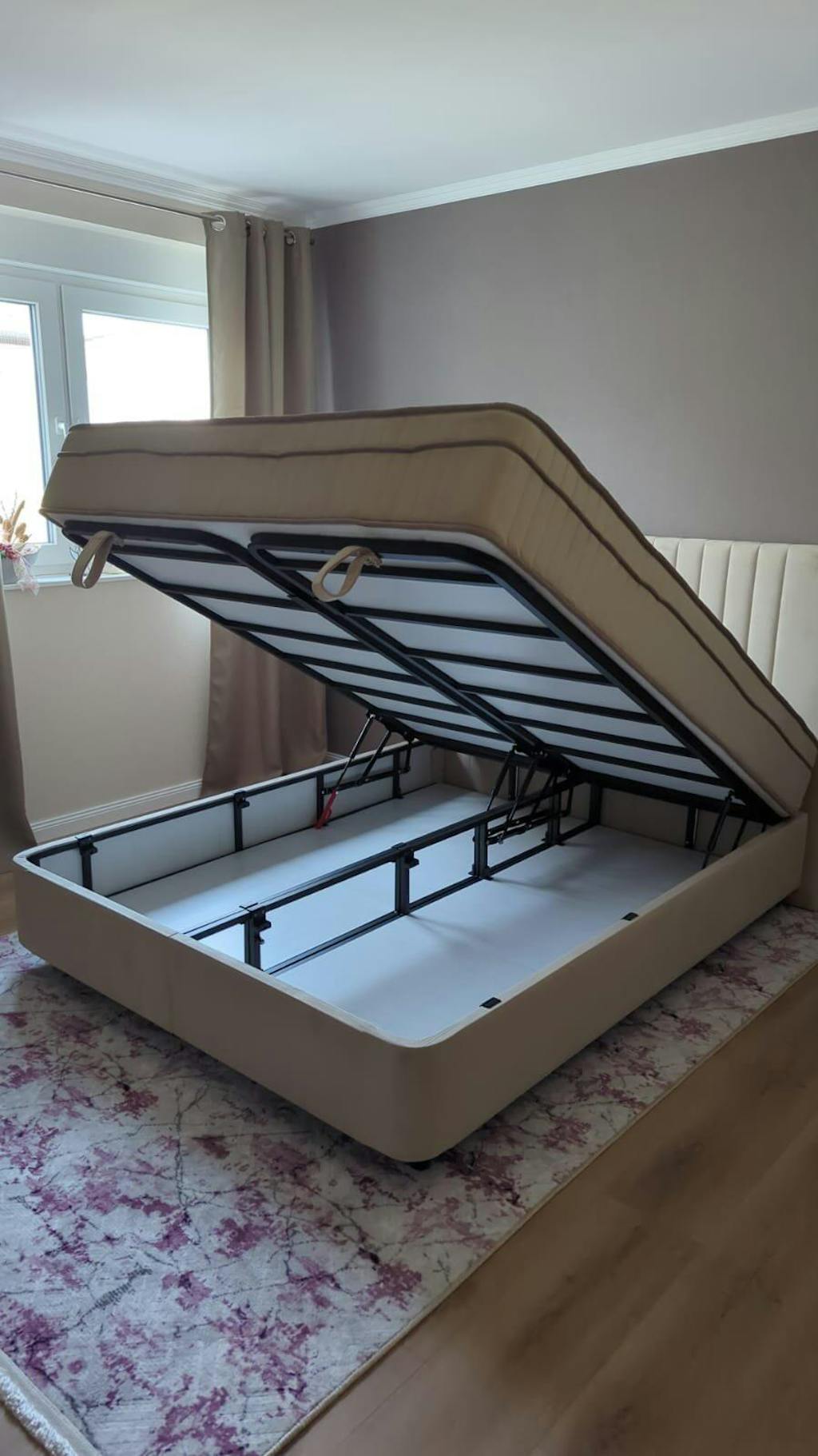 Bett in Farbe Beige mit gepolsterte Kopfteil mit Steppung (ca. Breite 112 cm und Höhe 121 cm), Liegehöhe ca. 63 cm, H3/H4 - Medium/Hard: 7-Zonen-Federkernmatratzen bis 110kg/je Seite (orthopädisch, antibakteriell), Kaltschaum-Toper, 1 x Bettkasten mit Gasfedern System, Metallrahmen. Das Bett wird ohne Dekoration, ohne Nachtkonsolen, ohne Bettruhe und ohne Kissen geliefert. Die Farbe des Artikels kann im Vergleich zu den Fotos auf der Website leicht abweichen, was auf die Lichtverhältnisse in den verschiedenen Räumen zurückzuführen ist. Es kann heller oder dunkler aussehen.