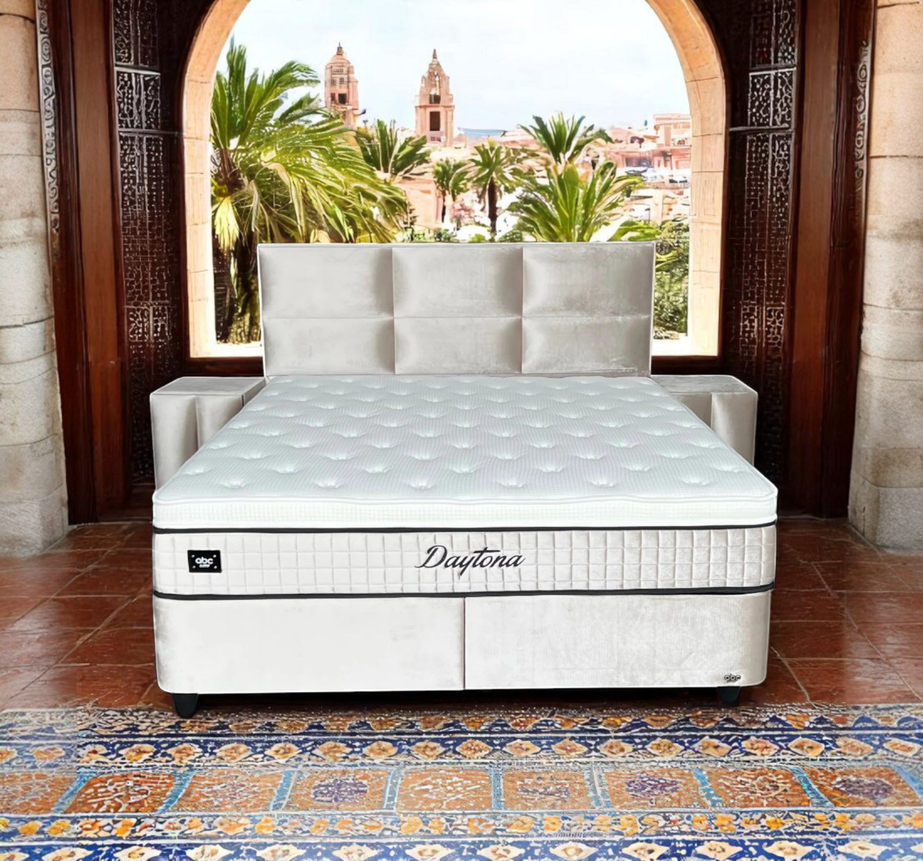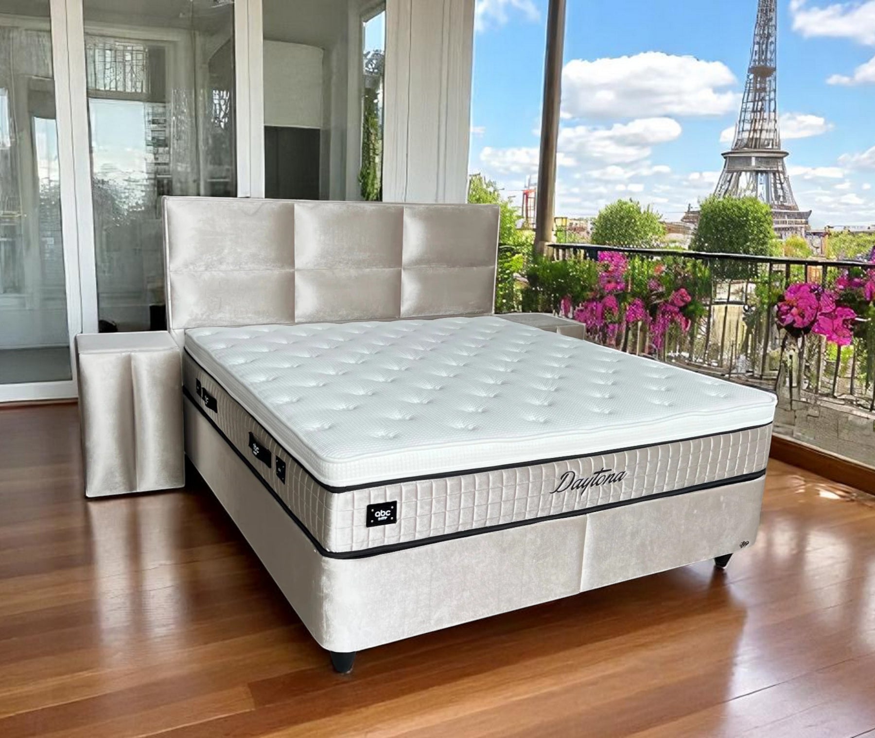 Das Daytona Boxspringbett besticht durch seine elegante Gestaltung in der Farbe Hellbeige. Der luxuriöse Samtbezug verleiht dem Bett eine zeitlose Ästhetik, die sich harmonisch in unterschiedliche Schlafzimmerdekore einfügt. Das hohe Block-Kopfteil mit einer Höhe von ca. 125 cm unterstreicht den modernen Charakter des Bettes und bietet gleichzeitig eine bequeme Rückenlehne für entspannte Stunden beim Lesen oder Fernsehen. Das Kopfteil zeichnet sich durch ein modernes, elegantes Design aus. Die großzügige Höhe des Kopfteils sorgt für einen imposanten Look.