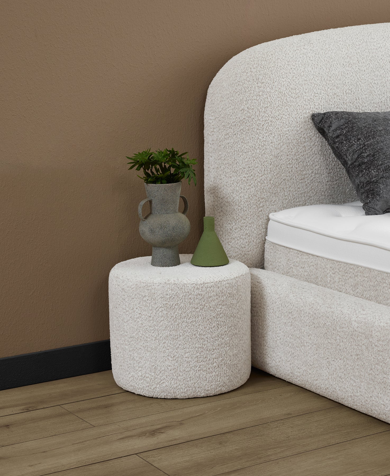 Der umlaufend gepolsterte Bettrahmen greift das weiche, segmentierte Design des Kopfteils auf und sorgt für eine harmonische, moderne Optik. Der hochwertige, strapazierfähige Stoffbezug fühlt sich angenehm an und bringt wohnliche Wärme ins Zimmer.