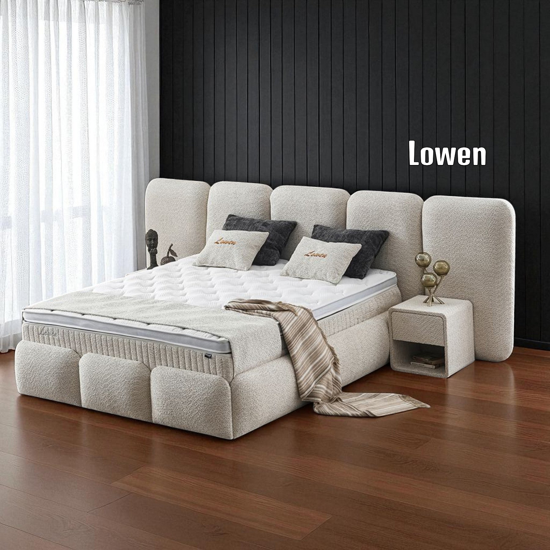 Das Boxspringbett Lowen besticht durch sein markantes, weich gepolstertes Kopfteil mit großen, gleichmäßig gesteppten Paneelen. Die organische, abgerundete Formgebung wirkt einladend und verleiht dem Bett einen luxuriösen Lounge-Charakter. Mit einer Höhe von ca. 112 cm ist das Kopfteil perfekt geeignet für Schlafzimmer mit Dachschrägen oder Räumen, in denen die Höhe begrenzt ist – ohne dabei auf Präsenz und Komfort zu verzichten. Das XXL-Kopfteil ist modern und außergewöhnlich gestaltet. Es besteht aus 5 gepolsterten, rechteckigen Elementen mit abgerundeten Ecken, die in eine Reihe angeordnet sind. Die Polsterelemente sind so breit, dass sie seitlich die Nachttische einrahmen, wodurch das Kopfteil optisch in den Raum integriert wird.