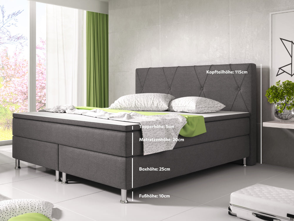 Bettbreite 180 cm. Farbe Anthrazit. Kopfteil (ca. Höhe 115 cm), Liegehöhe ca. 60 cm, 7-Zonen-Federkernmatratze im Härte H3, Kaltschaum-Toper ca. 5 cm, 2 x Mini-Taschenfederkern-Box (TFK) (90 x 200 cm). Das Bett wird ohne Dekoration geliefert. Die Farbe des Artikels kann im Vergleich zu den Fotos auf der Website leicht abweichen, was auf die Lichtverhältnisse in den verschiedenen Räumen zurückzuführen ist. Es kann heller oder dunkler aussehen.