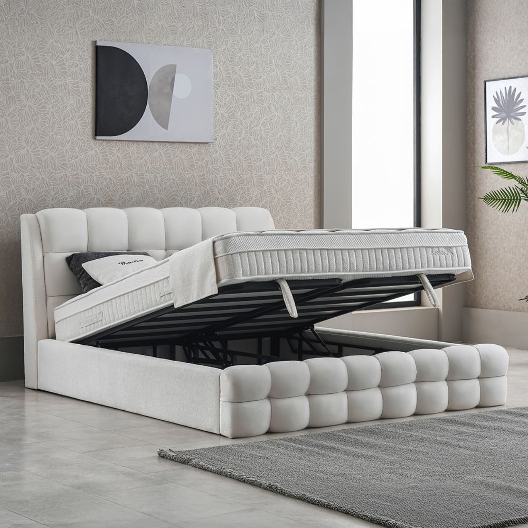 Ein herausragendes Merkmal des Mauro Boxspringbettes ist der integrierte Bettkasten, der großzügigen Stauraum für Bettwäsche, Decken oder andere Utensilien bietet. Der Zugang zum Bettkasten erfolgt über ein innovatives Gasfedersystem, das ein leichtes Anheben der Matratze ermöglicht und somit den Stauraum mühelos zugänglich macht. Diese Funktion ist besonders in kleineren Schlafzimmern von Vorteil, da sie hilft, den vorhandenen Platz effizient zu nutzen und für Ordnung zu sorgen.