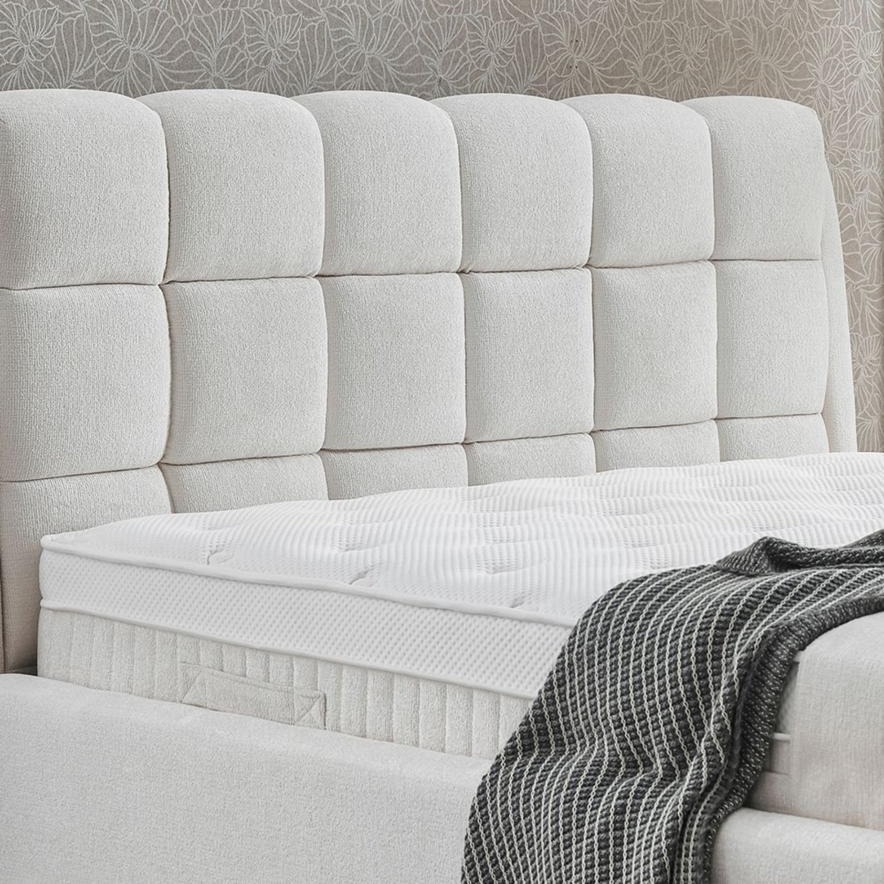 Das Boxspringbett Mauro ist in einem edlen Creme-Ton gehalten – einer harmonischen Mischung aus Creme und Beige, die je nach Lichteinfall sanft zwischen warmen und kühlen Nuancen changiert. Diese vielseitige Farbe lässt sich mühelos mit neutralen oder kontrastreichen Wohnpaletten kombinieren und verleiht dem Schlafzimmer eine moderne, zugleich gemütliche Atmosphäre. Die matte Stoffstruktur unterstreicht den weichen Charakter und sorgt für eine angenehm warme Haptik.