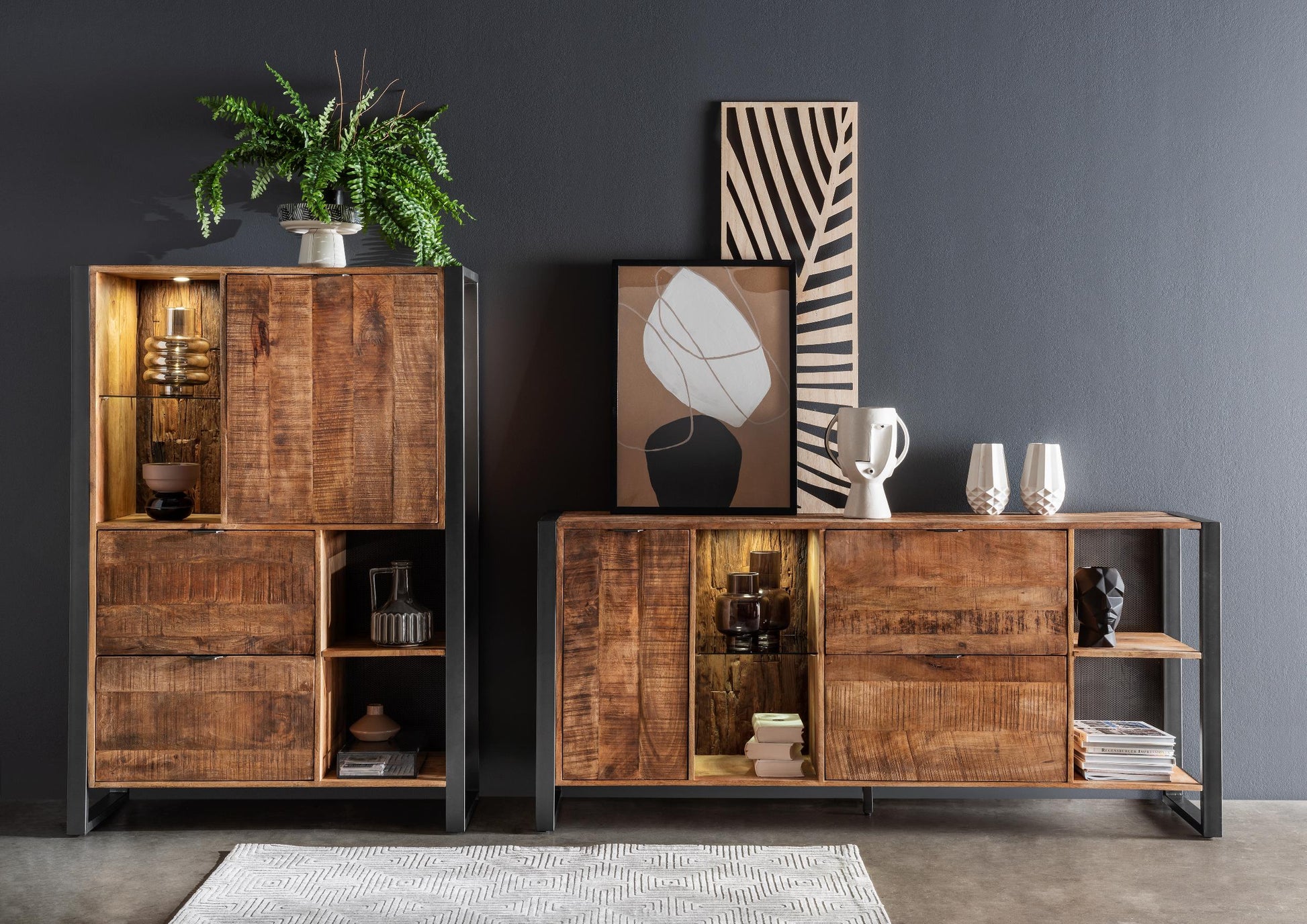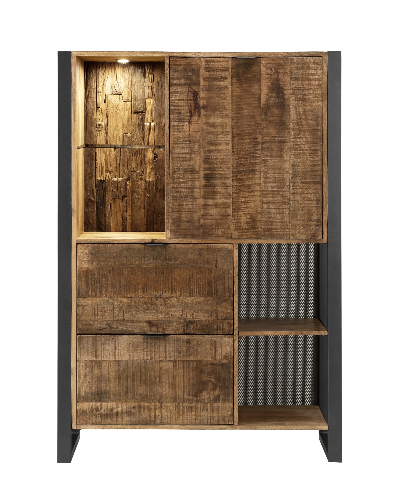Dekor aus massivem recyceltem Mangoholz, Eisen-Lochblech-Rückwand, Metallrahmen anthrazit, inkl. Beleuchtung. Lieferzeit ca. 5-8 Wochen.