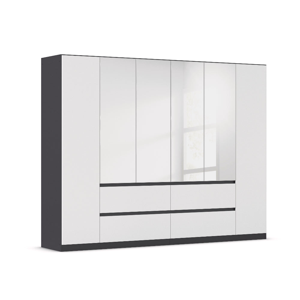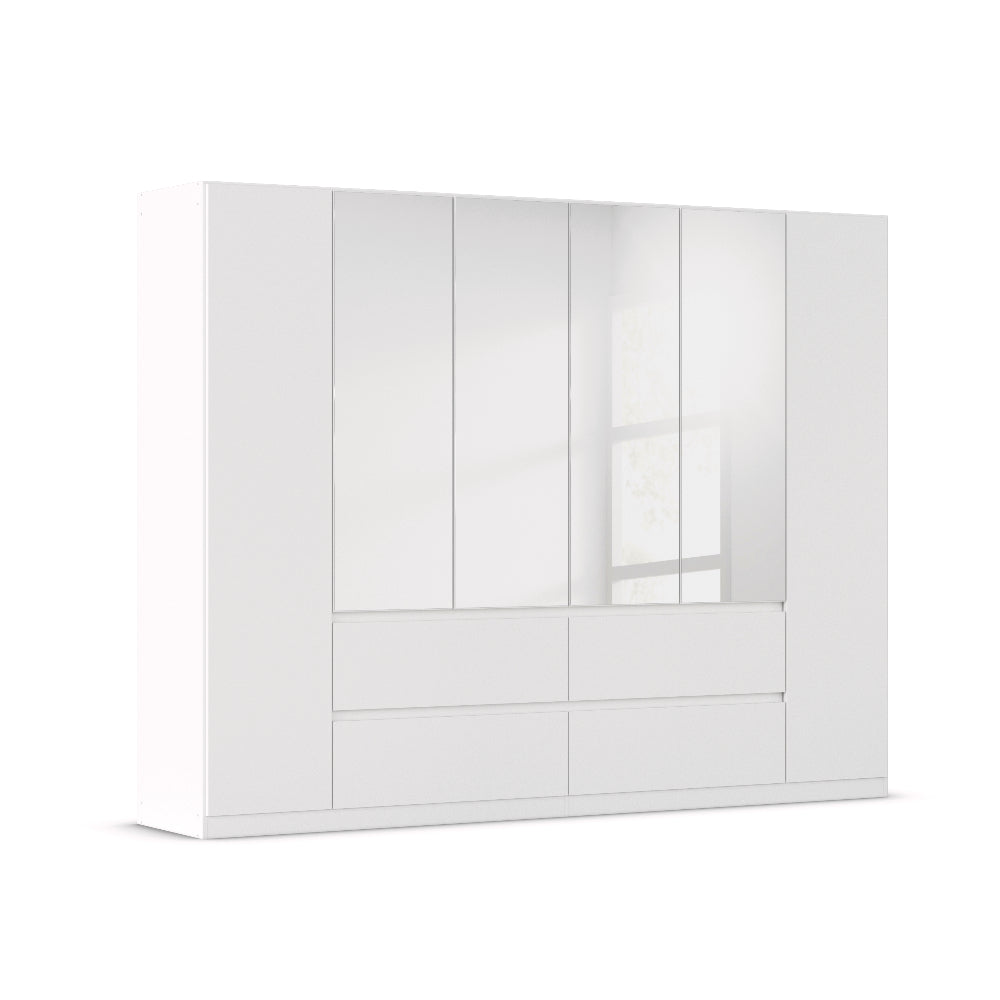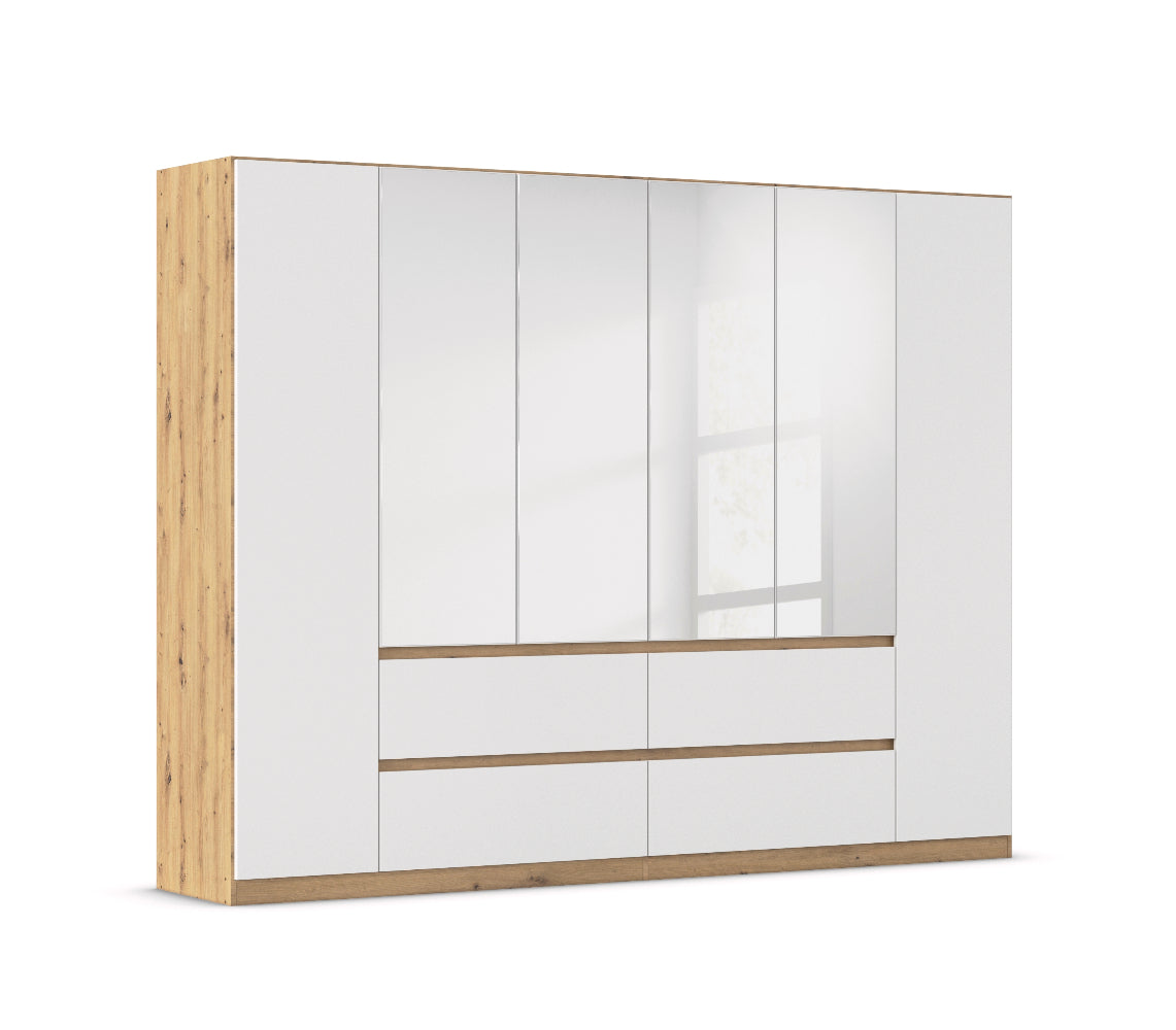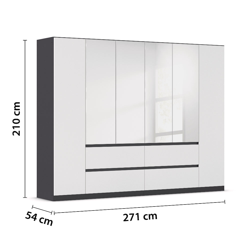 Bringen Sie frischen Wind in Ihr Zuhause mit dem Rauch Drehtürenschrank Mainz. Die 6 Türen und 4 Schubladen bieten viel Stauraum und das moderne Design verleiht Ihrem Raum eine stilvolle Note. Mit einer Breite von 270 cm und einer Höhe von 210 cm passt dieser Schrank perfekt in jeden Raum. Dank der push to open Funktion der Schubladen lässt sich der Schrank bequem öffnen und bietet viel Stauraum für Kleidung und andere Gegenstände. Die Spiegeltüren verleihen dem Schrank eine elegante Note und die Schubladen sorgen für eine ordentliche Aufbewahrung. Macht gleichzeitig Platz und reflektiert natürliches Licht für eine helle Atmosphäre.