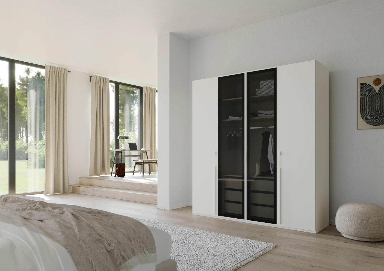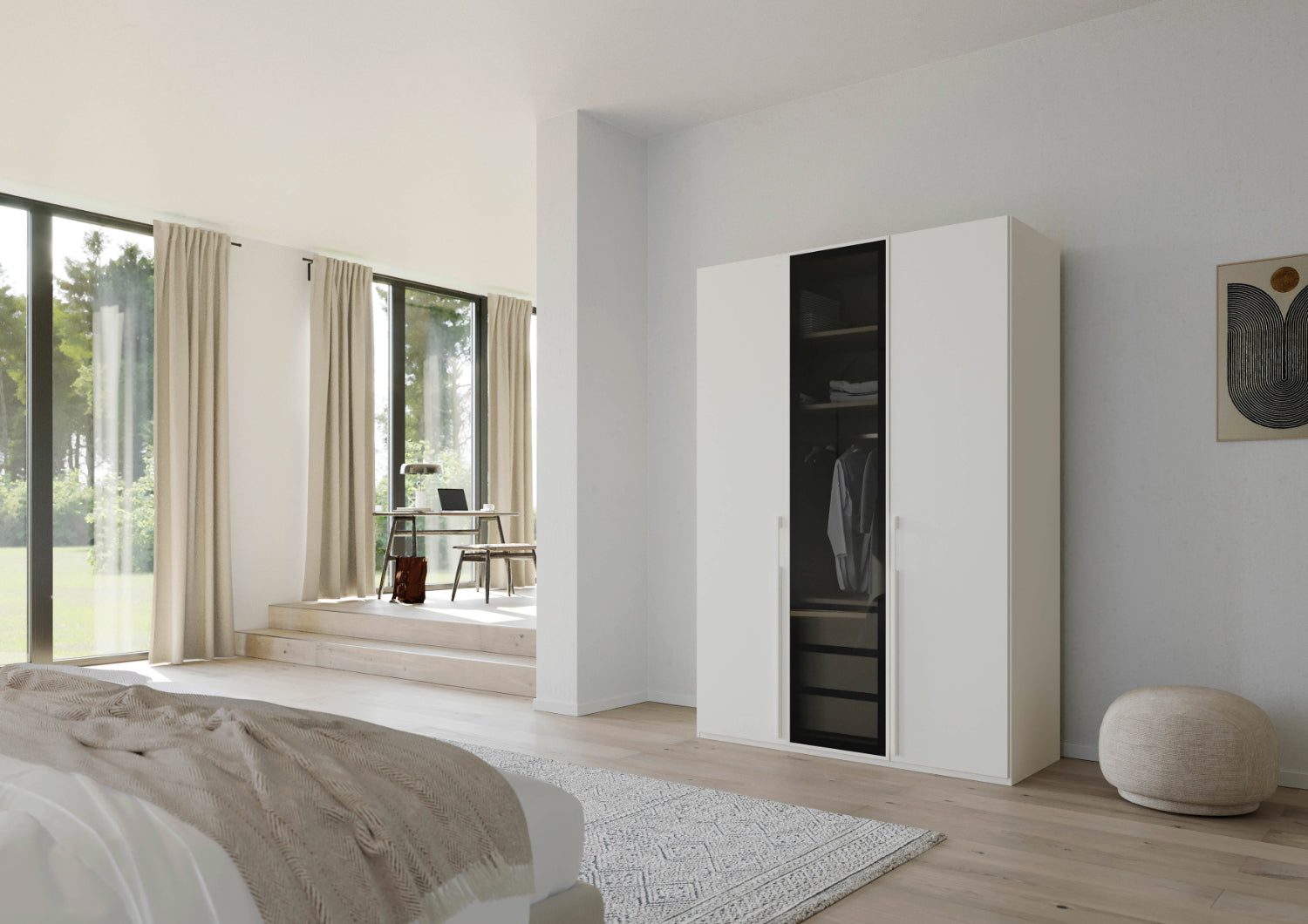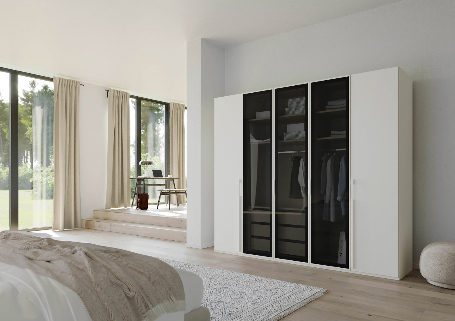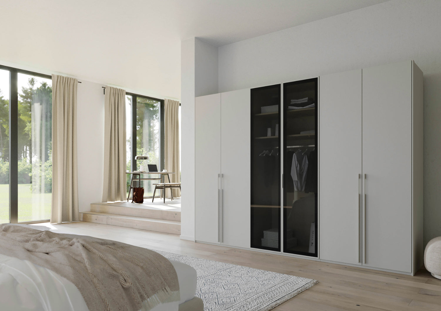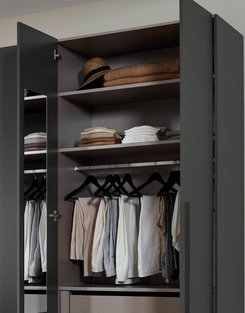 Sie haben die Wahl zwischen drei eleganten Farben: Alpinweiß, Seidengrau oder Graphit – Farben, die sich mühelos in jedes Interieur integrieren und Ihrem Raum eine moderne und stilvolle Atmosphäre verleihen. Die Fronten sind mit hochwertigem Holzdekor und mit transparenten Grauglasstüren erhältlich, was den Schrank zu einem echten Blickfang in Ihrem Schlafzimmer macht. Der Schrank ist in zwei Höhen zu erhalten: 223 cm und 235 cm.