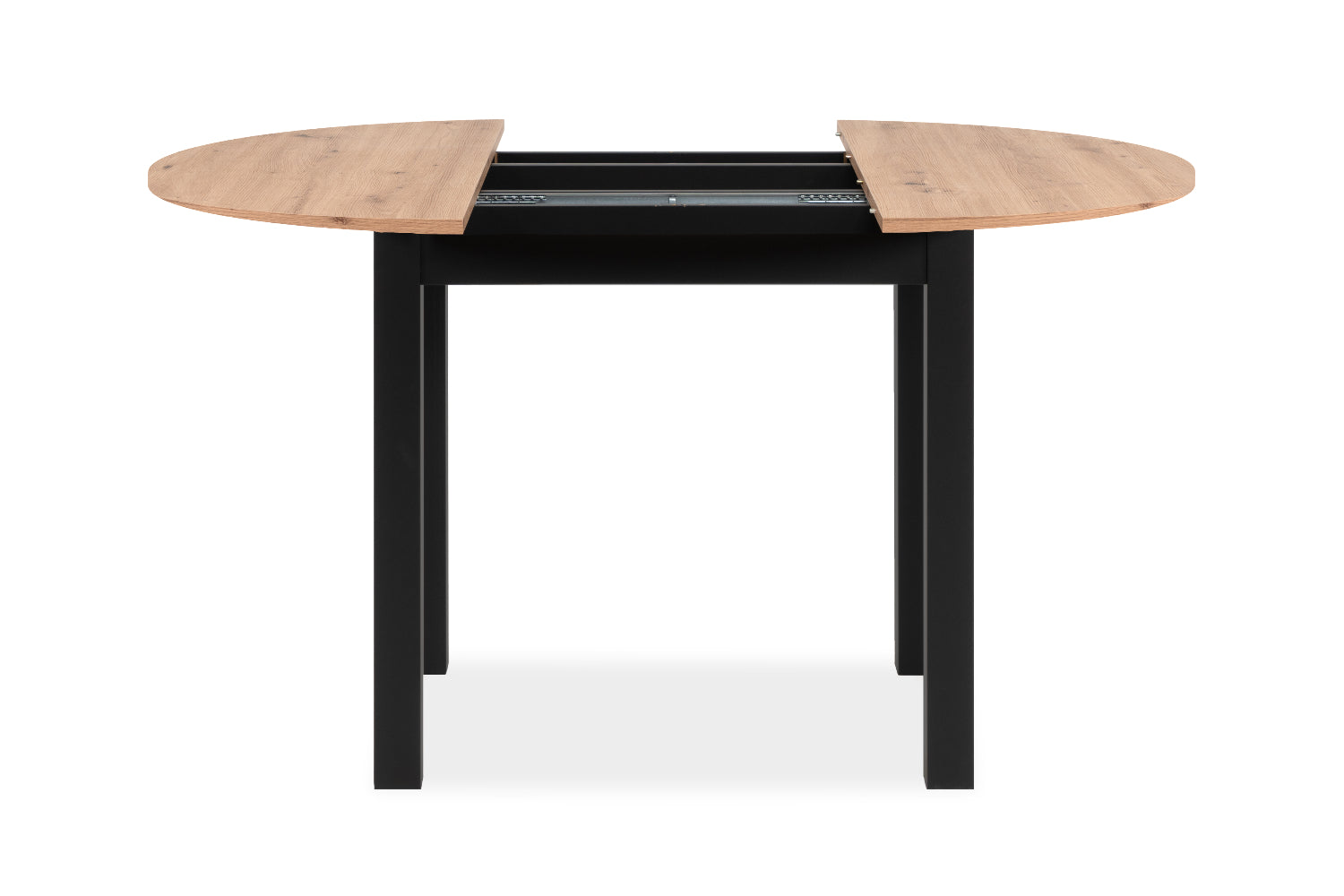 Rundförmig, Auszugfunktion vom 100 bis 140 cm. Dekor: Holzwerkstoff Eiche-Sonoma-Nachbildung.