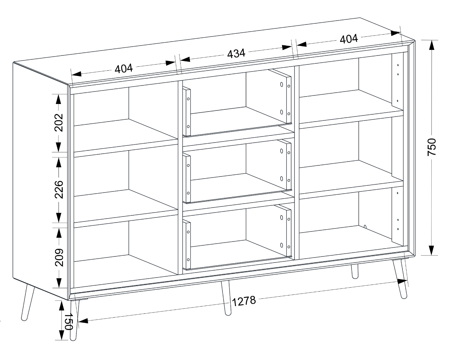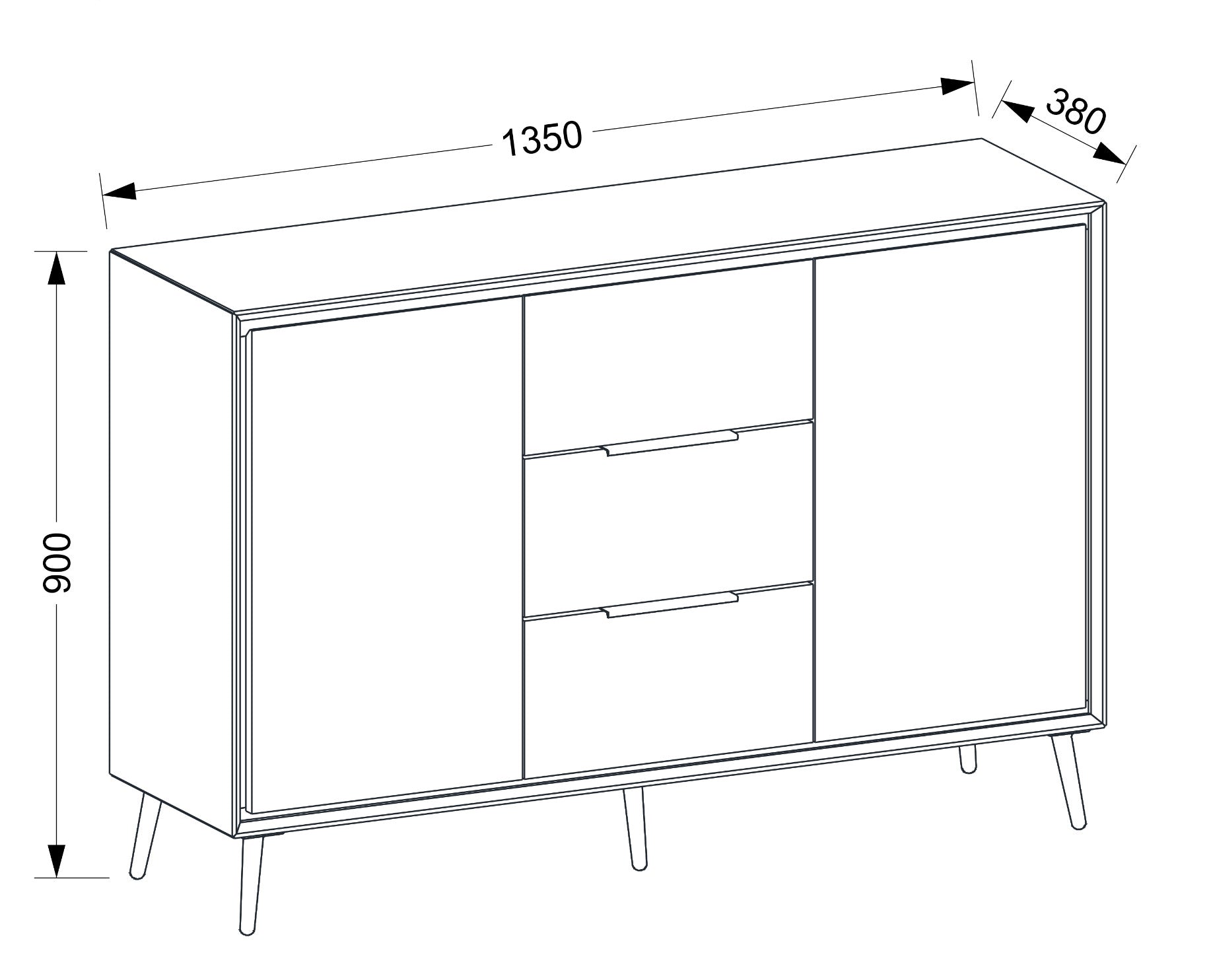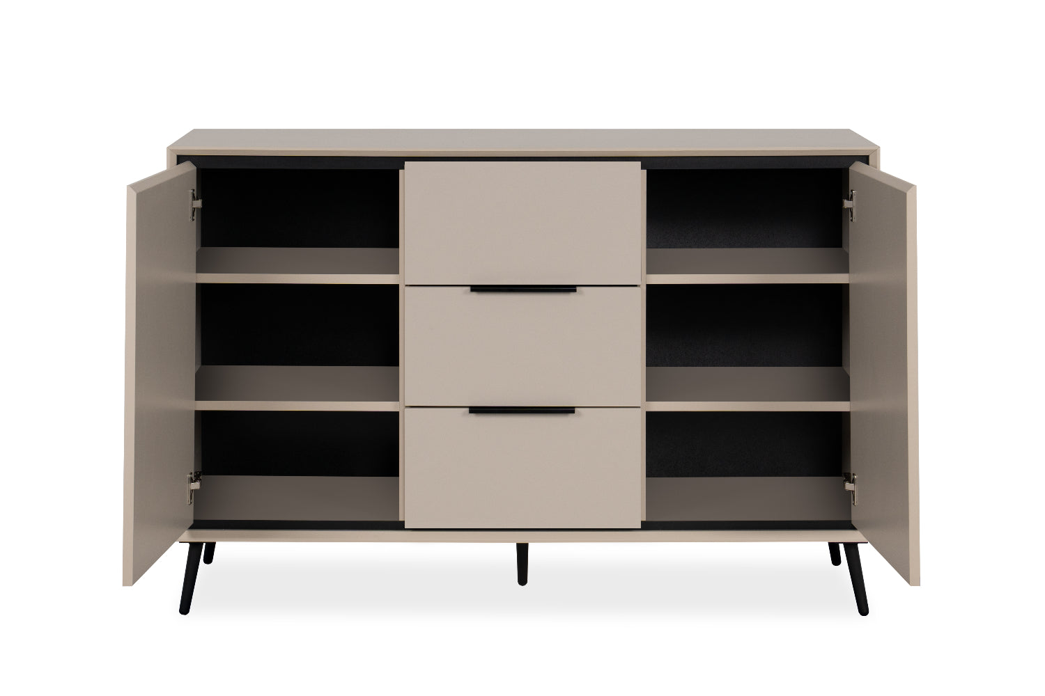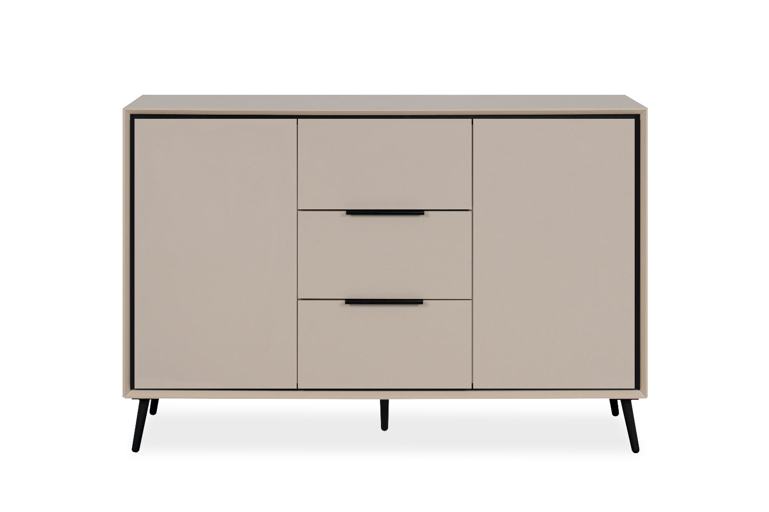 Links und rechts durchgehende Tür, in der Mitte 3 Schubladen. Dekor: Sandfarbig, Füße Schwarz. Griffe: teilweise grifflos oder schwarze Metallgriffe. Softclose-Funktion.