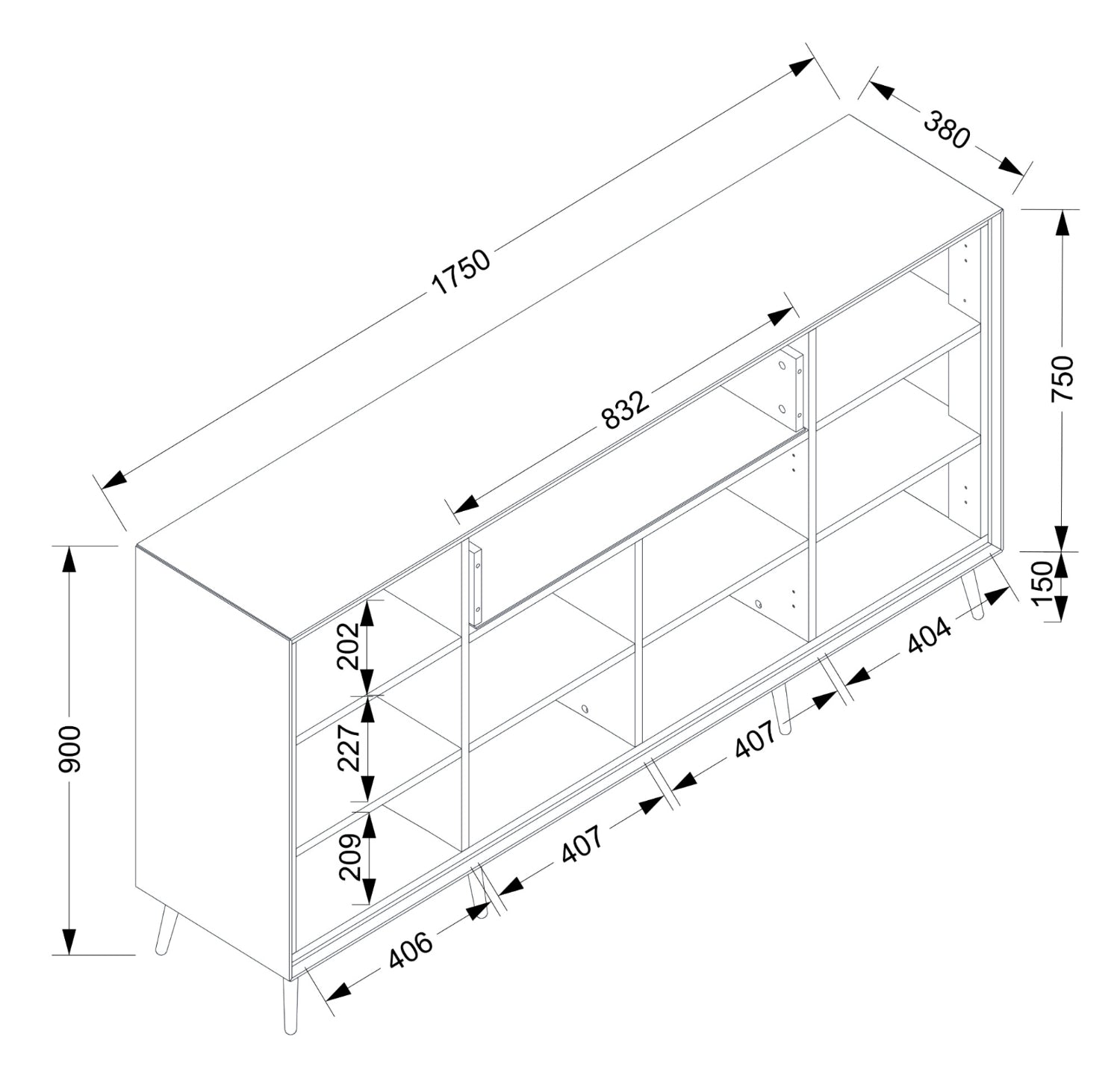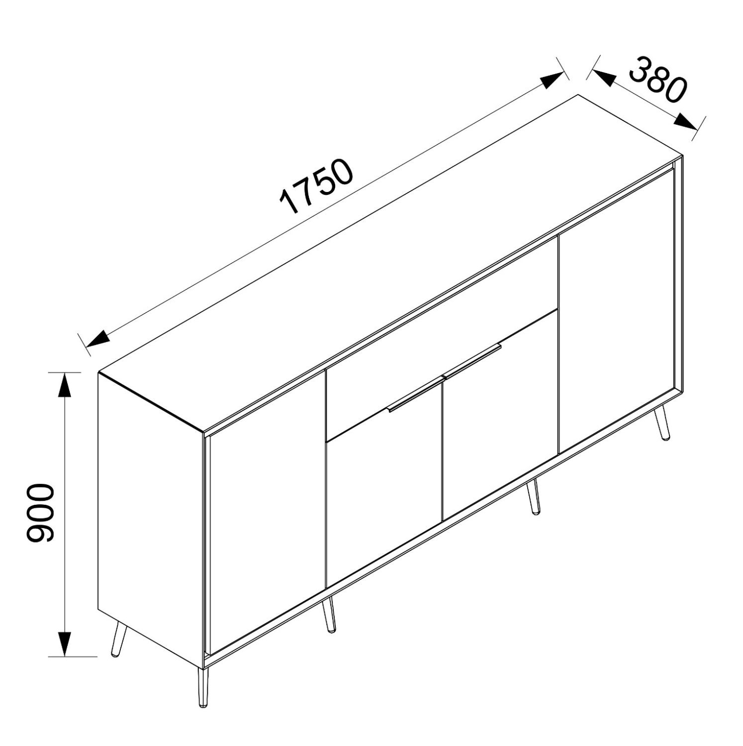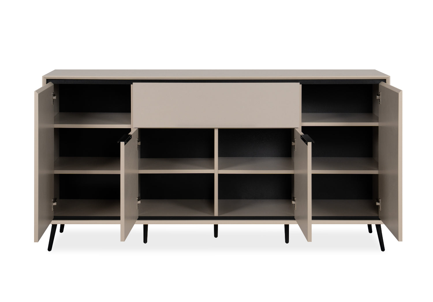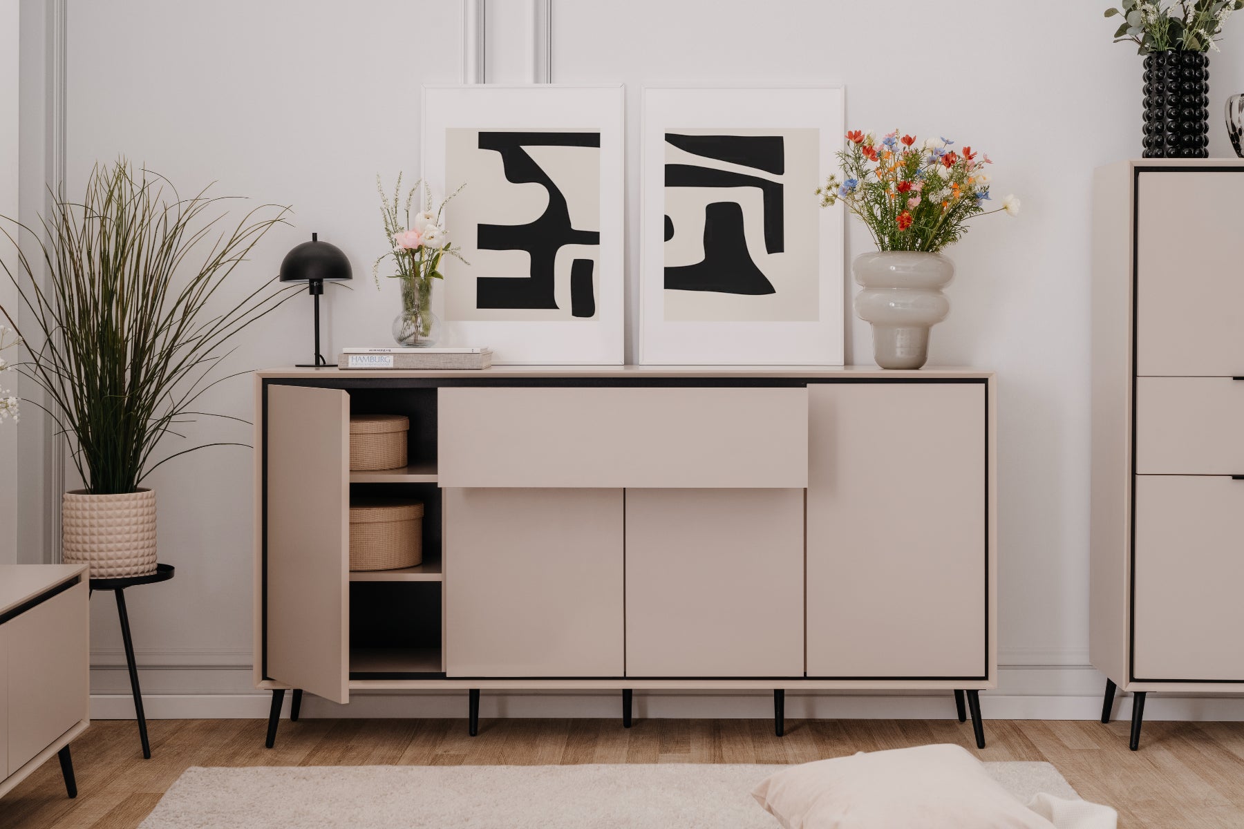 Verleihen Sie Ihrem Raum mit der Finori Sideboard Arona in exquisitem Sand/Schwarz einen eleganten Touch. Die moderne, grifflose Gestaltung mit Schrägkante verleiht Ihrem Zuhause eine anspruchsvolle Note. Mit der softclose Funktion schließen die Türen sanft und leise, für ein luxuriöses Gefühl bei jeder Nutzung. Die Maße betragen ca. B/H/T 175 x 90 x 38 cm.