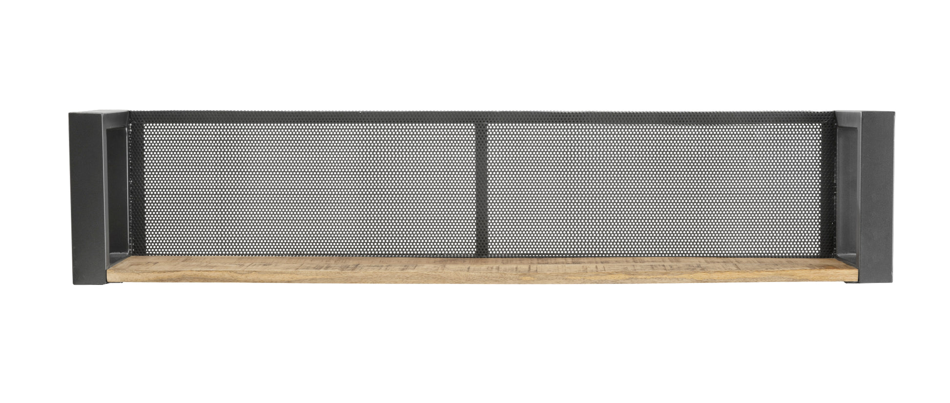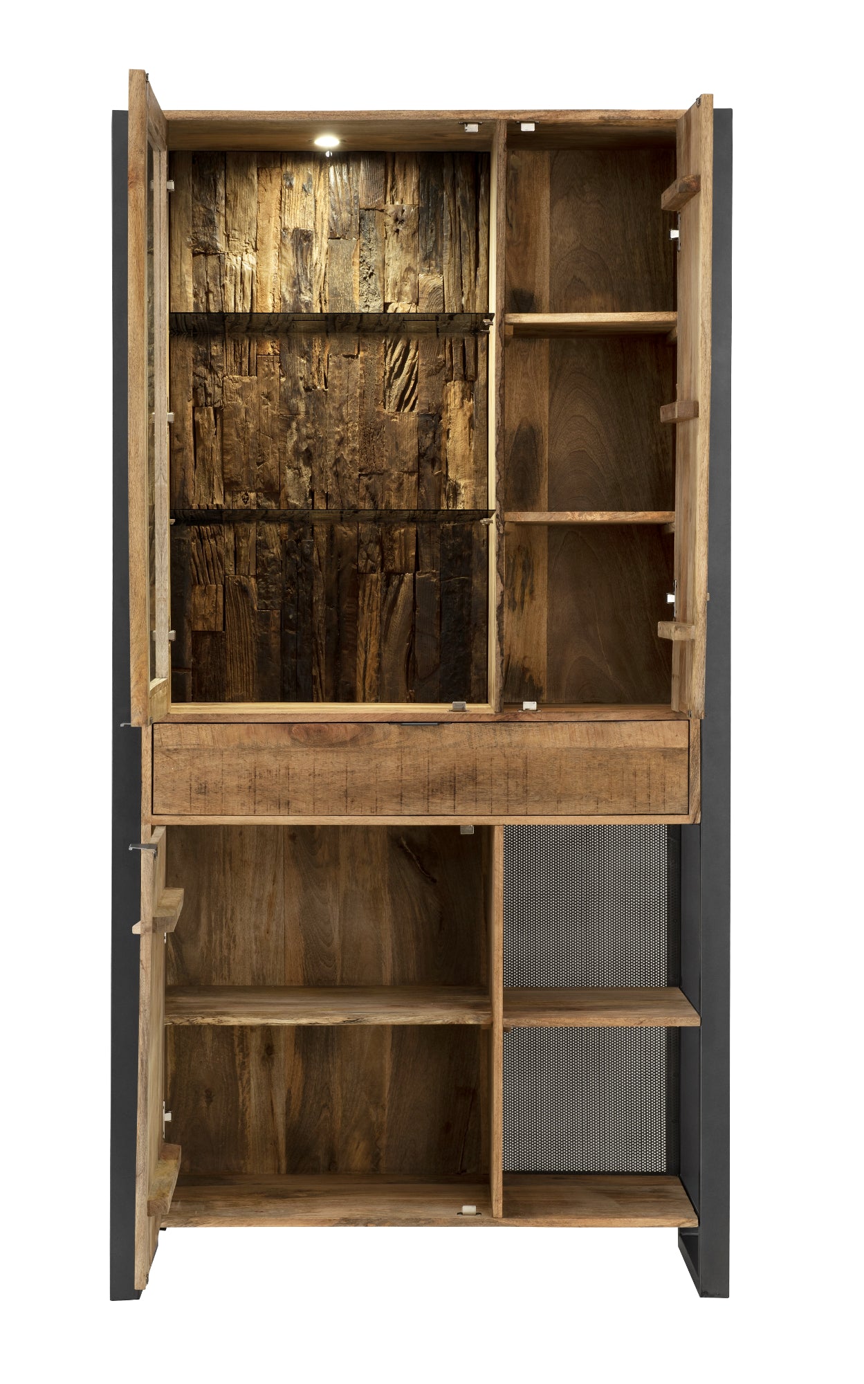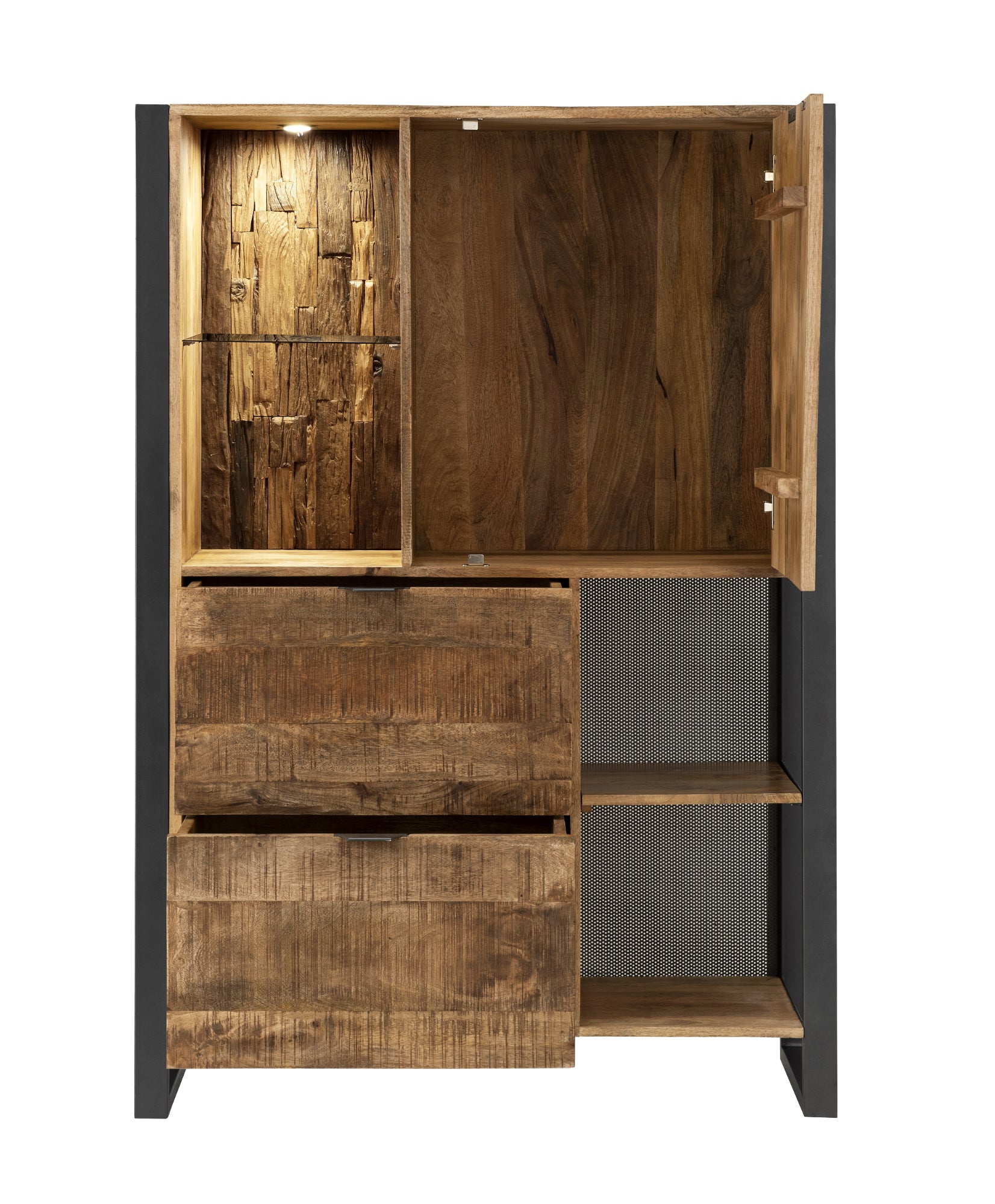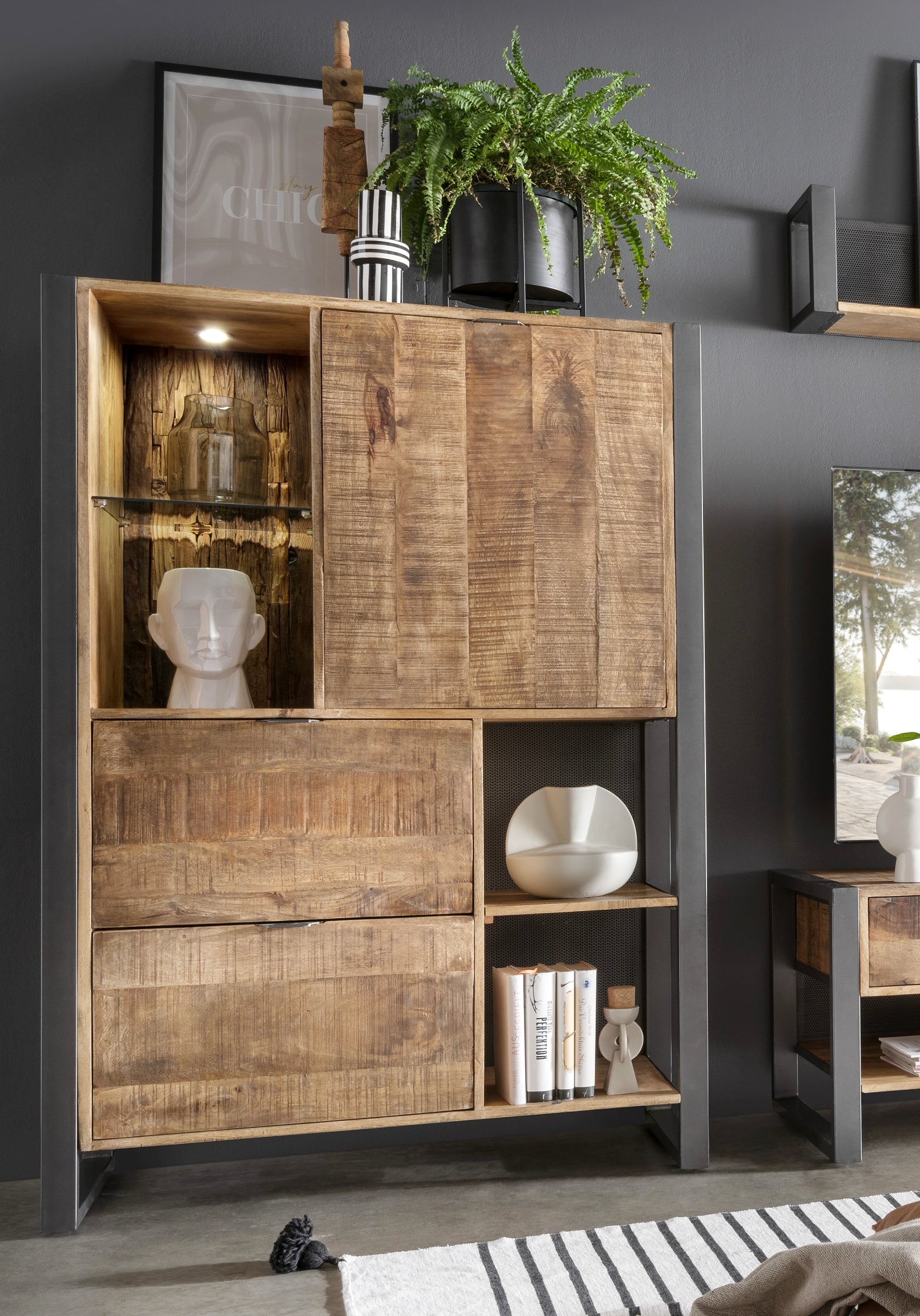 Wohnzimmer-Set inkl. Beleuchtung. Dekor aus massivem recyceltem Mangoholz multifarbig, Eisen-Lochblech-Rückwand, Metallrahmen anthrazit. Besteht aus: Highboard BxHxT (ca. 104x150x42) cm, TV-Lowboard BxHxT (ca. 129x49x49) cm, Wandregal BxHxT (ca. 119x25x20) cm, Vitrine BxHxT (ca. 104x200x42) cm.