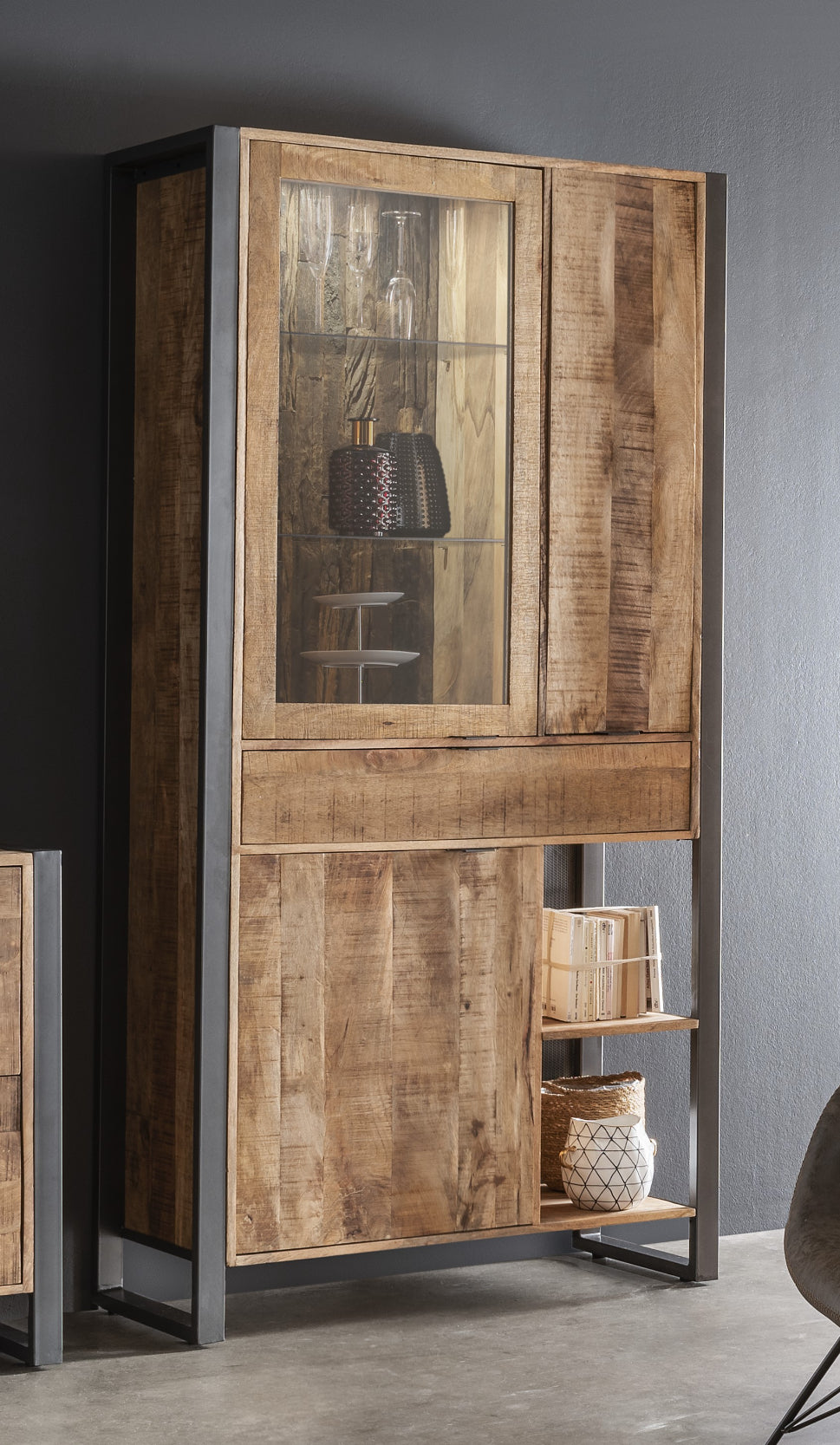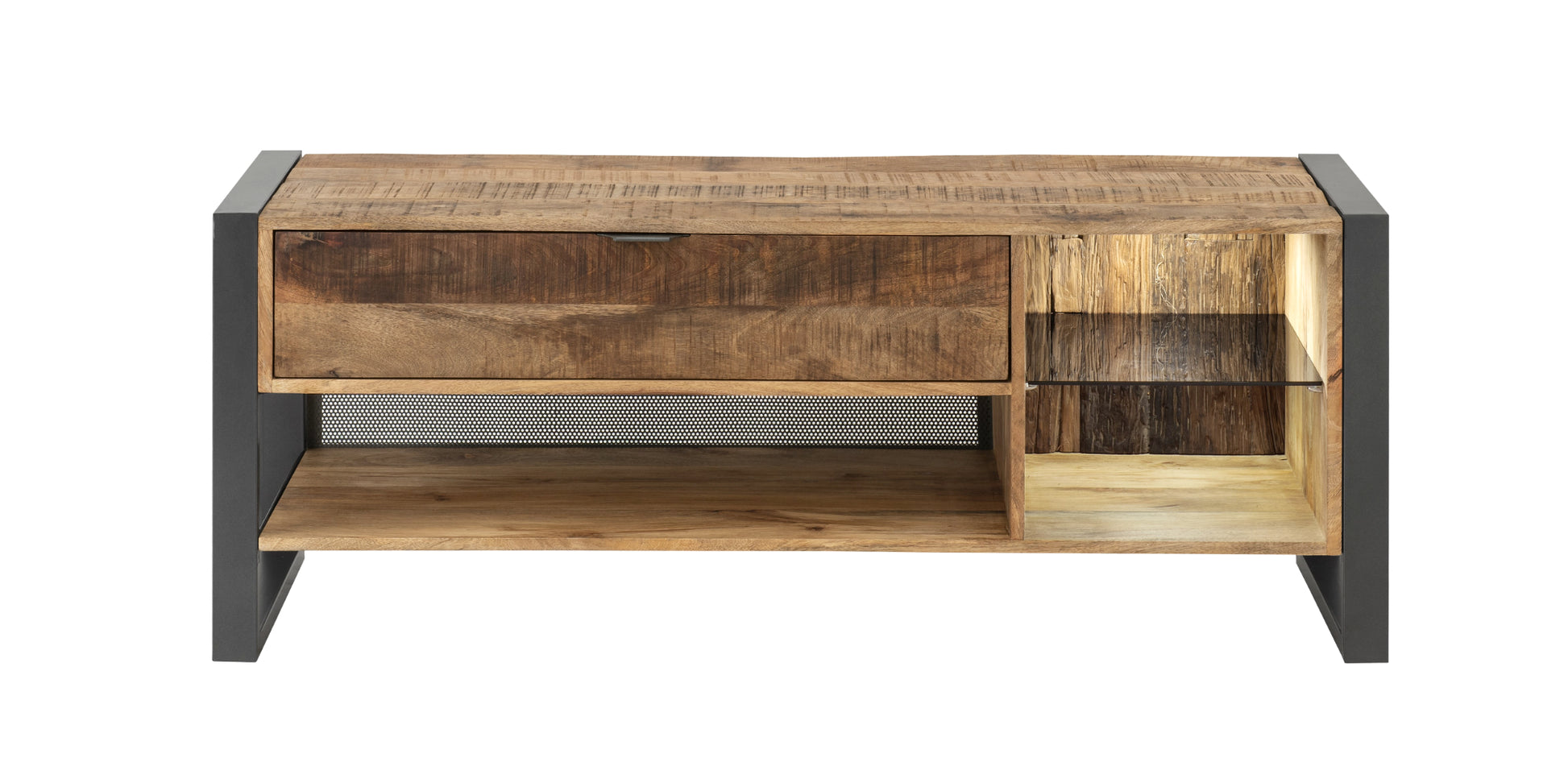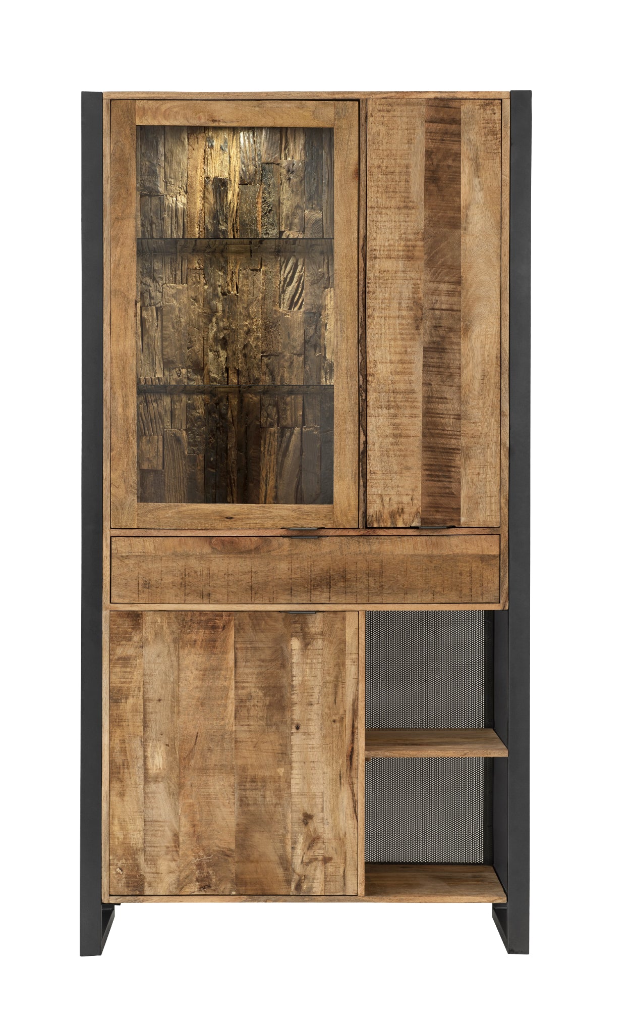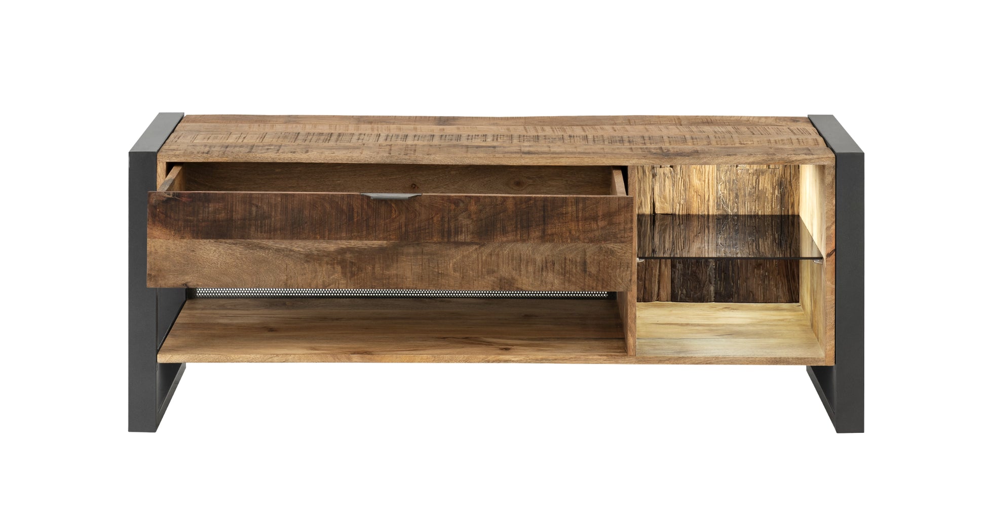 Wohnzimmer-Set inkl. Beleuchtung. Dekor aus massivem recyceltem Mangoholz multifarbig, Eisen-Lochblech-Rückwand, Metallrahmen anthrazit. Besteht aus: Highboard BxHxT (ca. 104x150x42) cm, TV-Lowboard BxHxT (ca. 129x49x49) cm, Wandregal BxHxT (ca. 119x25x20) cm, Vitrine BxHxT (ca. 104x200x42) cm.