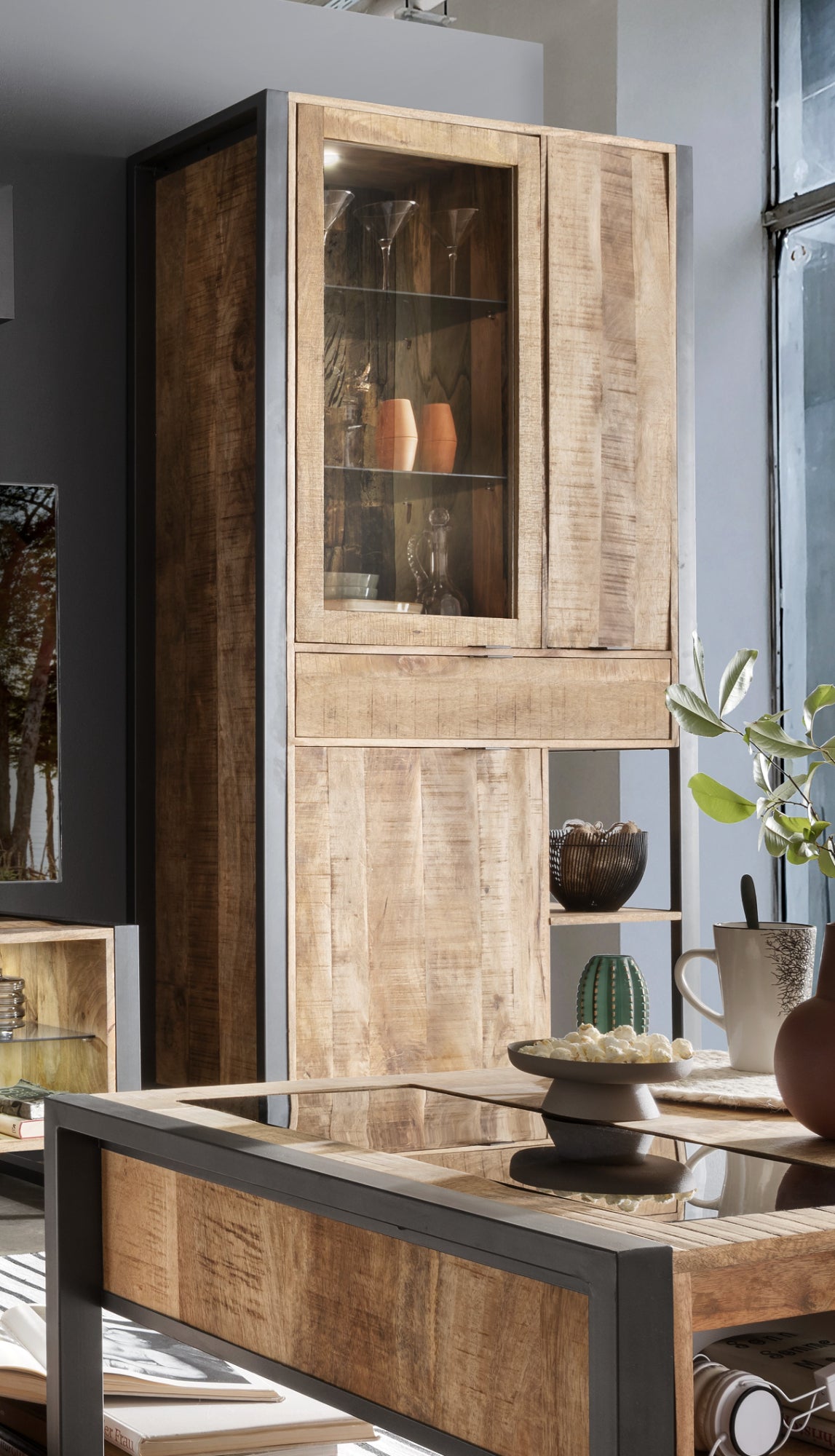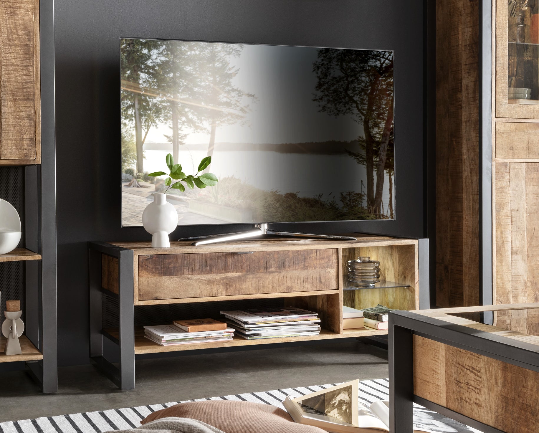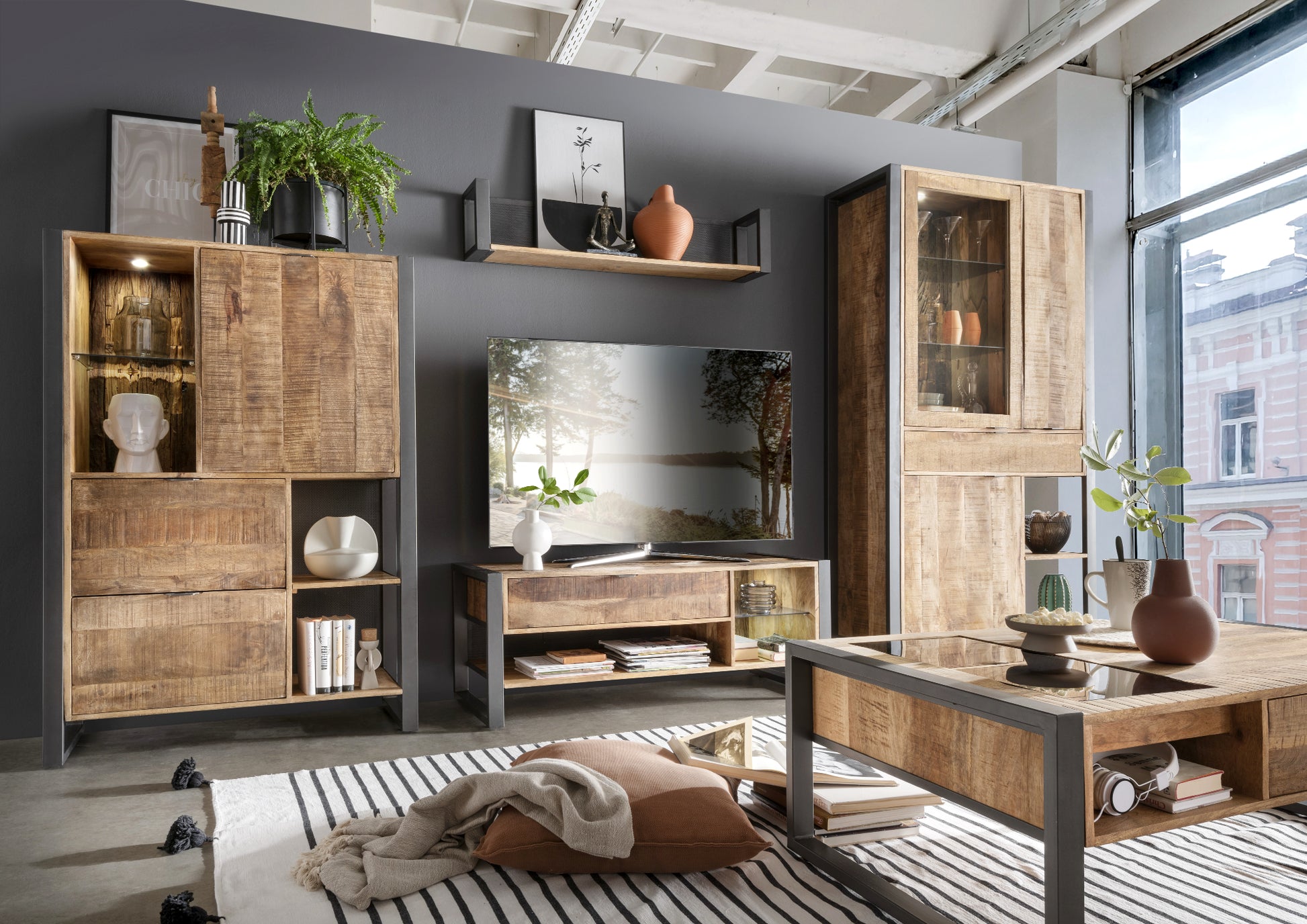 Vervollständigen Sie Ihr Wohnzimmer mit dem exklusiven 4-teiligen Wohnzimmer-Set Cayro aus massivem Mangoholz - eine seltene Schönheit. Der anthrazitfarbene Metallrahmen und die integrierte Beleuchtung verleihen dem Set eine moderne, edle Note. Mit Highboard, TV-Lowboard, Wandregal und Vitrine bietet es nicht nur Stauraum, sondern auch ein Highlight in jedem Raum. Kostenlose Lieferung und Montage inklusive. Das hochwertige Mangoholz sorgt für eine warme und einladende Atmosphäre. Eine perfekte Ergänzung für jeden Wohnraum. Erleben Sie zeitlose Eleganz und unvergleichlichen Komfort in Ihrem Zuhause.