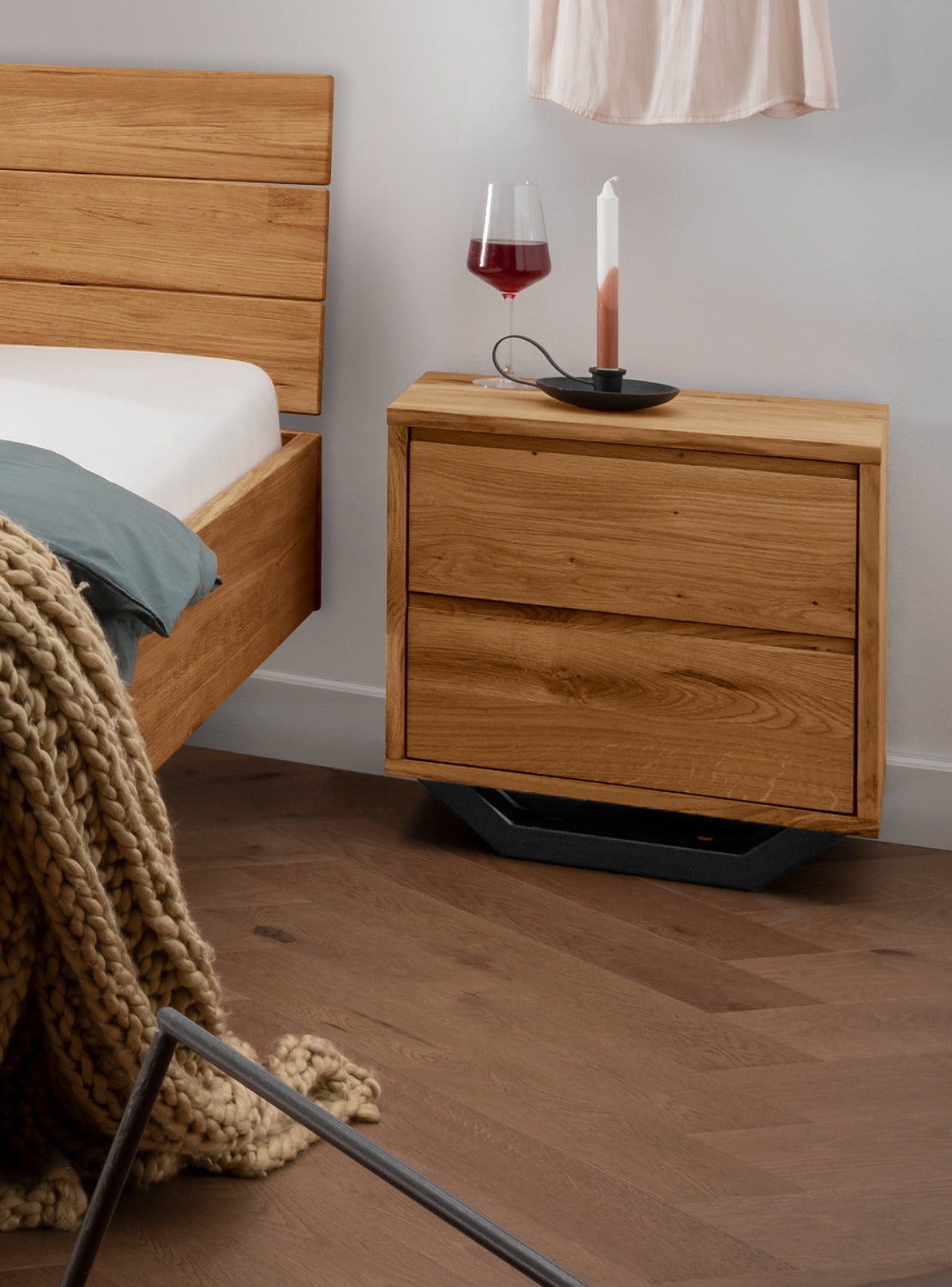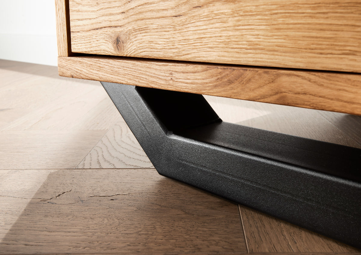 Wildeiche massiv Natur, 2 Schubladen mit Softclose-Funktion, Metallkufen schwarzgrau. Lieferzeit ca. 5-8 Wochen.