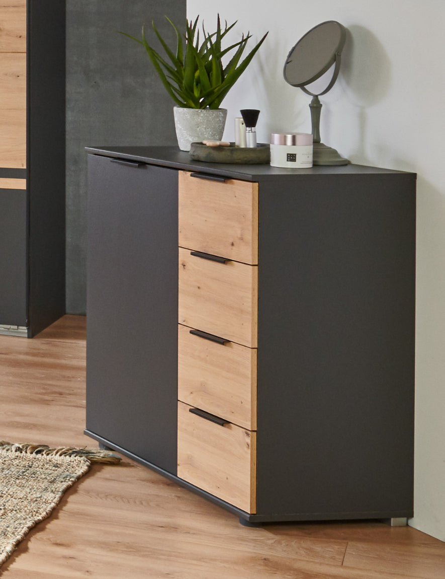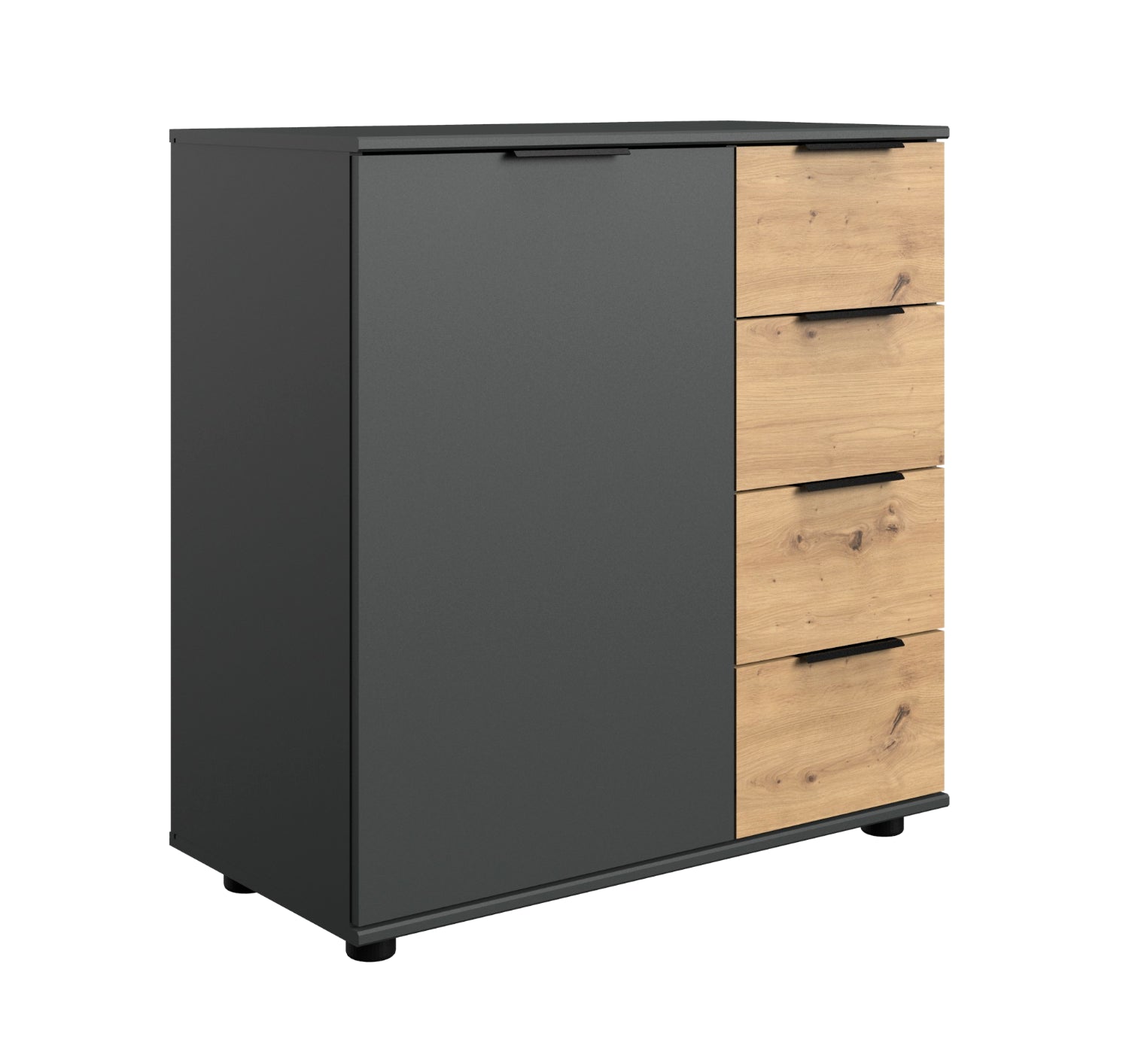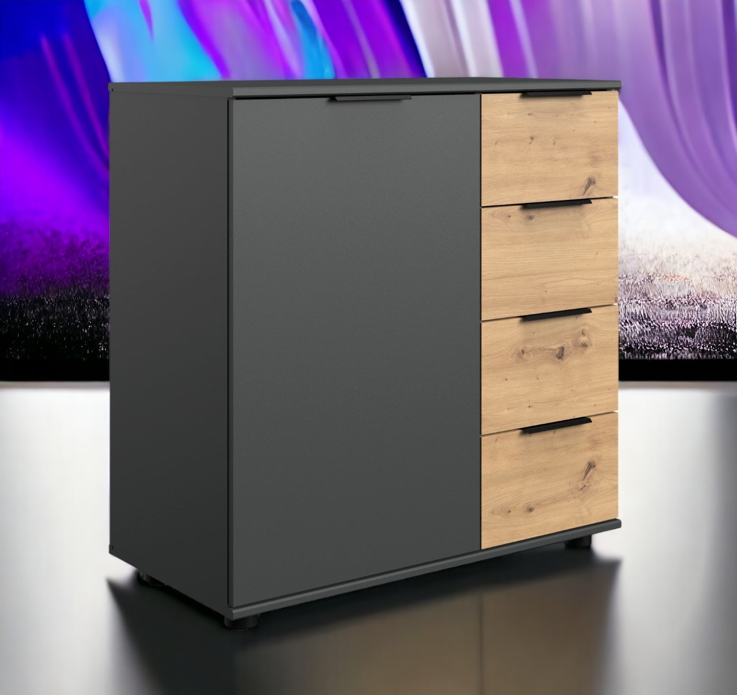 1 Tür links und 4 Schubladen Rechts. Inkl. 2 Einlegeböden. Dekor: Graphit, Abs. Artisan-Eiche-Nachbildung.