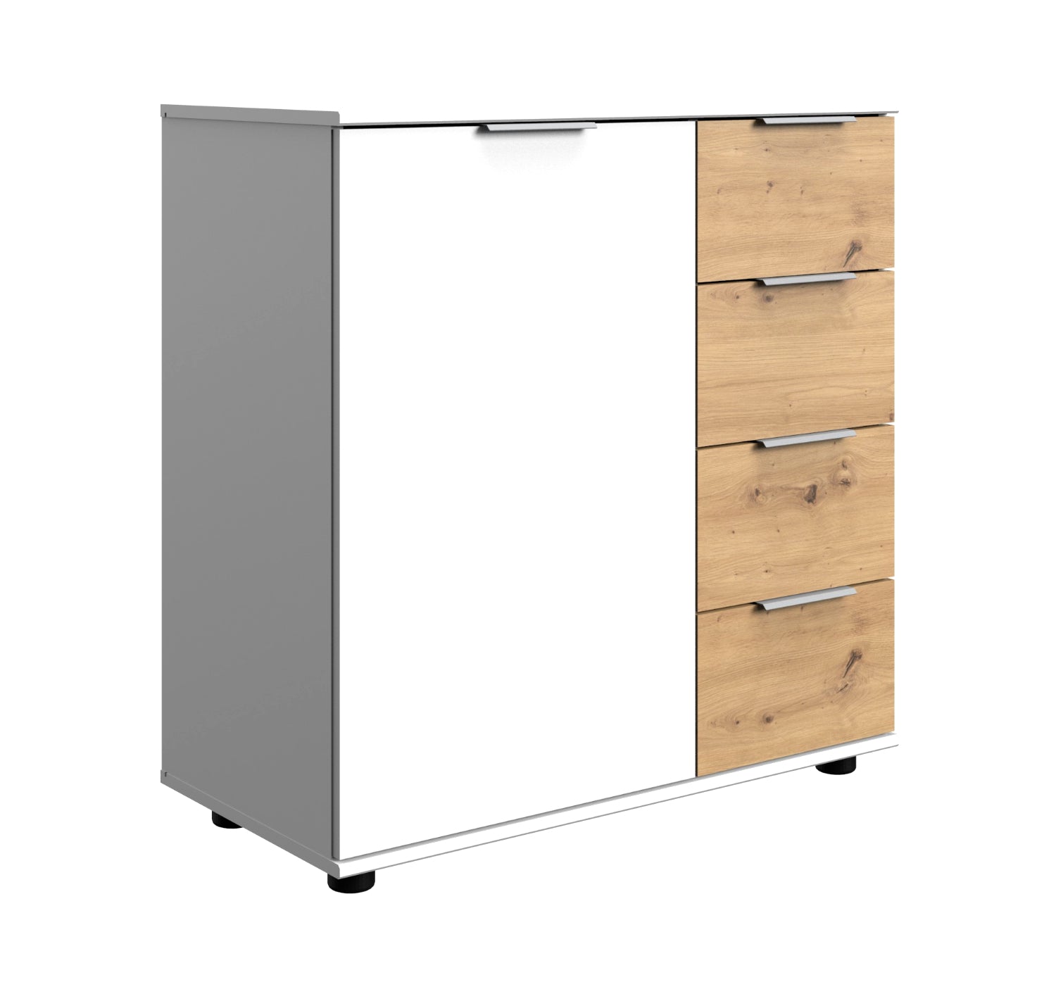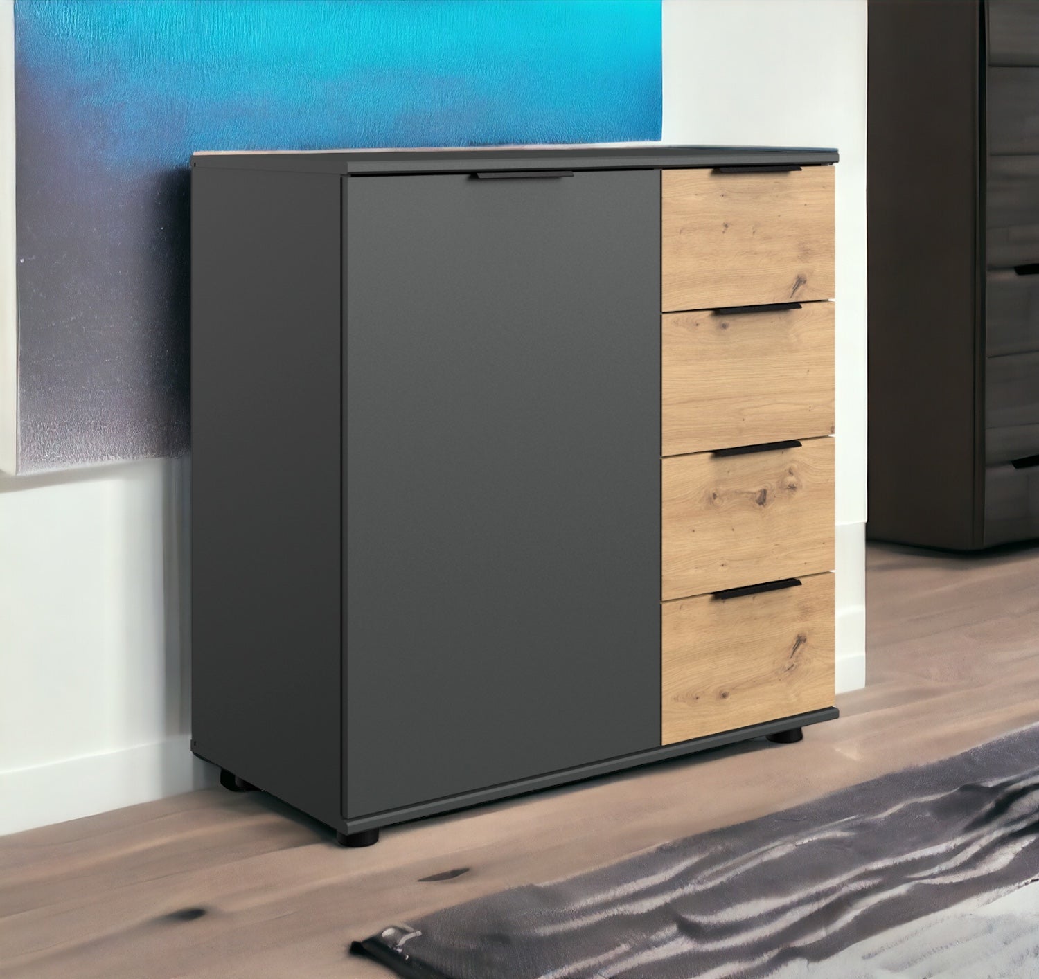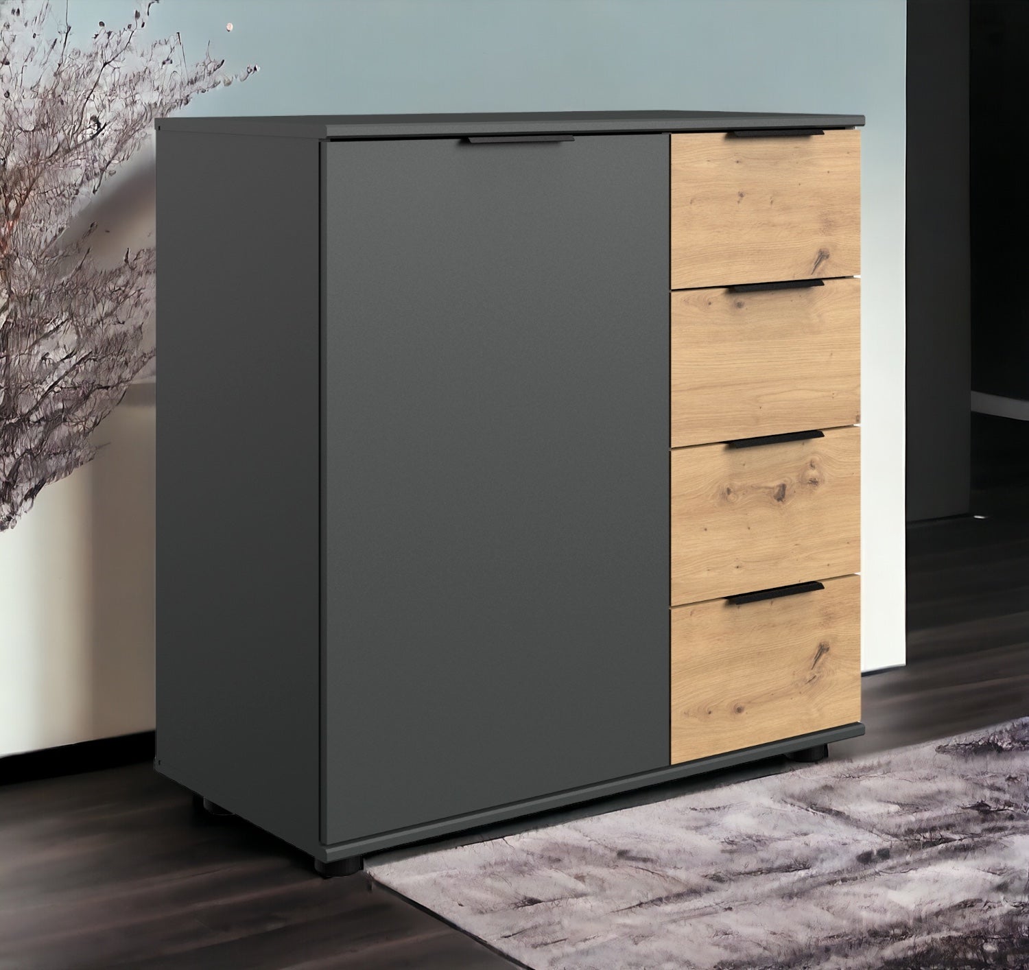 1 Tür links und 4 Schubladen Rechts. Inkl. 2 Einlegeböden. Dekor: Graphit, Abs. Artisan-Eiche-Nachbildung.