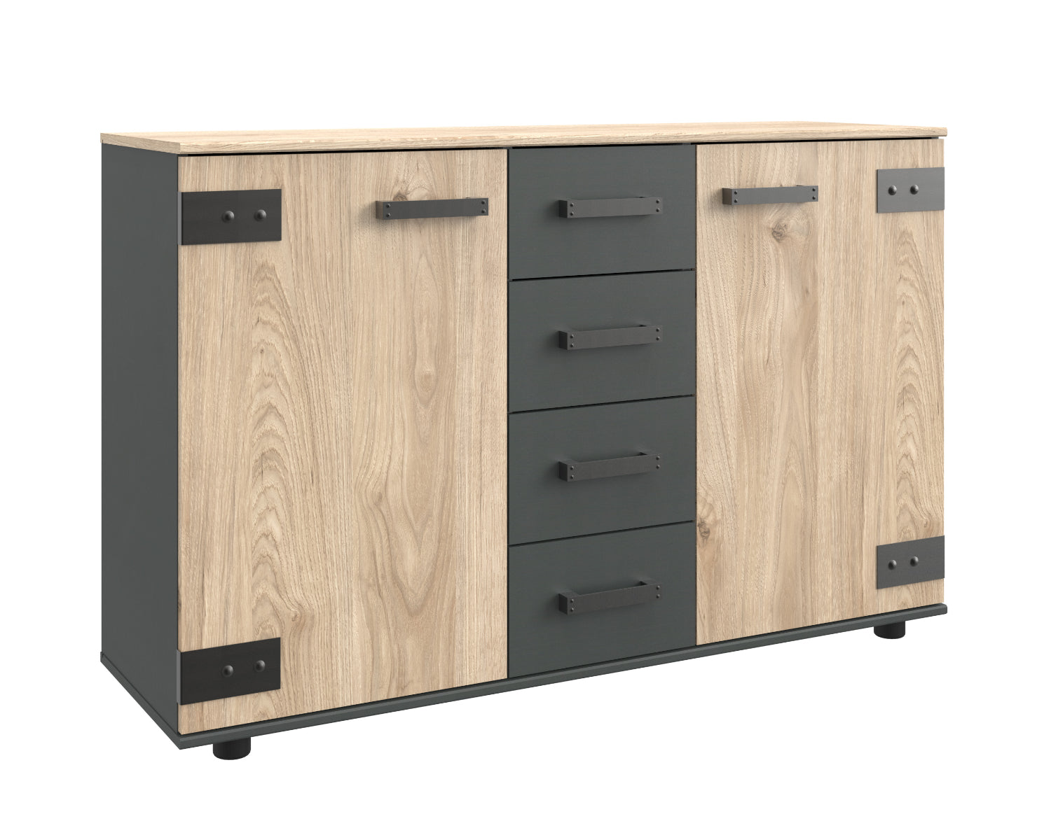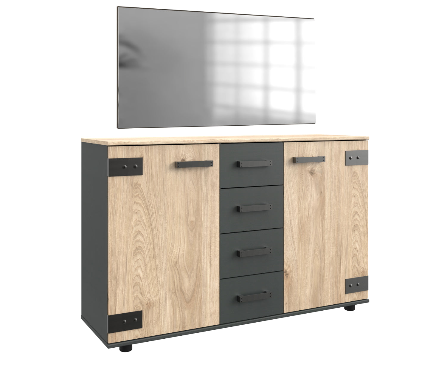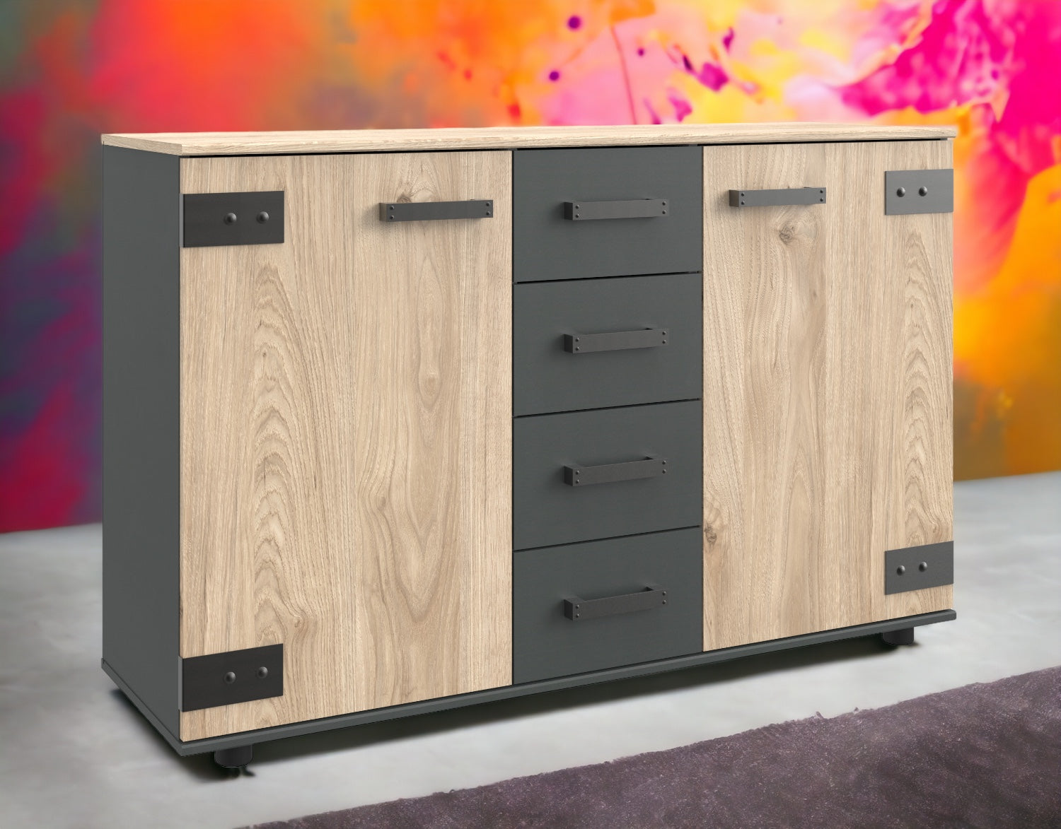Tür links und rechts, in der Mitte 4 Schubladen. Dekor: Korpus Graphit, Front Silver Fir-Nachbildung, Abs. Graphit.
