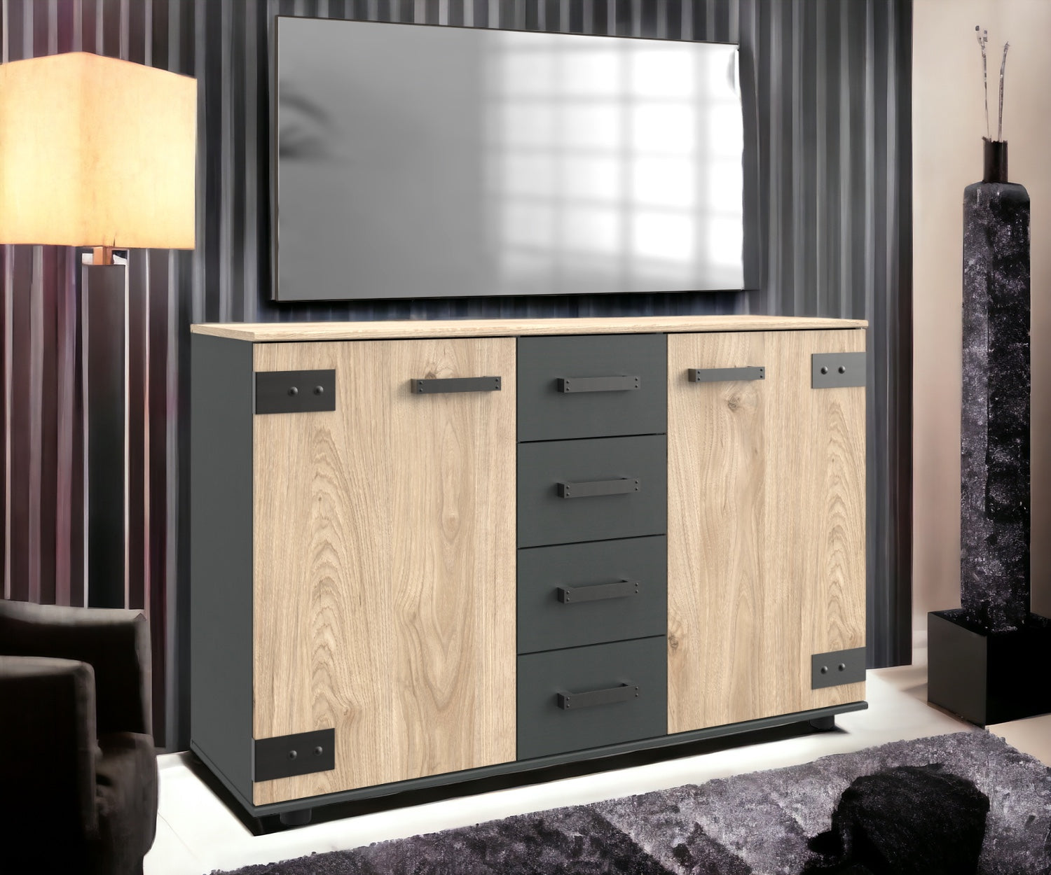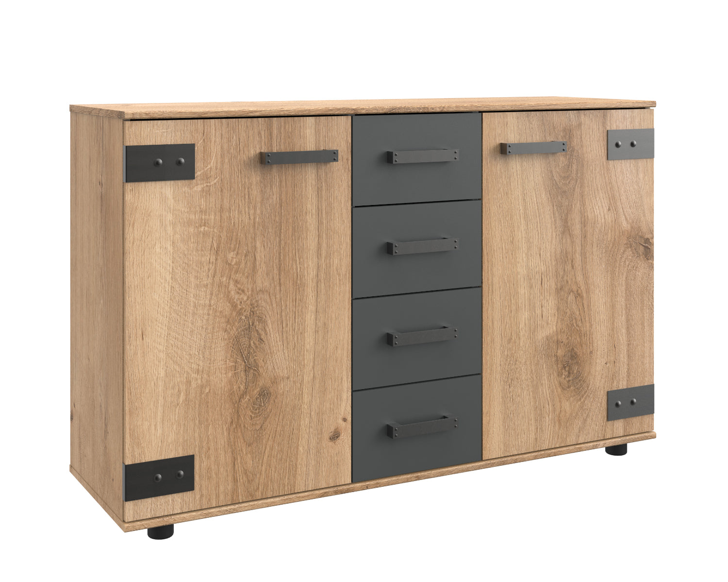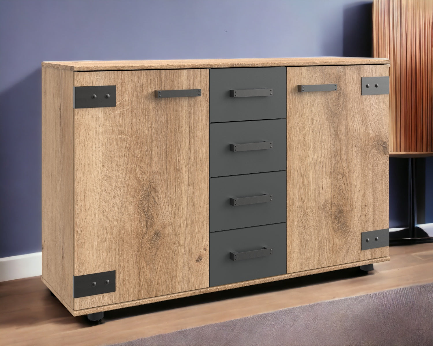 Tür links und rechts, in der Mitte 4 Schubladen. Dekor: Korpus Graphit, Front Silver Fir-Nachbildung, Abs. Graphit.