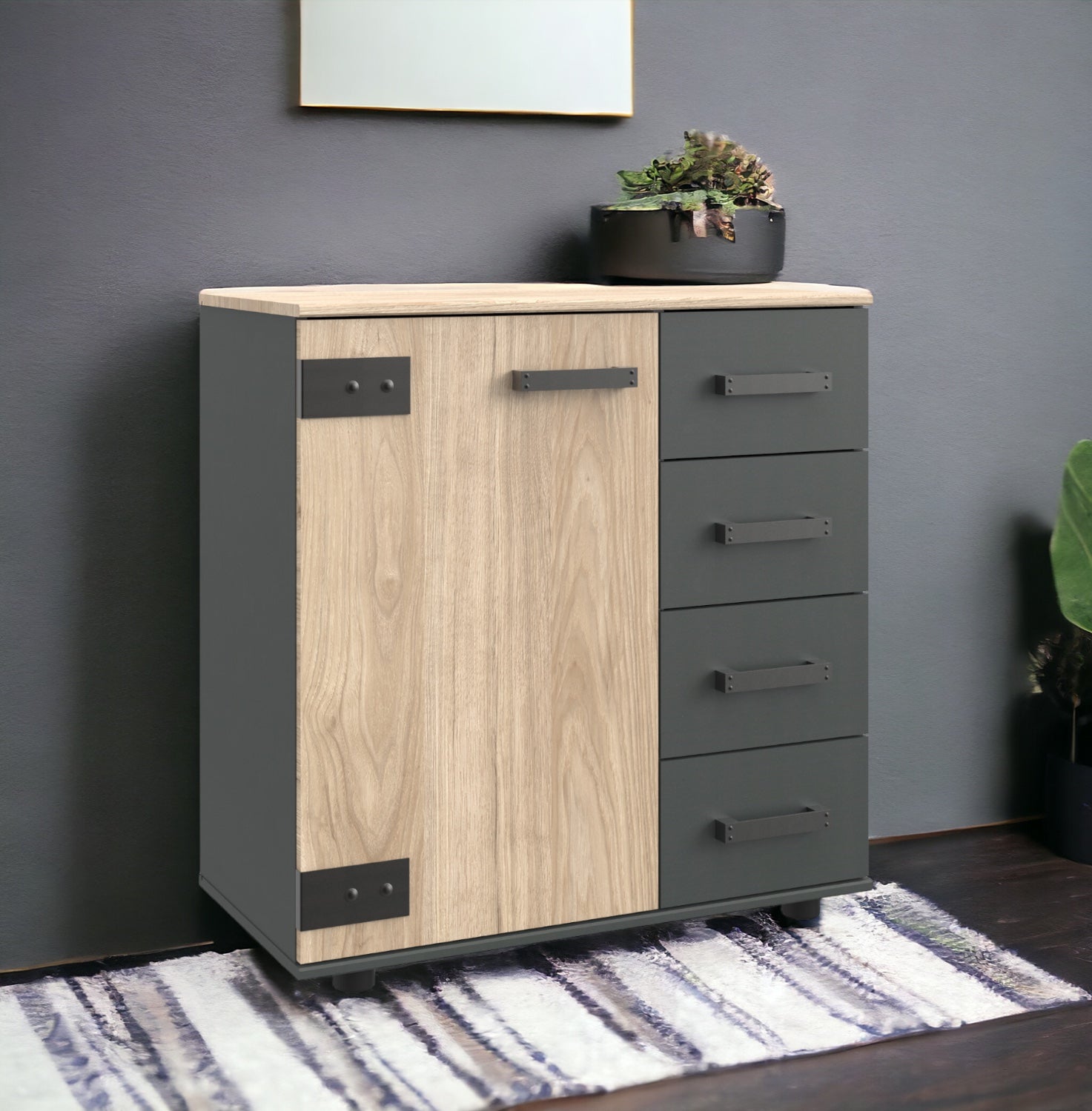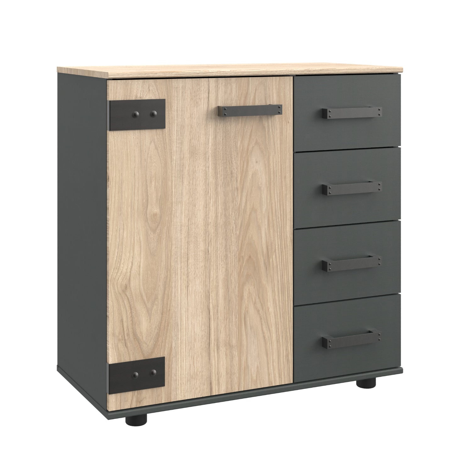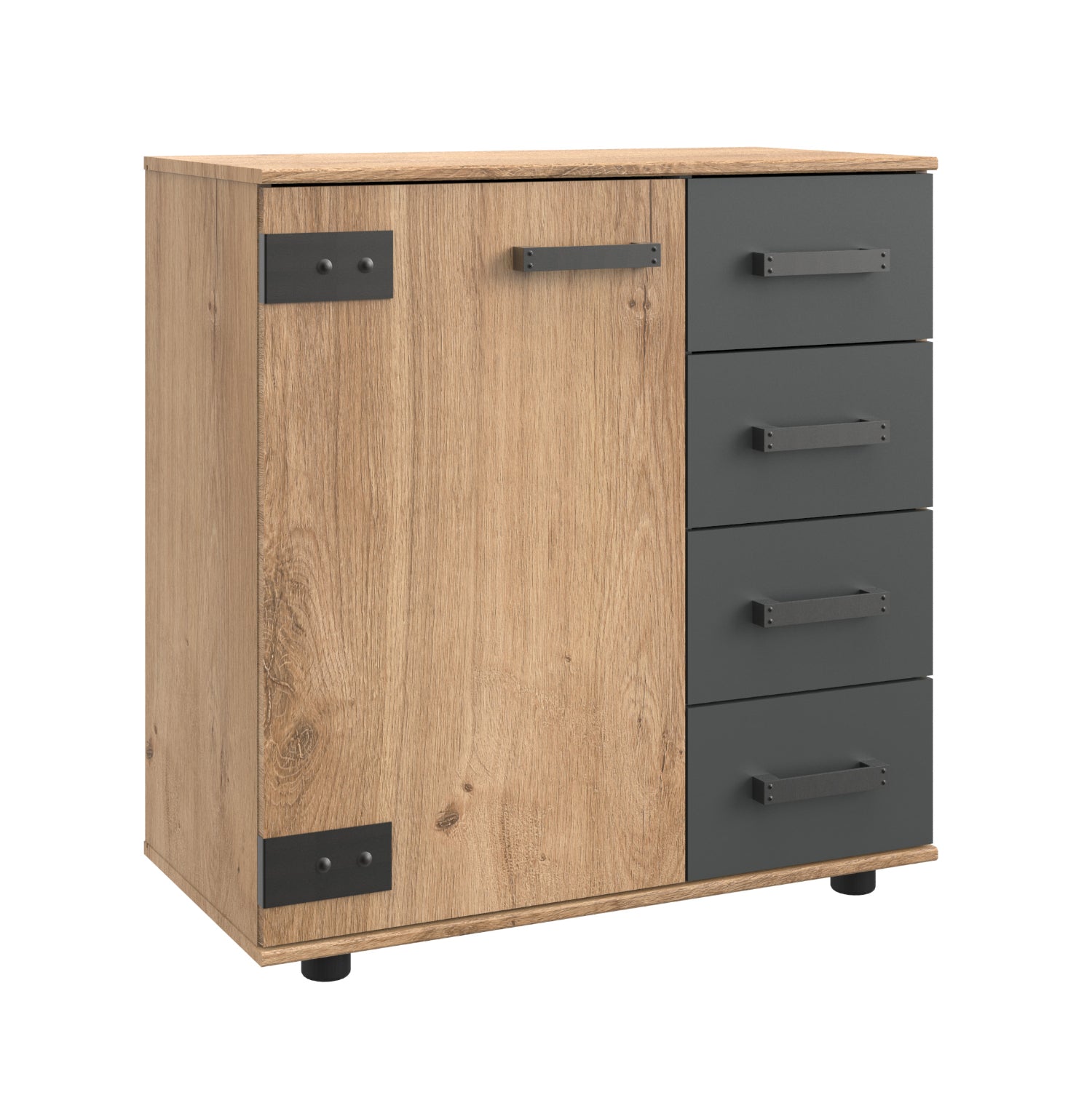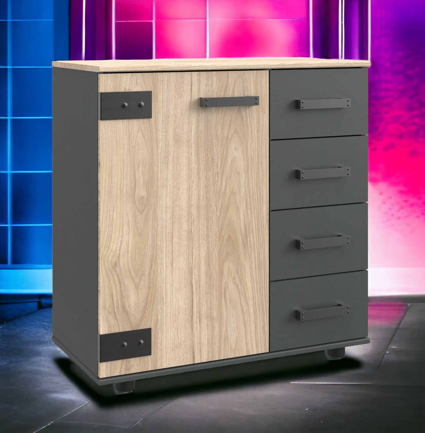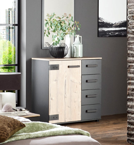 Tür links, 4 Schubladen rechts. Dekor: Korpus Graphit, Front Silver Fir-Nachbildung, Abs. Graphit.