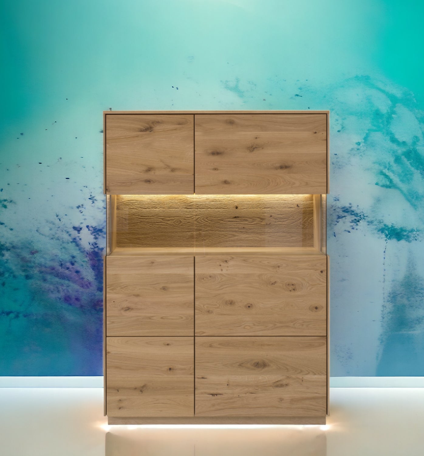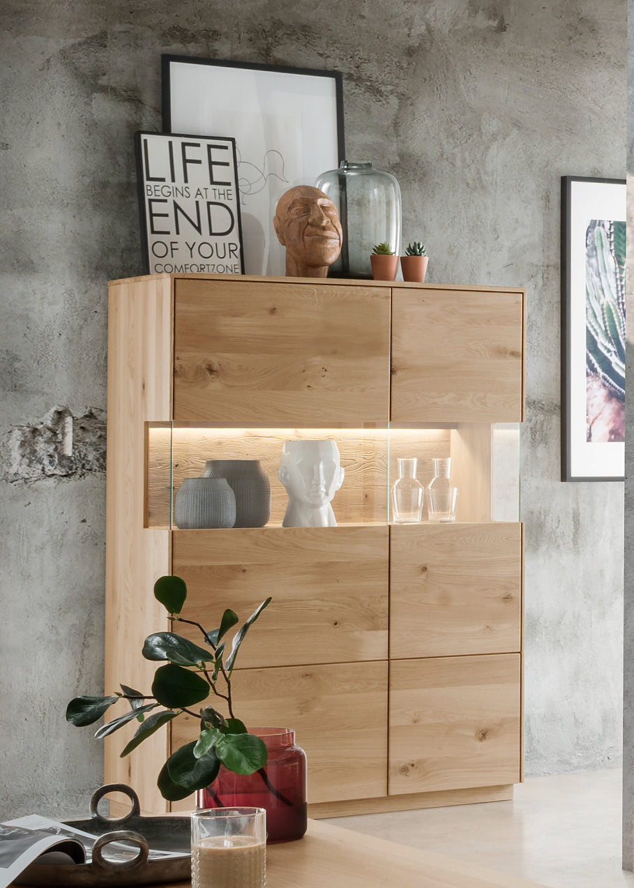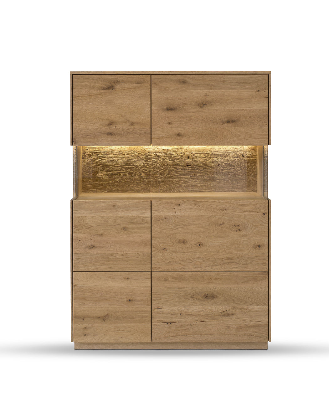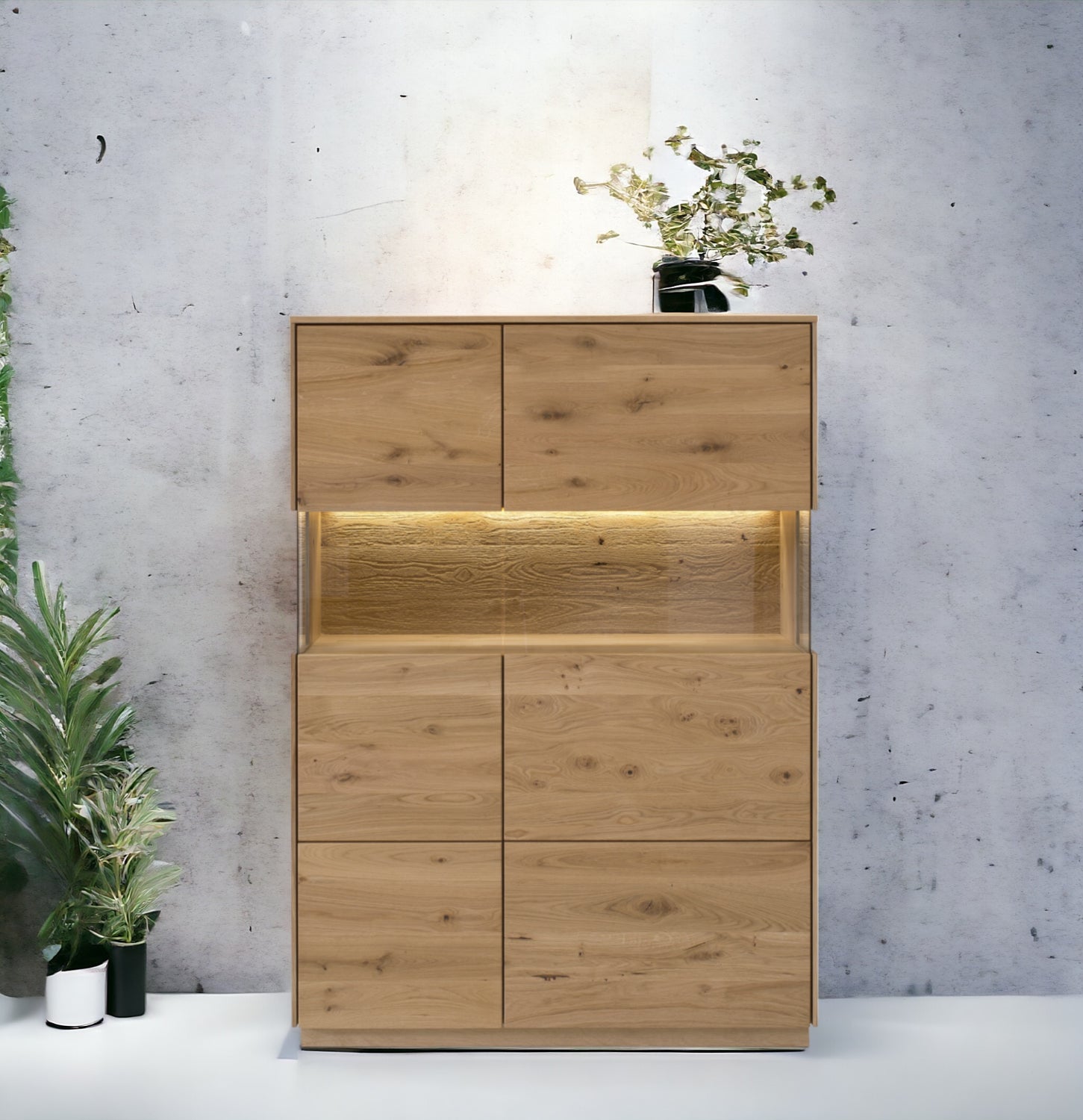 TPT Sankt Gallen Higboard 2-türig mit Glas, Wildeiche massiv inkl. Beleuchtung B/H/T 103 x 145 x 44 cm