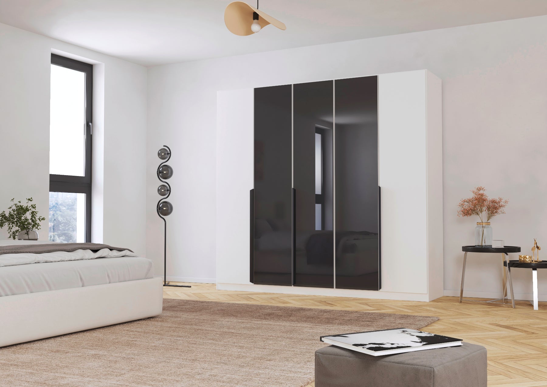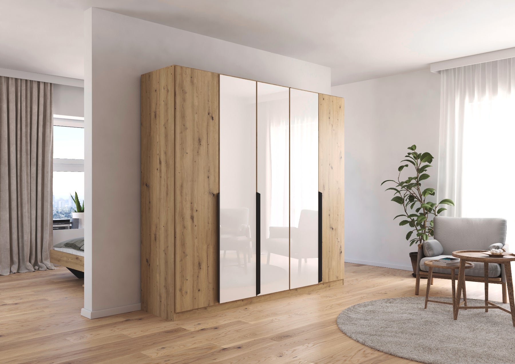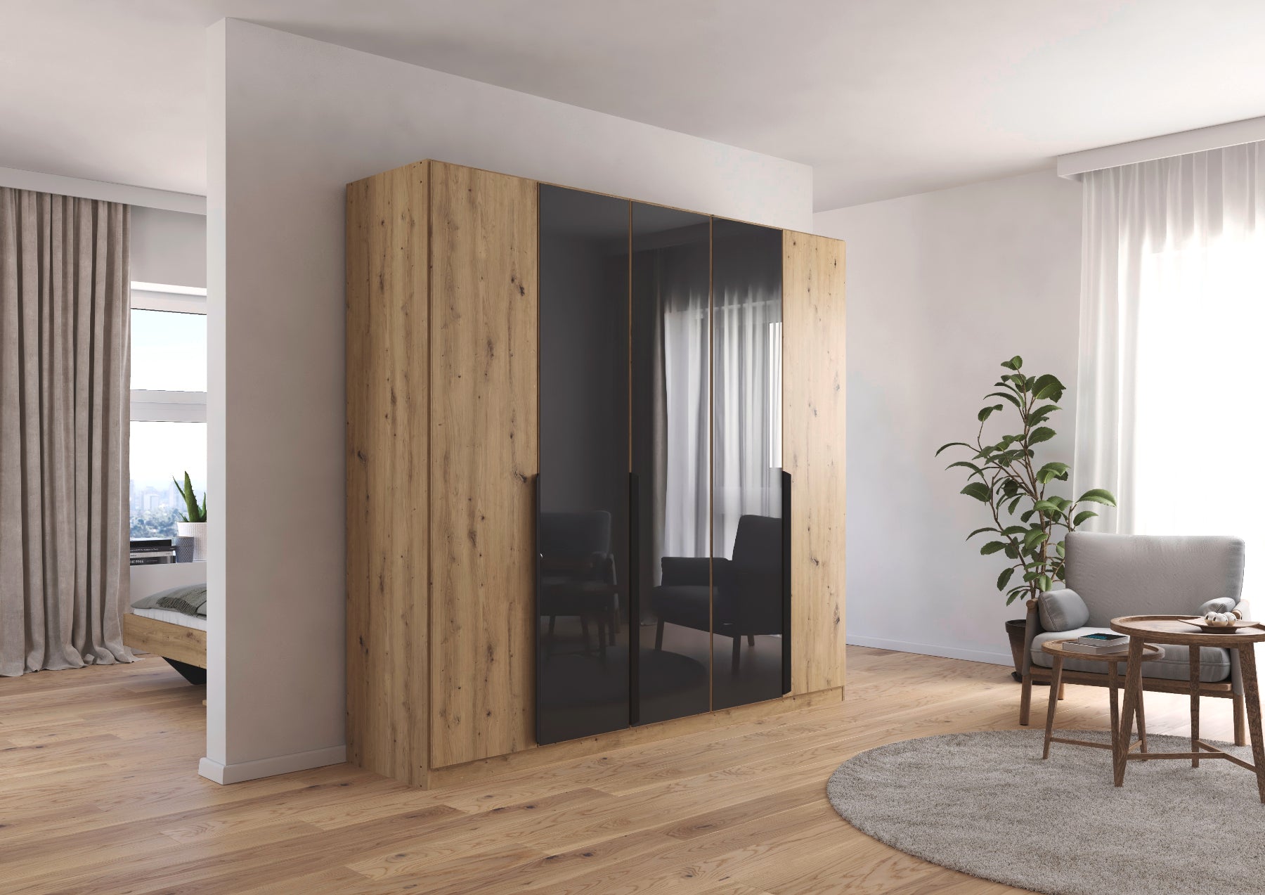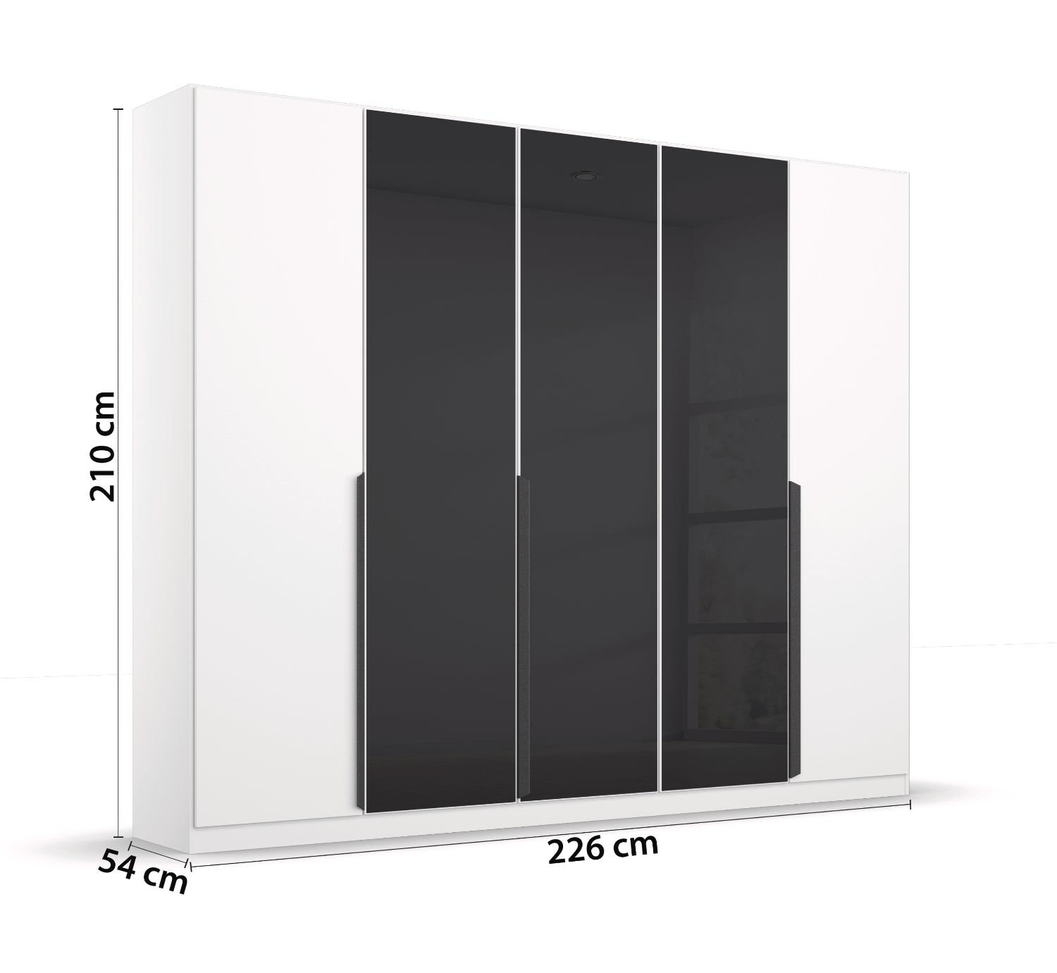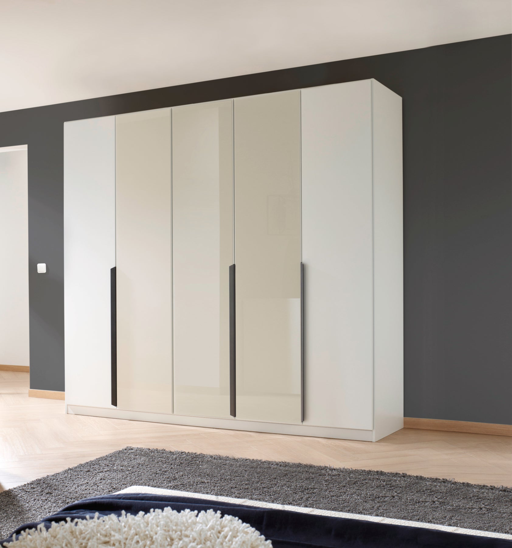 Entdecken Sie den modernen und praktischen Rauch Drehtürenschrank Artemis! Mit seinen 5 Türen und 3 Farbglastüren bietet er viel Stauraum und bringt gleichzeitig einen Hauch von Eleganz in Ihr Zuhause. Verbinden Sie Funktionalität mit stilvollem Design in den Maßen 225 x 210 x 54 cm.