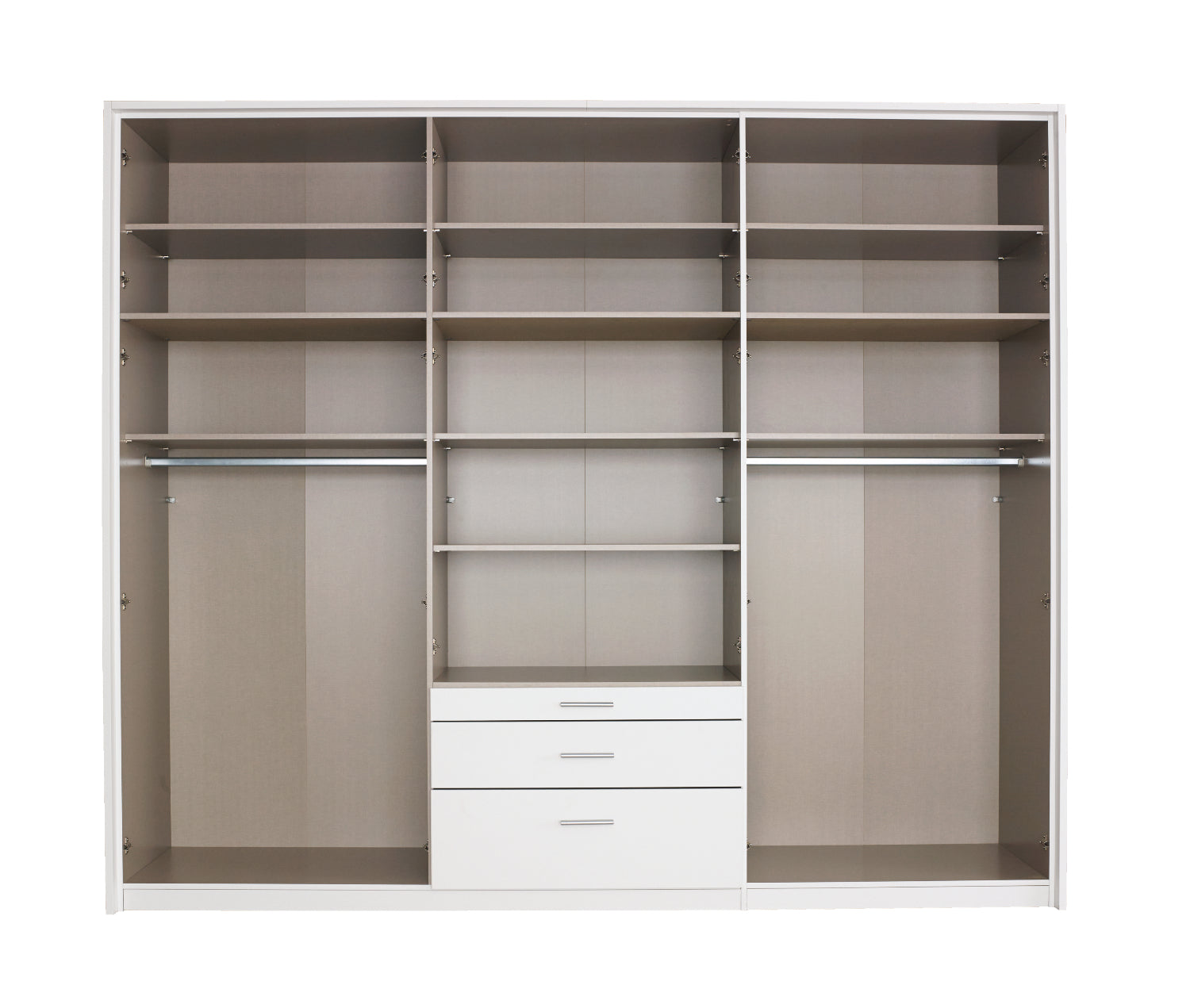 3 Abteilungen inkl. Seiten ca. 90/90/90 cm, 10 Einlegeböden und 2 Kleiderstangen, 3 Schubkästen, inkl. Inneneinteilung in oberer Schubkasten. Korpus Alpinweiß, Front Alpinweiß, Schubladen Alpinweiß. Lieferzeit ca. 4-6 Wochen.