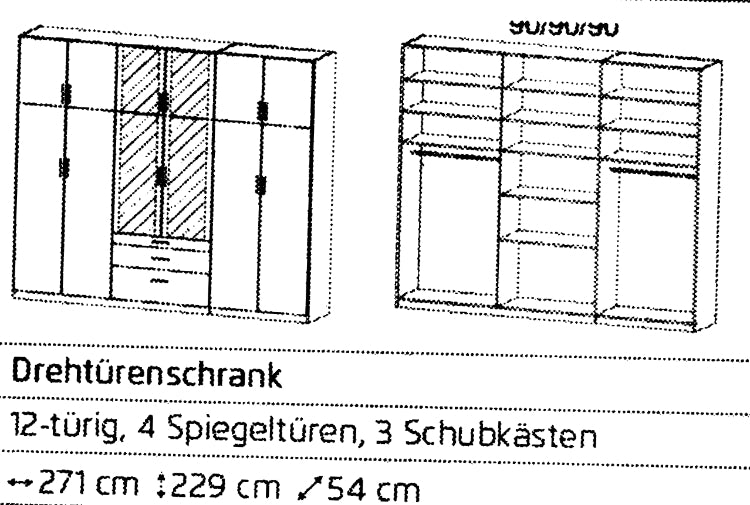 Drehtürenschrank Hildesheim 12-türig mit 4 Spiegeltüren und 3 Schubladen B/H/T ca. 270 x 230 x 54 cm