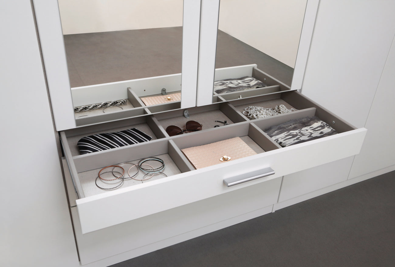 3 Abteilungen inkl. Seiten ca. 45/90/45 cm, 10 Einlegeböden und 2 Kleiderstangen, 3 Schubkästen, inkl. Inneneinteilung in oberer Schubkasten. Korpus Alpinweiß, Front Alpinweiß, Schubladen Alpinweiß. Lieferzeit ca. 4-6 Wochen.
