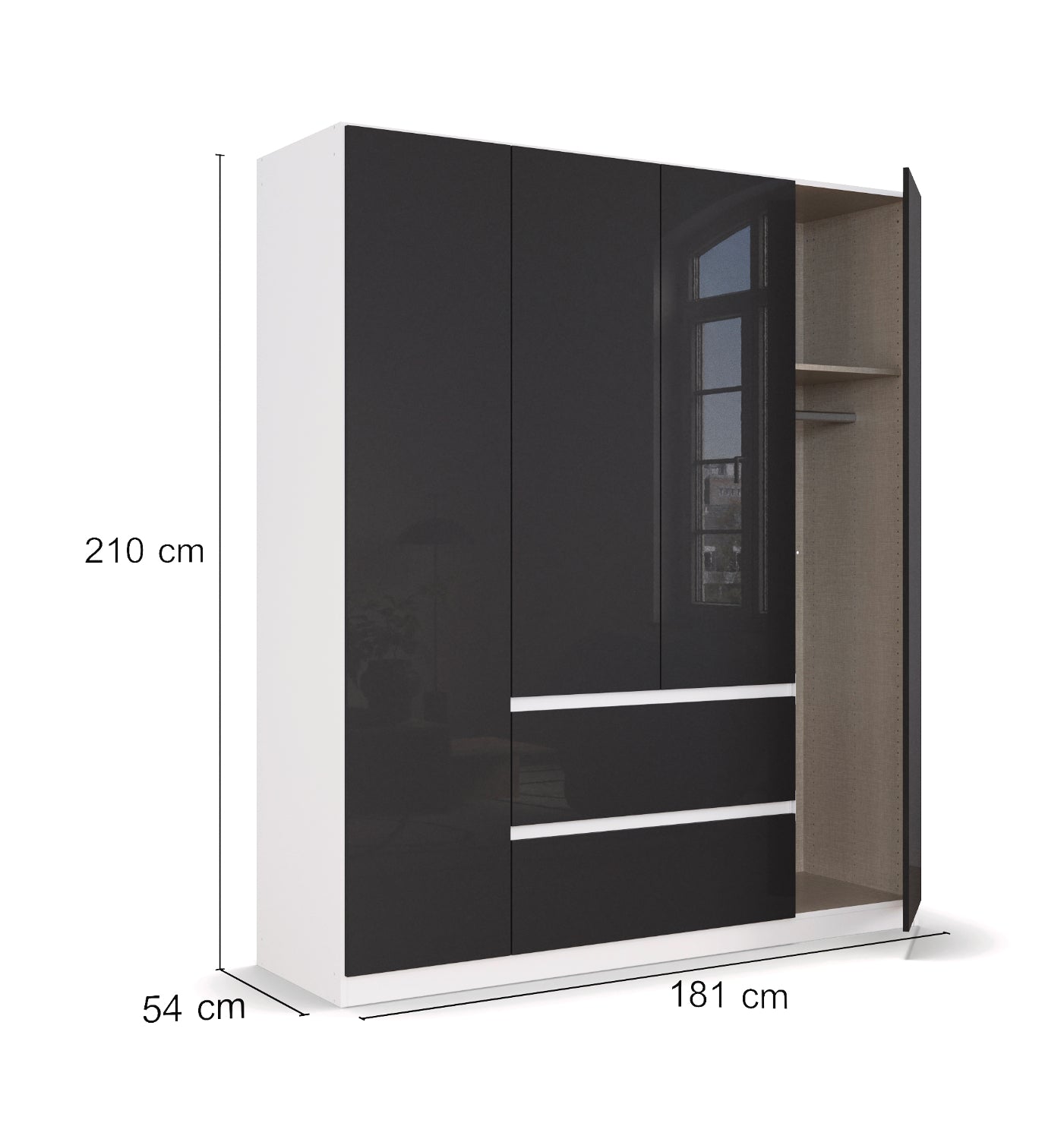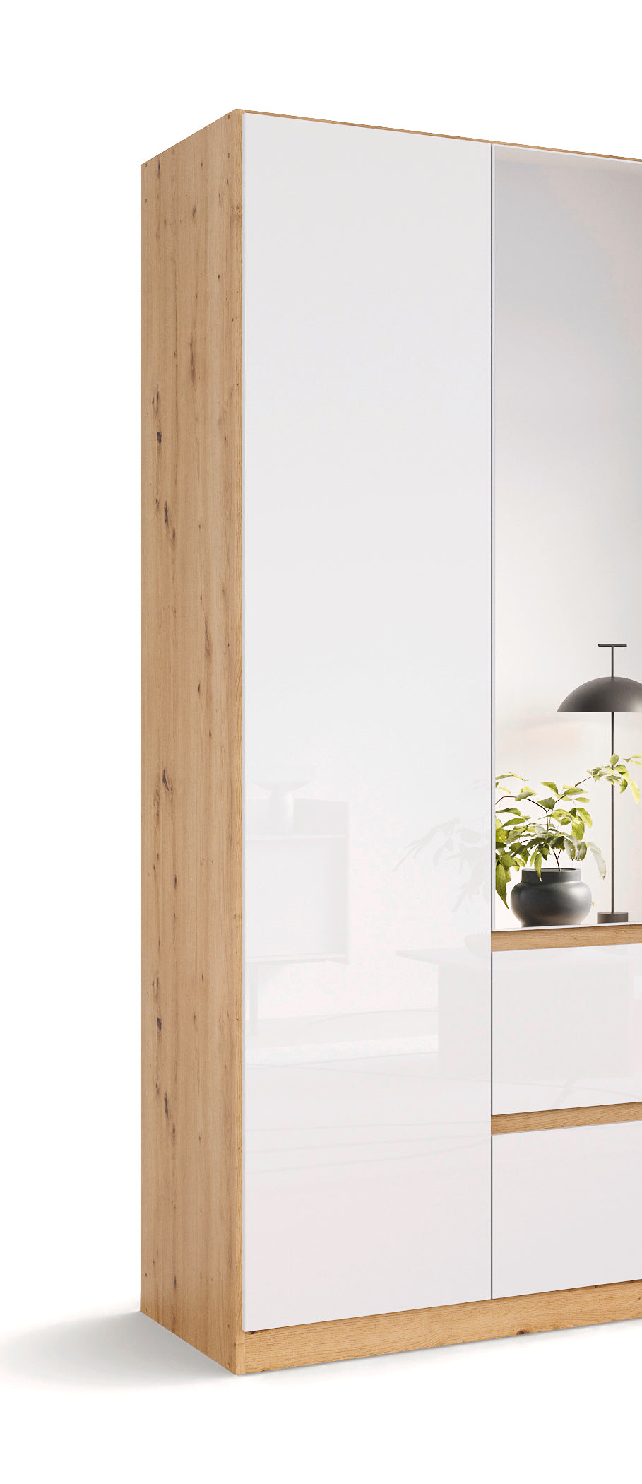 3 Abteilungen inkl. Seiten ca. 45/90/45 cm, 3 Einlegeböden und 3 Kleiderstangen, 2 Schubkästen mit push to open Funktion. Korpus Alpinweiß, Front Alpinweiß Hochglanz. Lieferzeit ca. 4-6 Wochen.