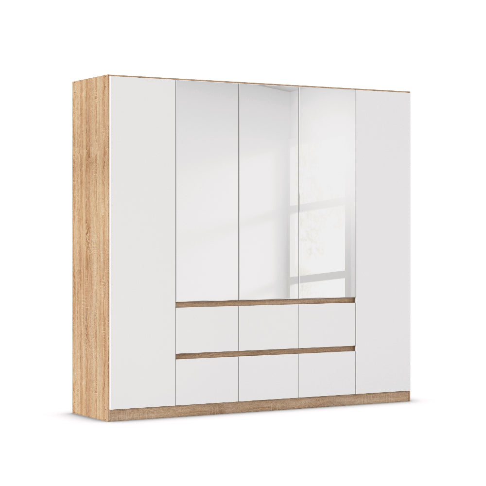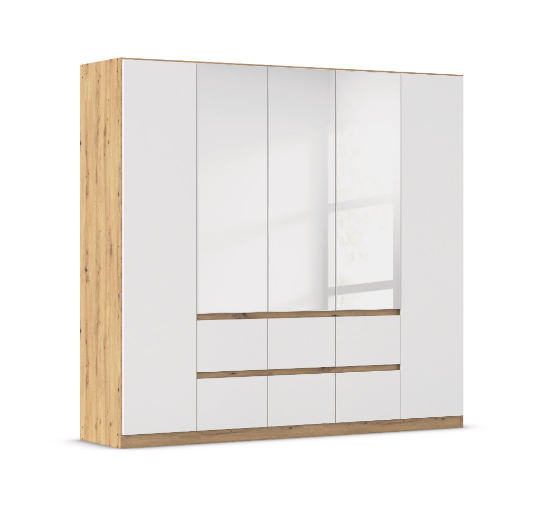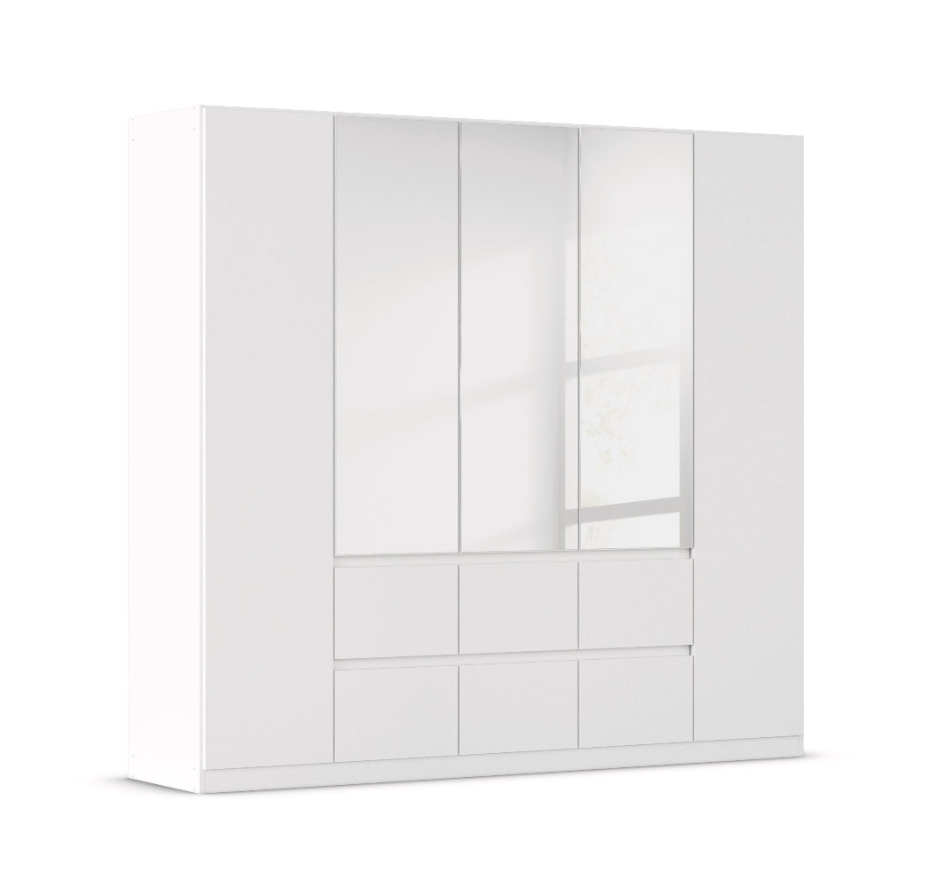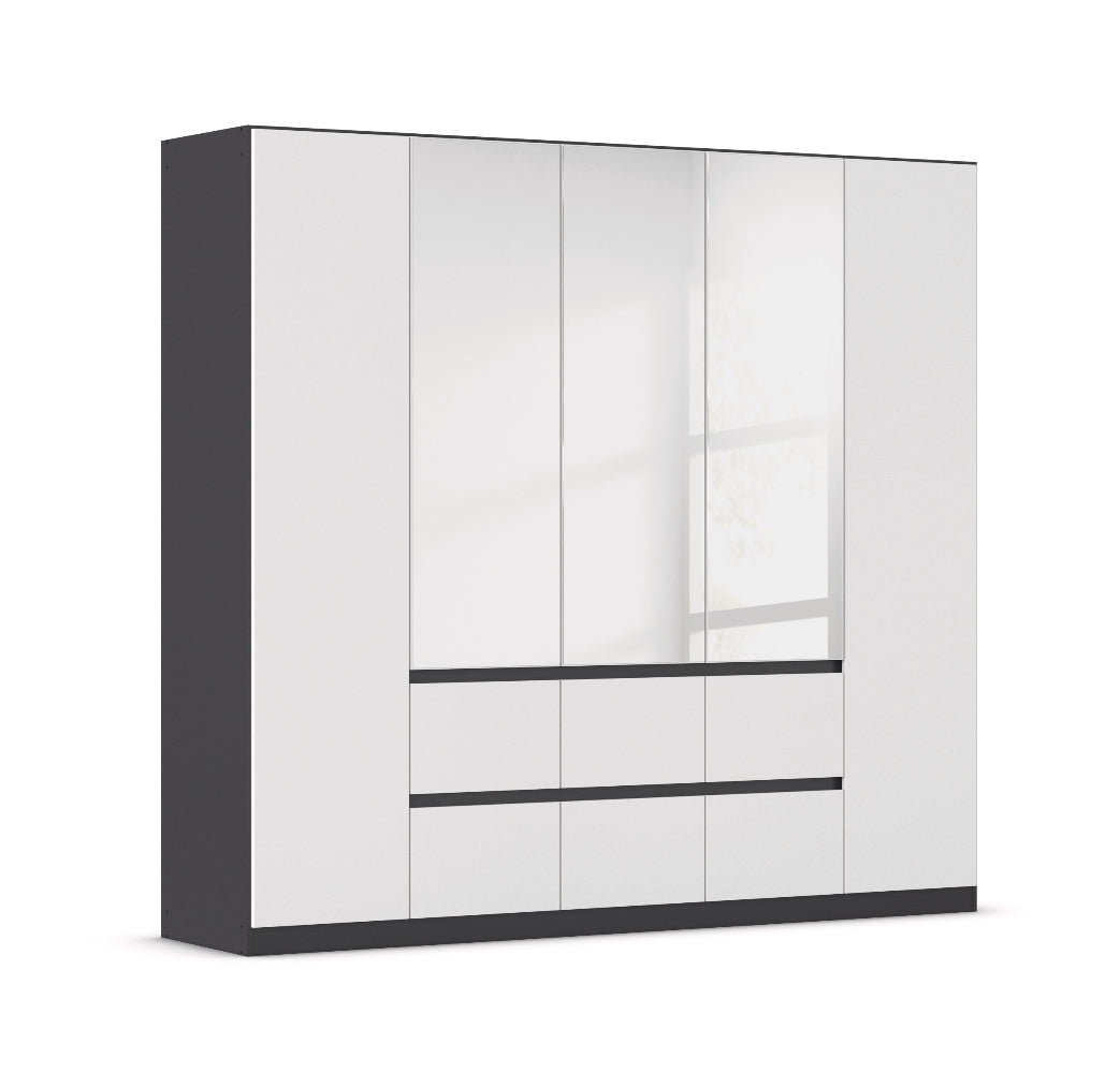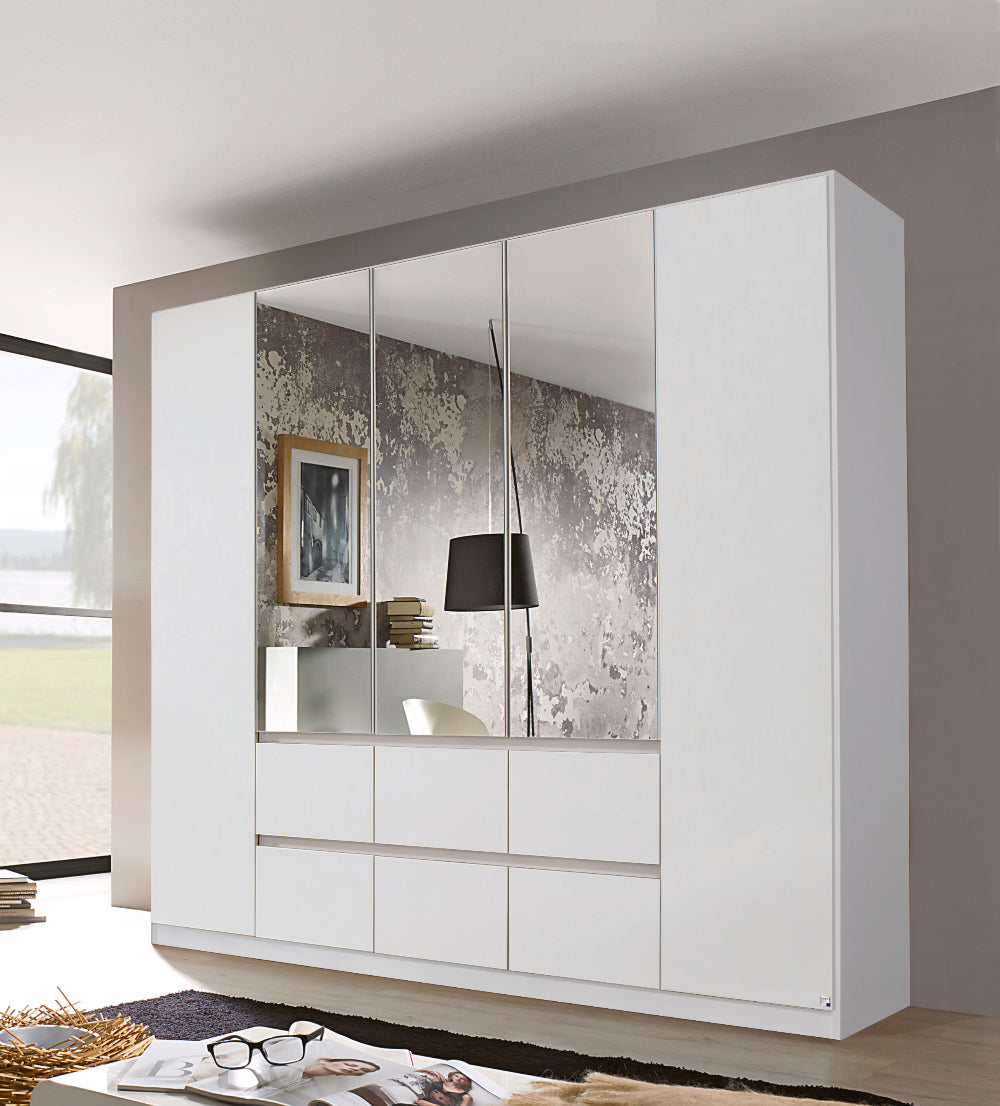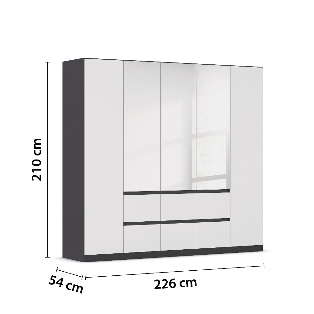 Bringen Sie mit dem Rauch Drehtürenschrank Mainz modernes Design und ausreichend Stauraum in Ihr Schlafzimmer. Mit 5 Türen und 6 Schubladen bietet er Platz für Ihre Kleidung und Accessoires. Die Größe von ca. 225 x 210 x 54 cm ermöglicht eine optimale Nutzung des vorhandenen Platzes. Dank der push to open Funktion der Schubladen lässt sich der Schrank bequem öffnen und bietet viel Stauraum für Kleidung und andere Gegenstände. Ein echtes Highlight in jedem Raum. Dank der Spiegeltüren können Sie sich auch von allen Seiten betrachten und immer perfekt gekleidet sein.