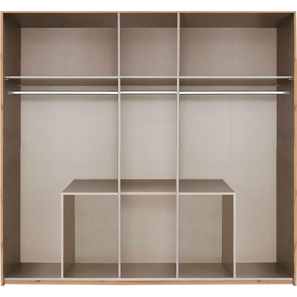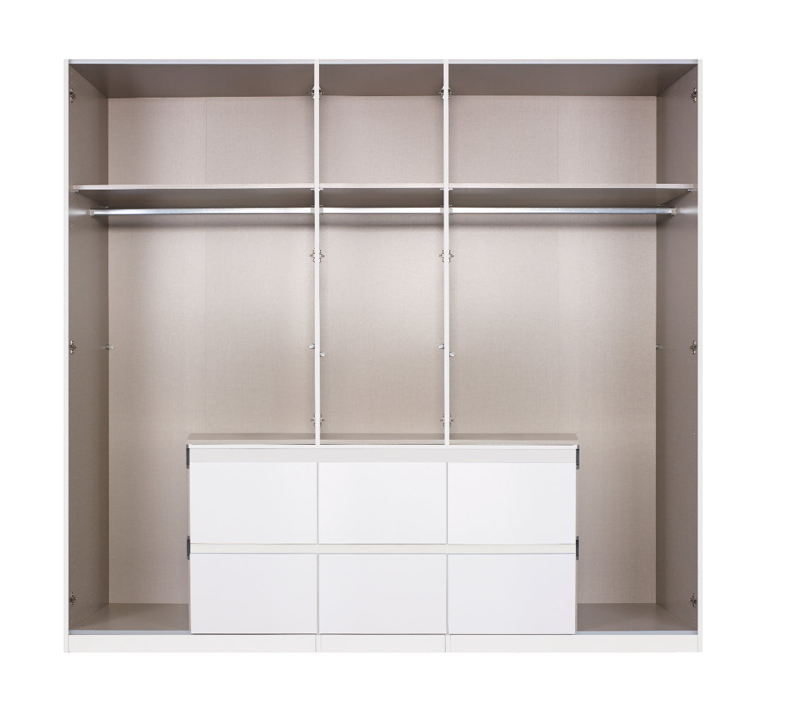 3 Abteilungen inkl. Seiten ca. 90/45/90 cm, 3 Einlegeböden und 3 Kleiderstangen, 6 Schubkästen mit push to open Funktion. 3 Mittlere Türen - Spiegeltüren. Korpus und Front Alpinweiß. Lieferzeit ca. 4-6 Wochen.