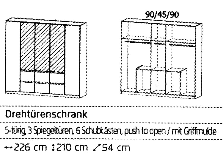 Drehtürenschrank Mainz 5-türig mit 3 Spiegeltüren und 6 Schubladen B/H/T ca. 225 x 210 x 54 cm
