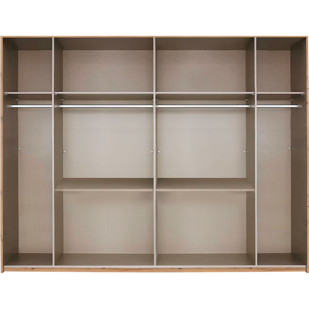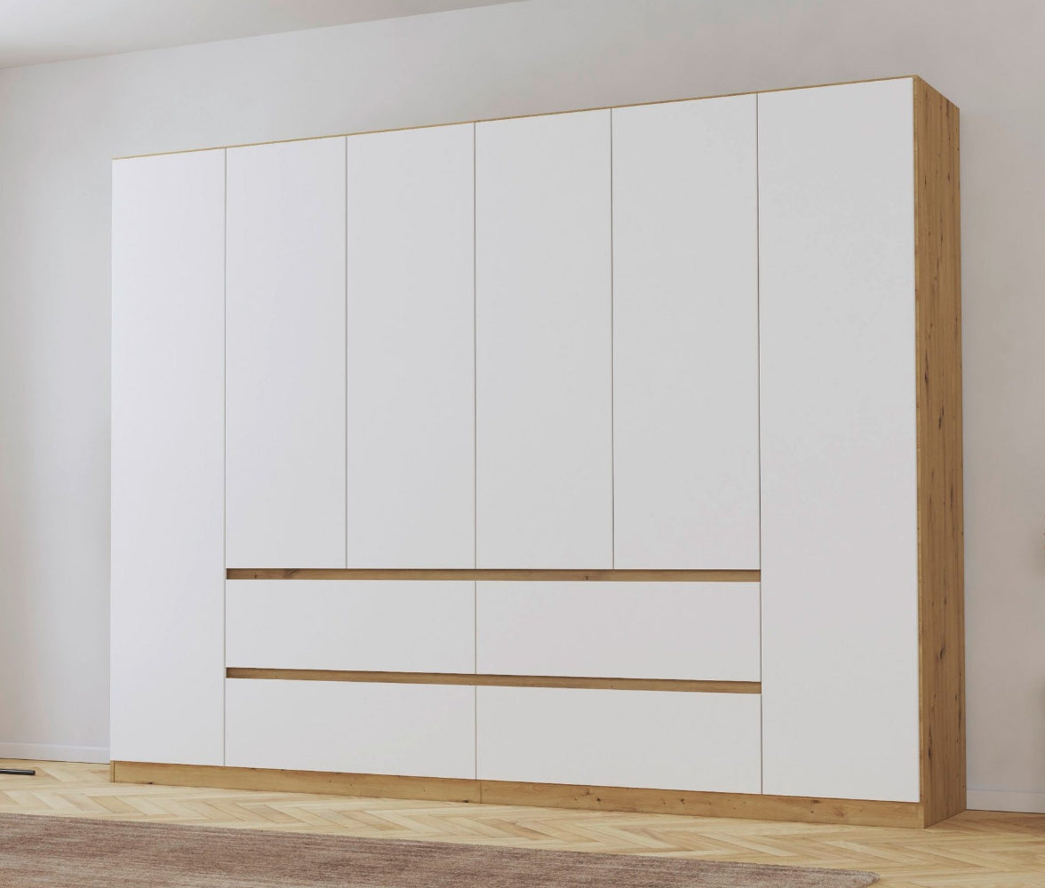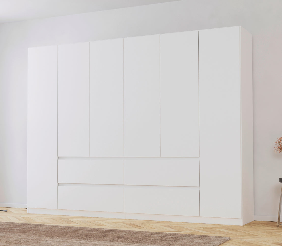 4 Abteilungen inkl. Seiten ca. 45/90/90/45 cm, 4 Einlegeböden und 4 Kleiderstangen, 4 Schubkästen mit push to open Funktion. Korpus Alpinweiß, Front Hochglanz Weiß. Lieferzeit ca. 4-6 Wochen.