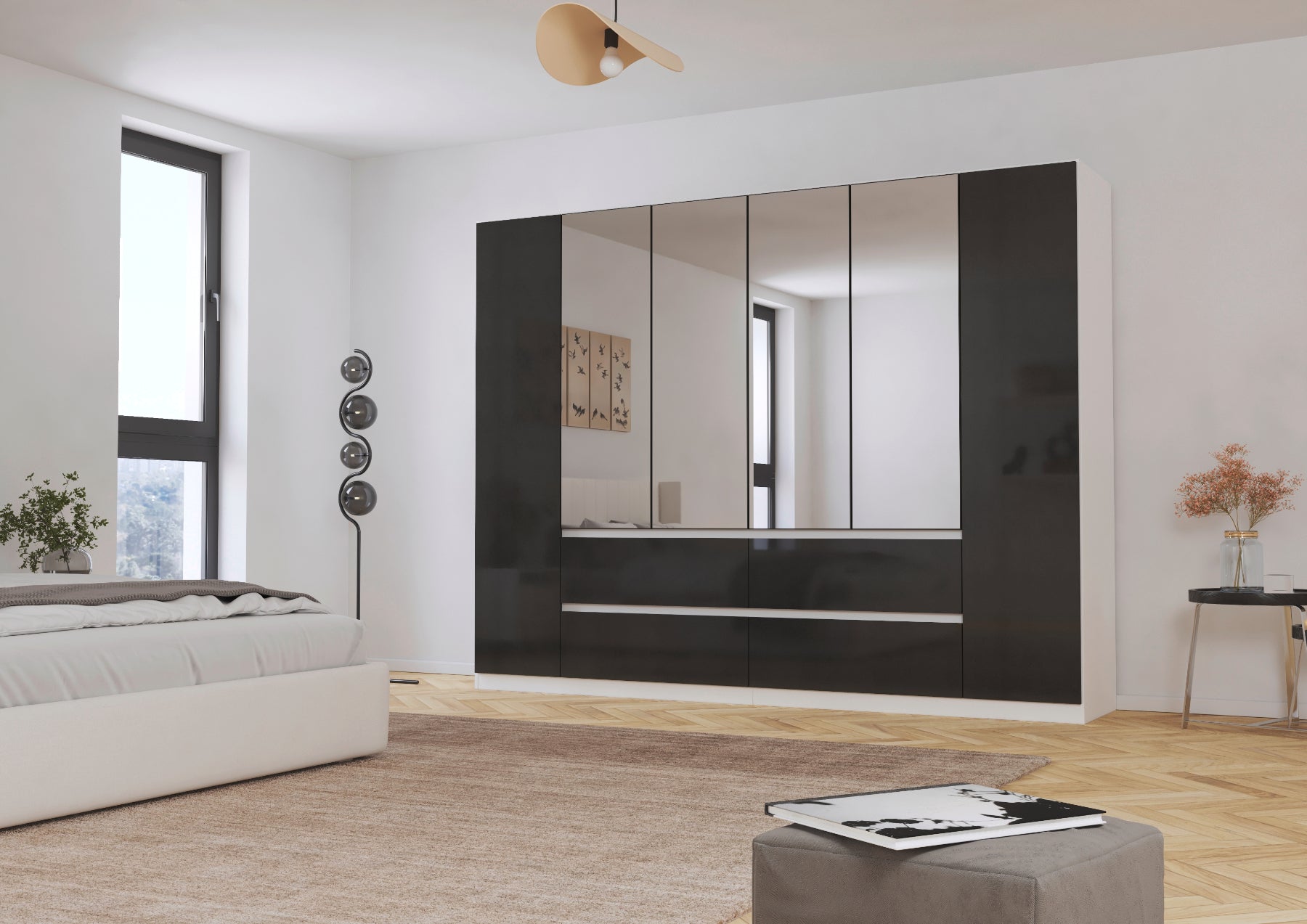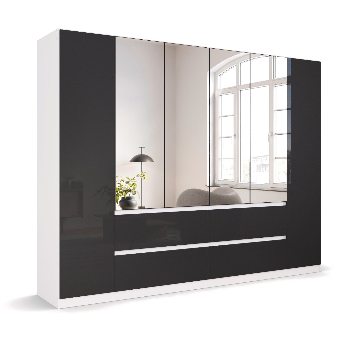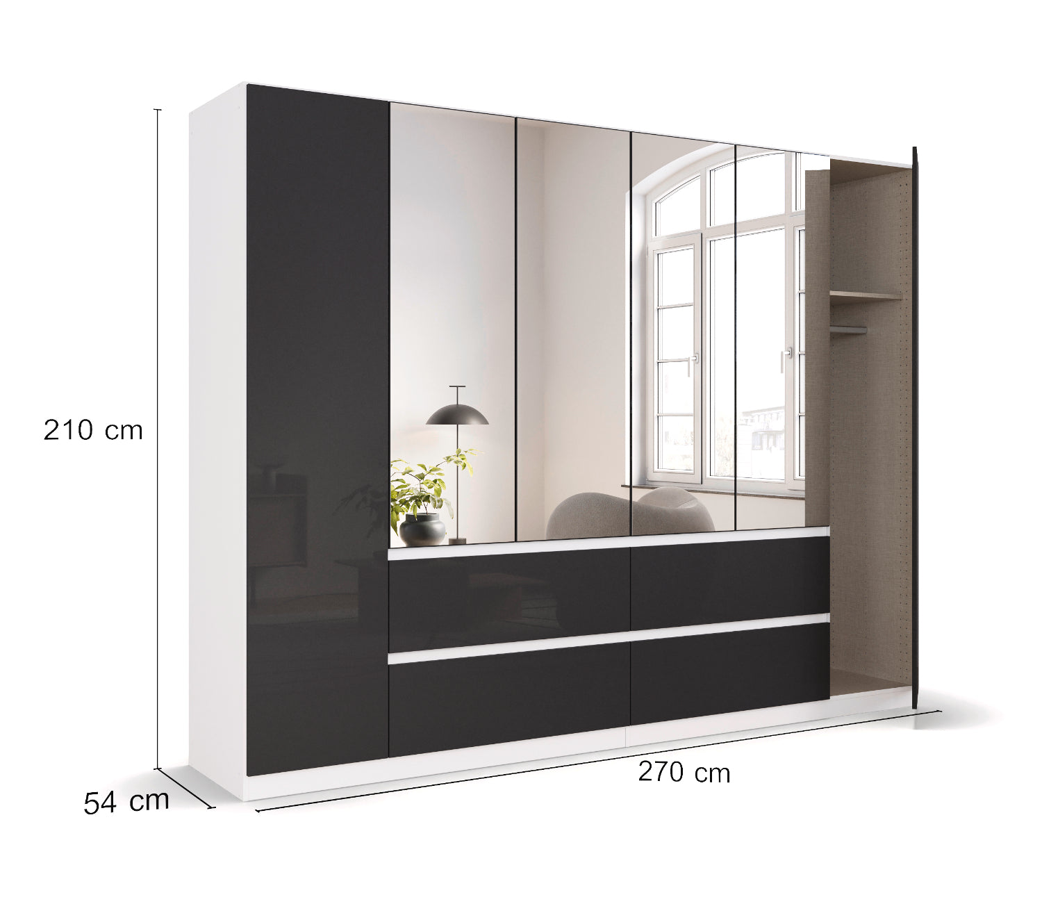 Bringen Sie frischen Wind in Ihr Zuhause mit dem Rauch Drehtürenschrank Mainz. Die 6 Türen und 4 Schubladen bieten viel Stauraum und das moderne Design verleiht Ihrem Raum eine stilvolle Note. Mit einer Breite von 270 cm und einer Höhe von 210 cm passt dieser Schrank perfekt in jeden Raum. Die Spiegeltüren verleihen dem Schrank eine elegante Note und die Schubladen sorgen für eine ordentliche Aufbewahrung. Macht gleichzeitig Platz und reflektiert natürliches Licht für eine helle Atmosphäre. Die grifflose Gestaltung und die Push to open Funktion sorgen für eine moderne und komfortable Bedienung. Wählen Sie zwischen einer Hochglanzfront in Weiß oder Grau, um Ihrem Raum ein elegantes Ambiente zu verleihen.