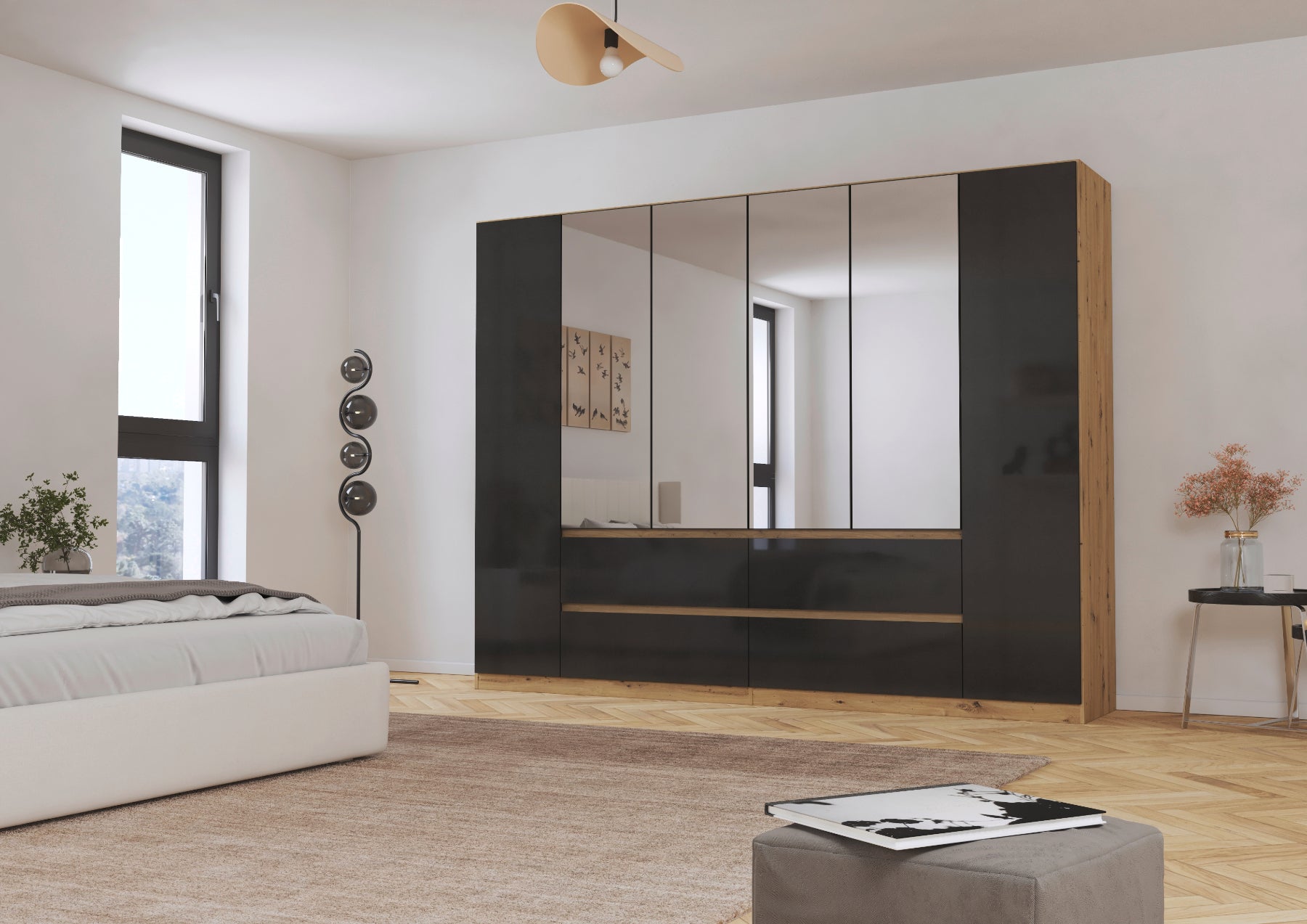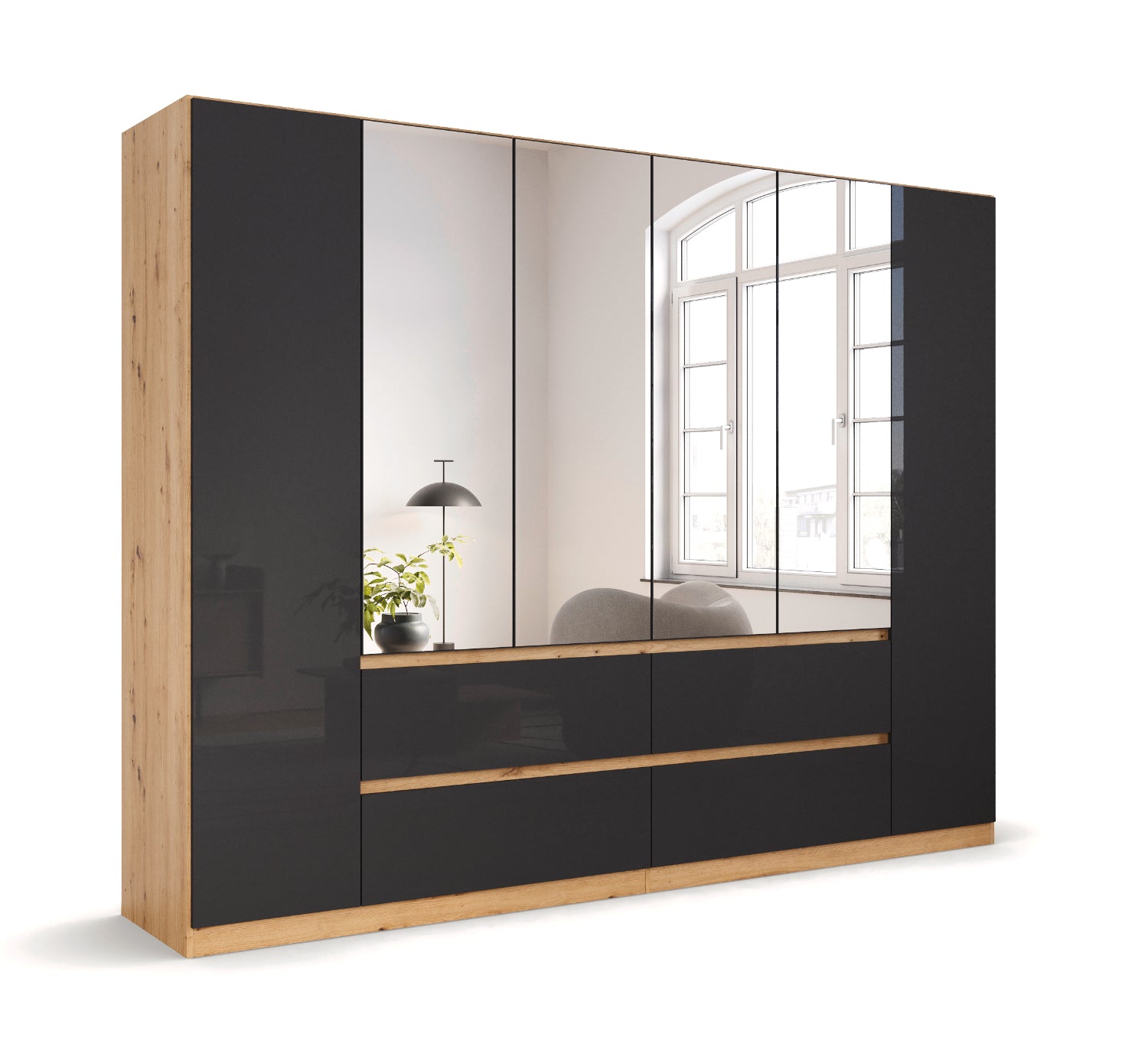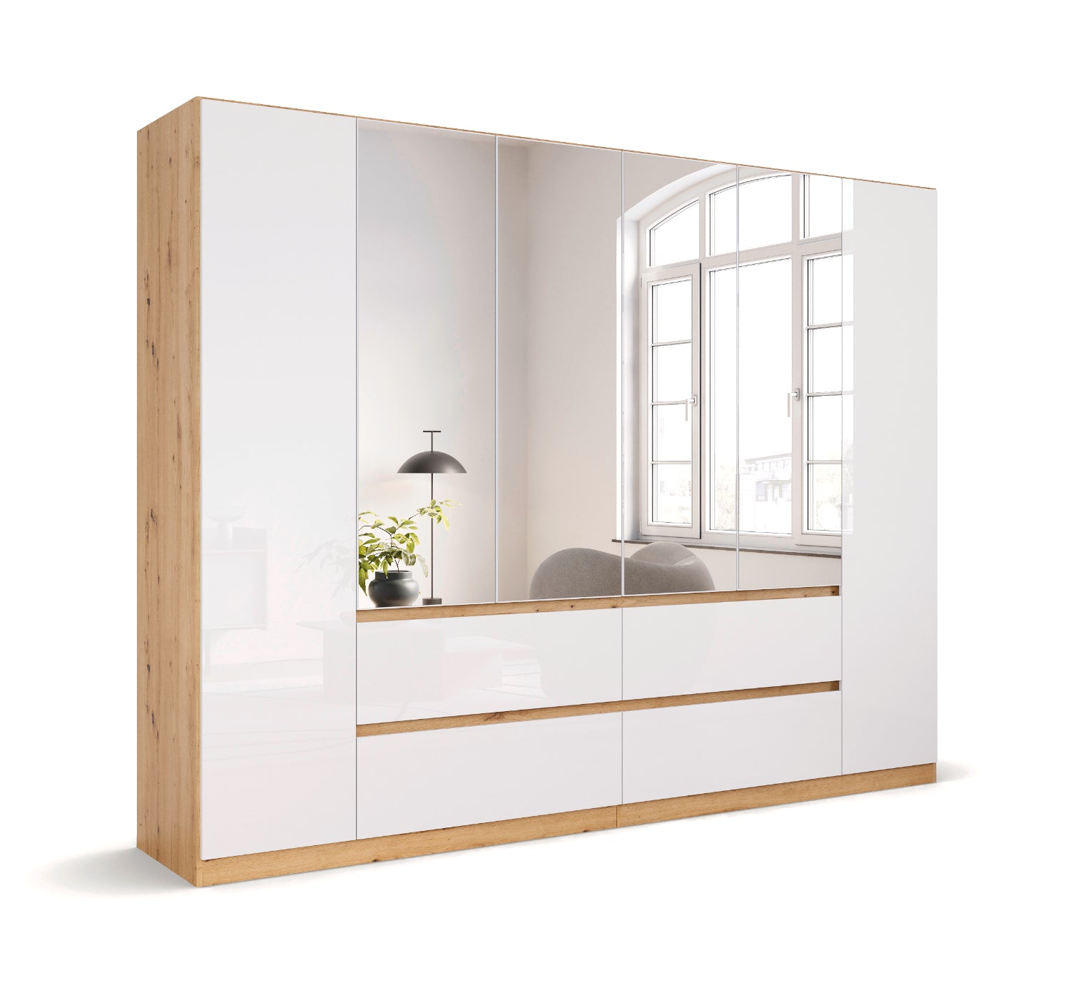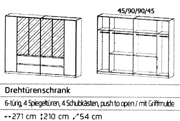 Bringen Sie frischen Wind in Ihr Zuhause mit dem Rauch Drehtürenschrank Mainz. Die 6 Türen und 4 Schubladen bieten viel Stauraum und das moderne Design verleiht Ihrem Raum eine stilvolle Note. Mit einer Breite von 270 cm und einer Höhe von 210 cm passt dieser Schrank perfekt in jeden Raum. Die Spiegeltüren verleihen dem Schrank eine elegante Note und die Schubladen sorgen für eine ordentliche Aufbewahrung. Macht gleichzeitig Platz und reflektiert natürliches Licht für eine helle Atmosphäre. Die grifflose Gestaltung und die Push to open Funktion sorgen für eine moderne und komfortable Bedienung. Wählen Sie zwischen einer Hochglanzfront in Weiß oder Grau, um Ihrem Raum ein elegantes Ambiente zu verleihen.