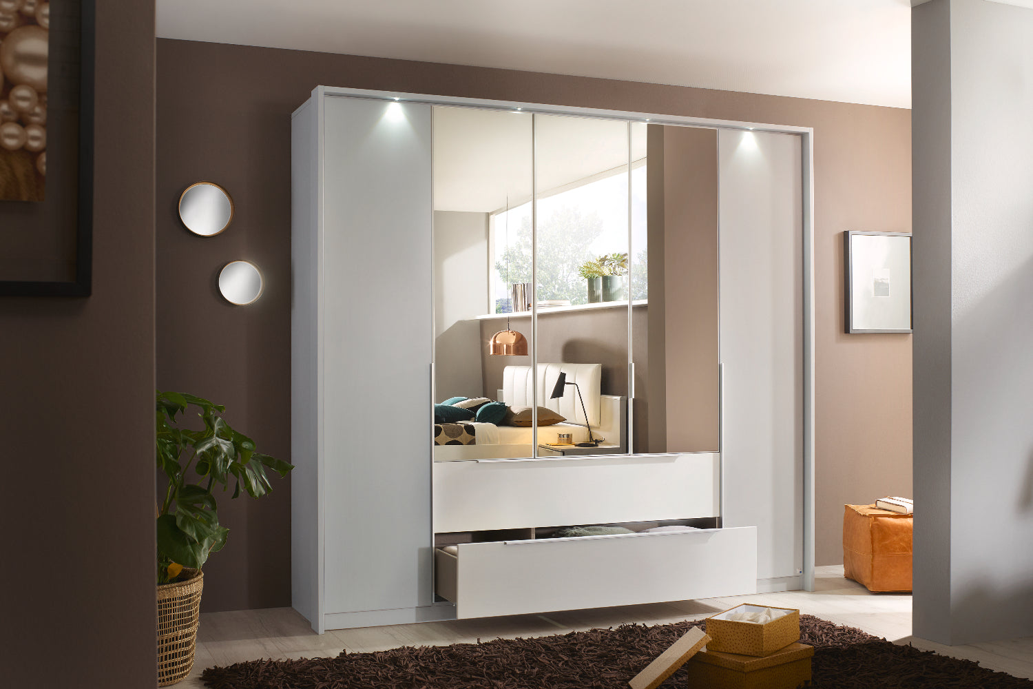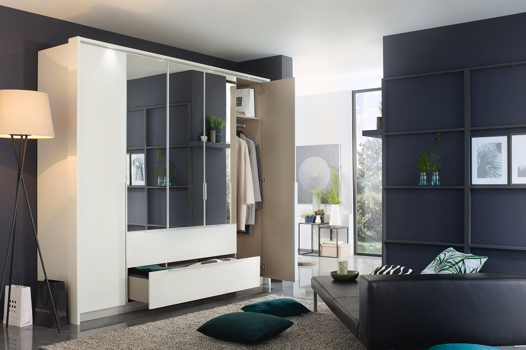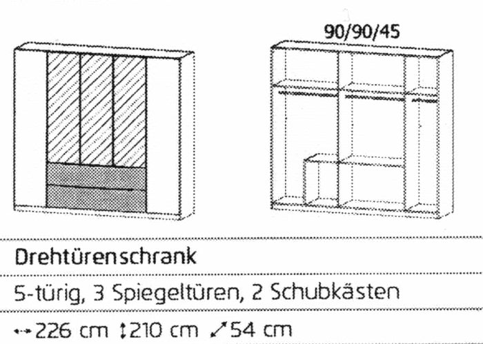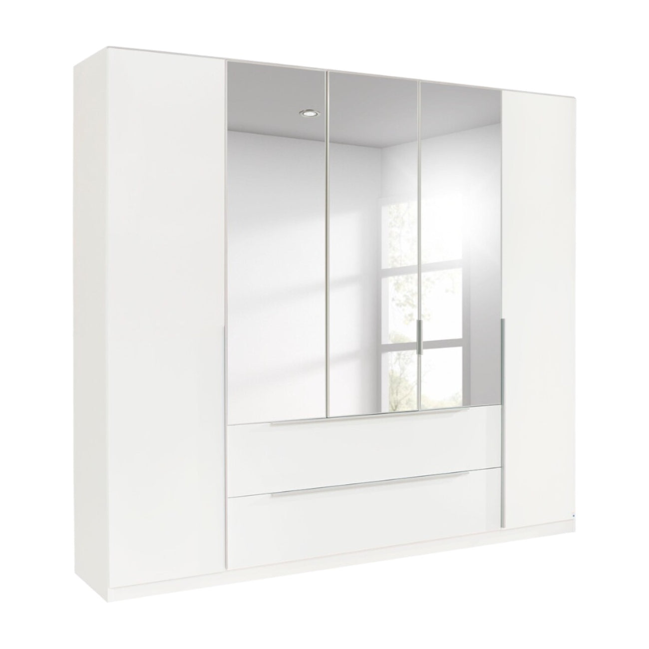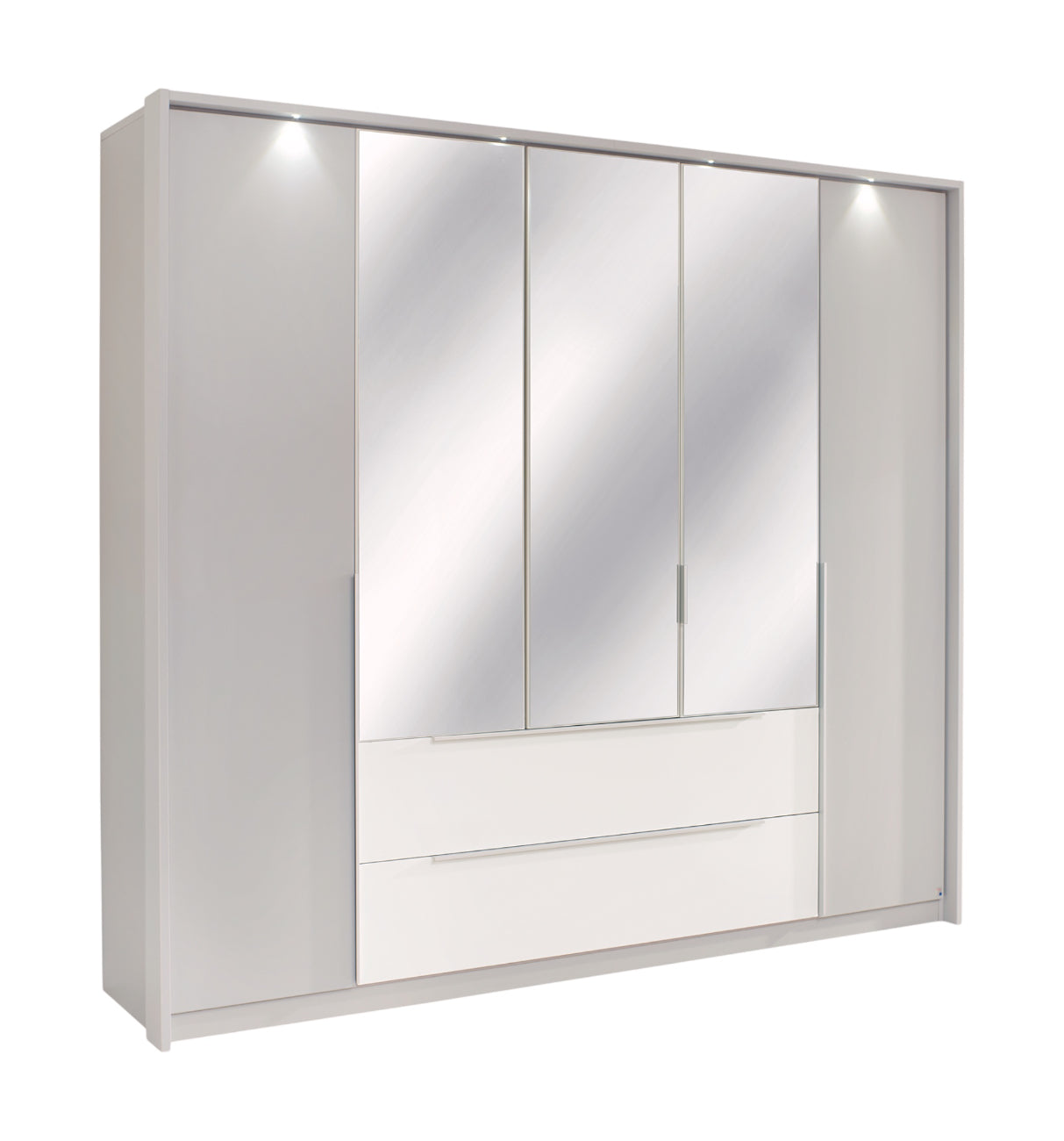 Mit 5 Türen und 2 Schubladen, bietet er genug Platz. Erhältlich in den Farben Alpinweiß oder Seidengrau. Mit einer Größe von 226 x 210 x 54 cm bietet er Platz für Ihre Kleidung und dank der 3 Spiegeltüren auch eine praktische Möglichkeit, sich von allen Seiten betrachten zu können. Verleiht Ihrem Raum ein modernes Aussehen und spiegelt das Licht wider, um ein helles, geräumiges Ambiente zu schaffen.