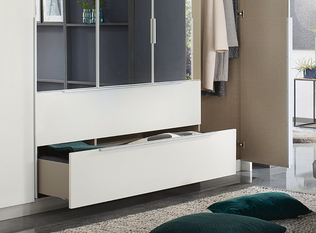 3 Abteilungen inkl. Seiten ca. 90/90/45 cm, 4 Einlegeböden und 3 Kleiderstangen, 2 Schubkästen, 3 Mittlere Türen - Spiegeletüren. Korpus und Front Alpinweiß. Lieferzeit ca. 4-6 Wochen.