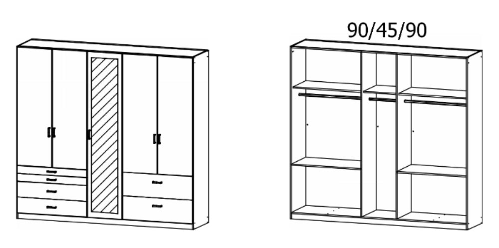 Ohne Passepartoutrahmen. 3 Abteilungen inkl. Seiten ca. 90/45/90 cm, 3 Einlegeböden und 3 Kleiderstangen, 4 Schubkästen links und 2 Schubkästen rechts, inkl. Inneneinteilung in oberer schmaler Schubkasten links. 1 Mittlere Tür - Spiegeltür. Korpus und Front Alpinweiß.