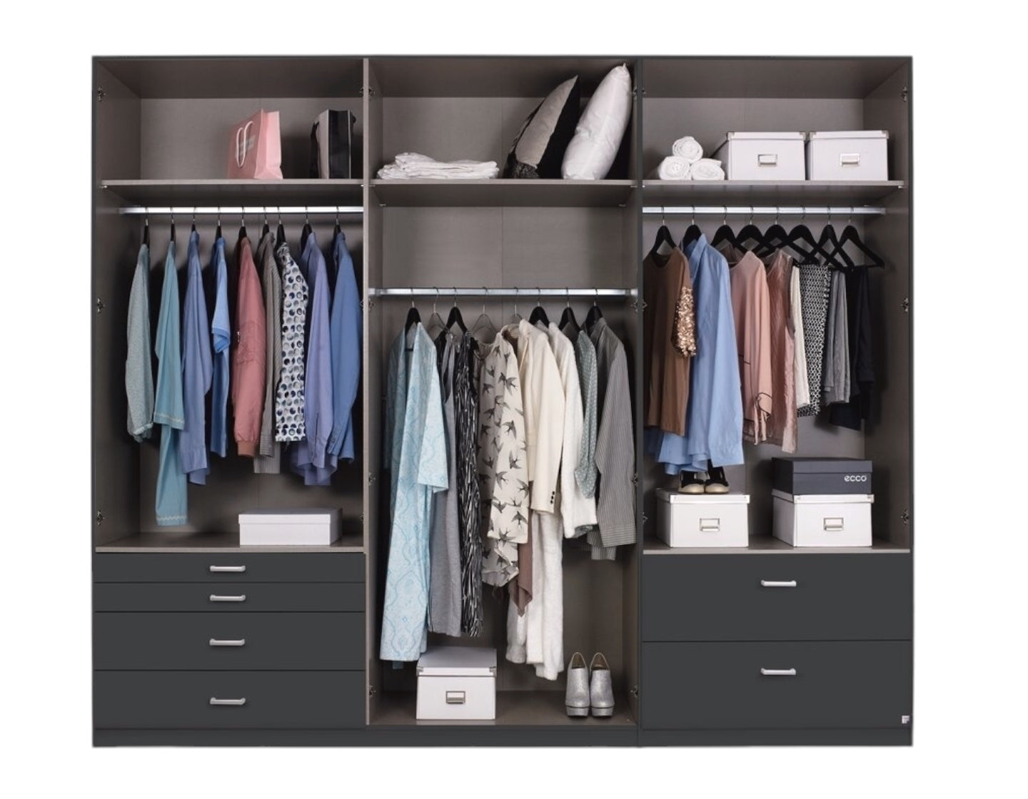 Ohne Passepartoutrahmen. 3 Abteilungen inkl. Seiten ca. 90/90/90 cm, 3 Einlegeböden und 3 Kleiderstangen, 4 Schubkästen links und 2 Schubkästen rechts, inkl. Inneneinteilung in oberer schmaler Schubkasten links. 2 Mittlere Türen - Spiegeltüren. Korpus und Front Alpinweiß.