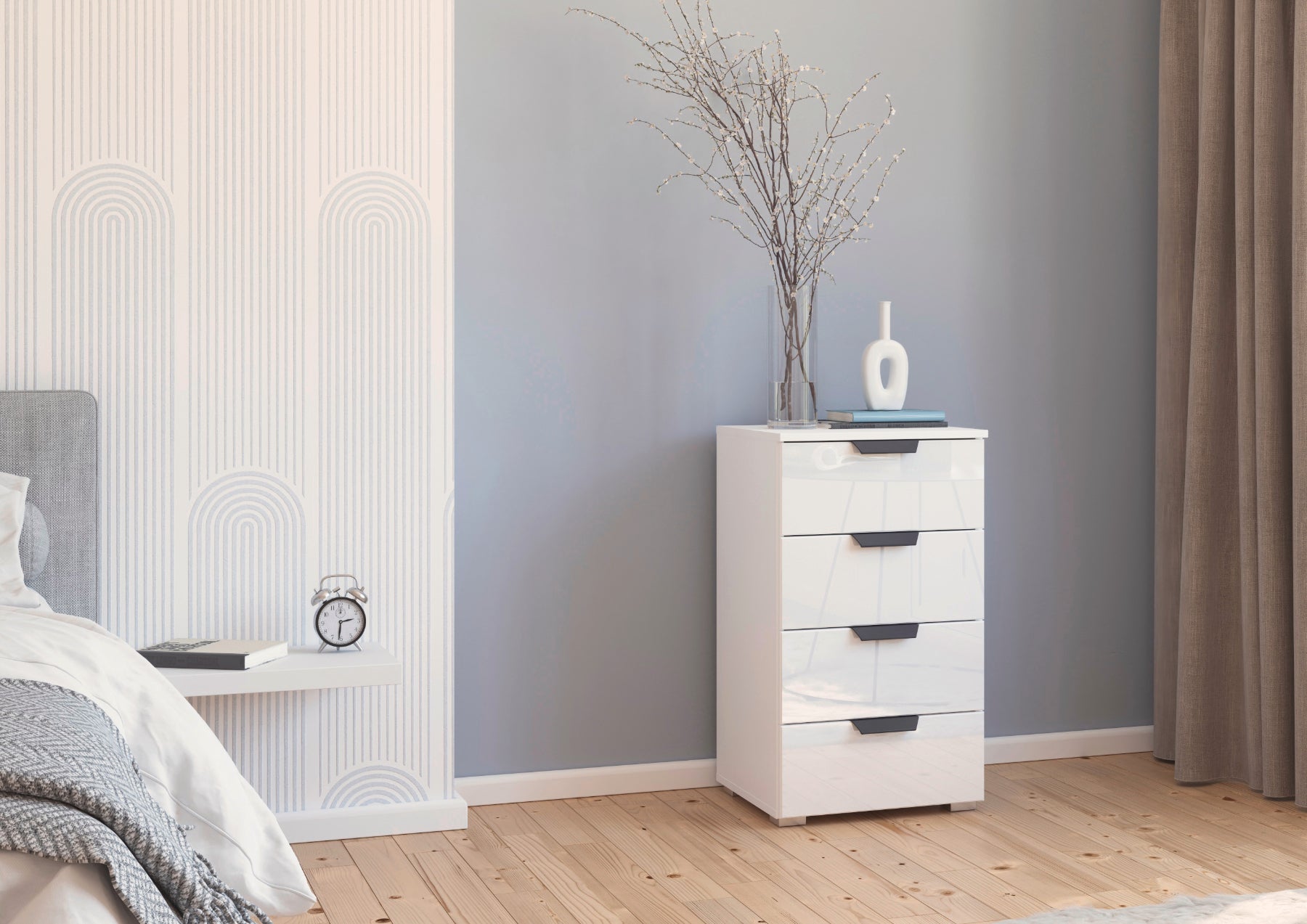 Entdecken Sie die moderne Rauch Nachtkommode Artemis mit 4 Schubladen! Mit ihrem zeitgemäßen Design und Farbglas verleiht sie Ihrem Schlafzimmer einen Hauch von Eleganz. Die praktischen Schubladen bieten viel Stauraum und halten Ihr Zimmer ordentlich und aufgeräumt. Perfekte Ergänzung für Ihr Zuhause!