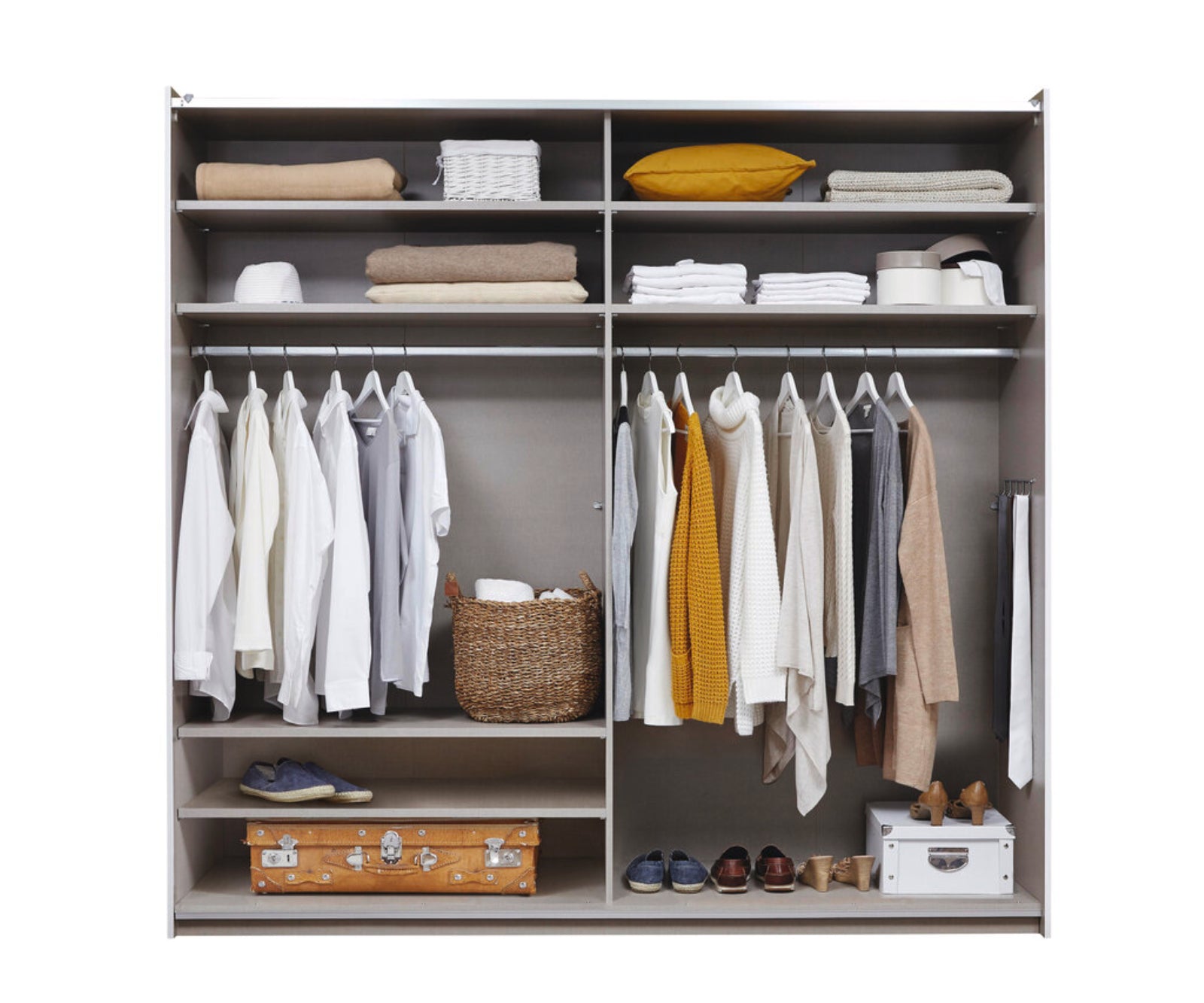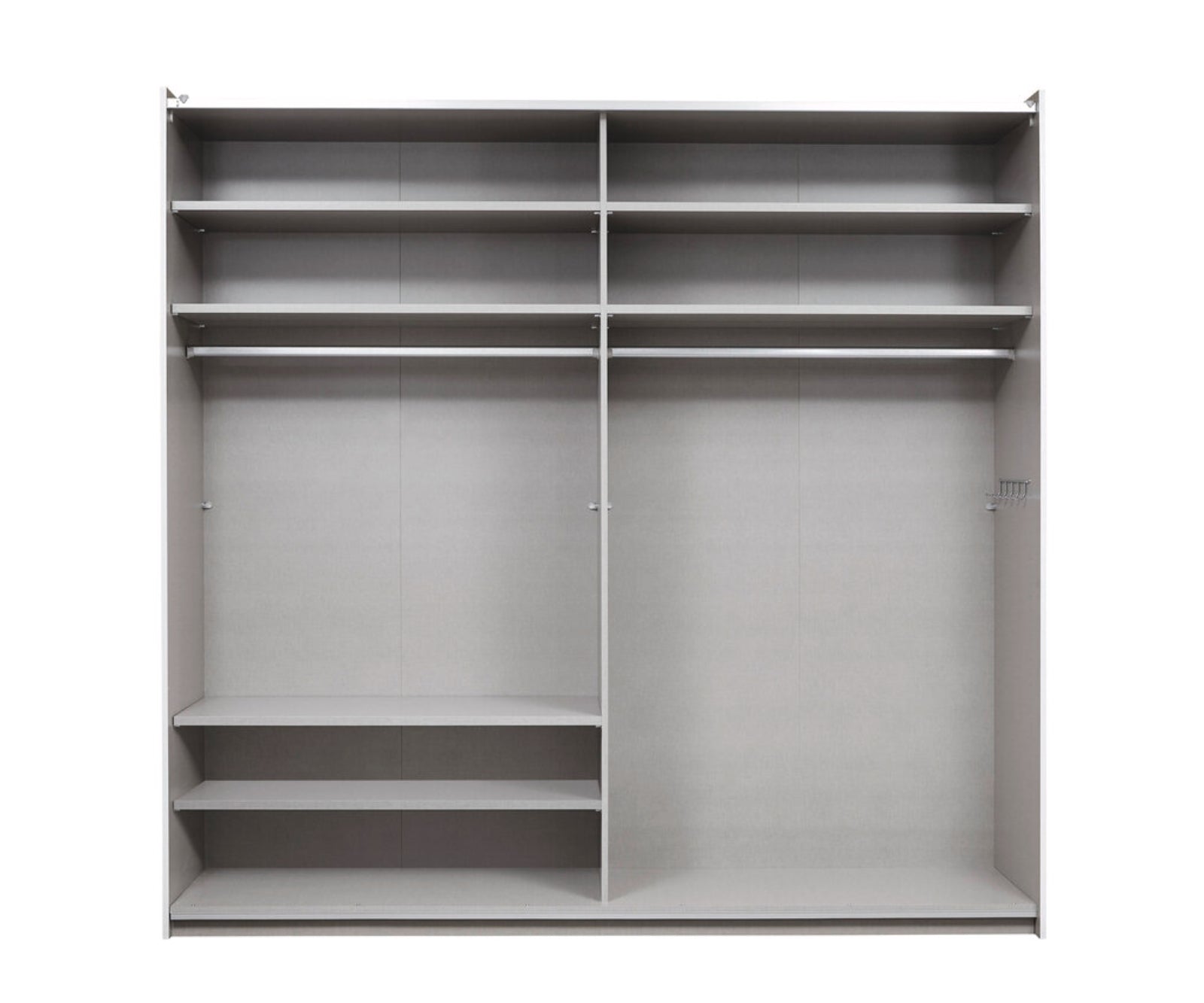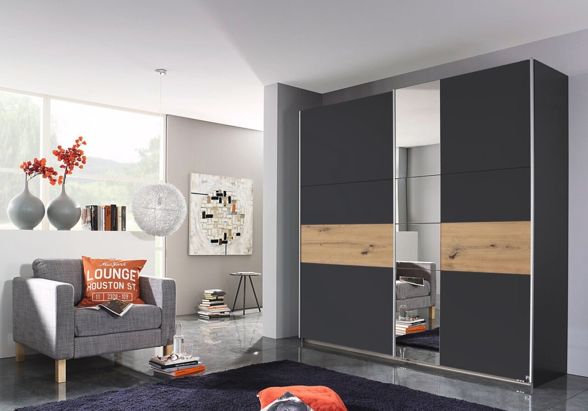 2 Abteilungen inkl. Seiten ca. 109/109 cm, Zubehör Premium: inkl. 6 Einlegeböden und 2 Kleiderstangen, inkl. Hakenleiste, inkl. Türendämpfer-Set, inkl. 2 Stoffkisten. Farbe: Korpus und Front Grau, Absetzung Eiche Artisan Nachbildung. Lieferzeit ca. 4-6 Wochen.