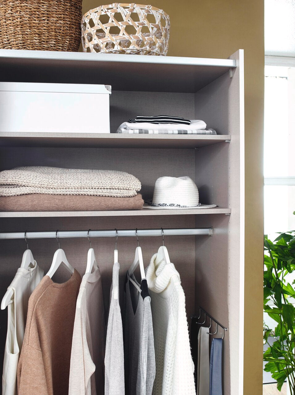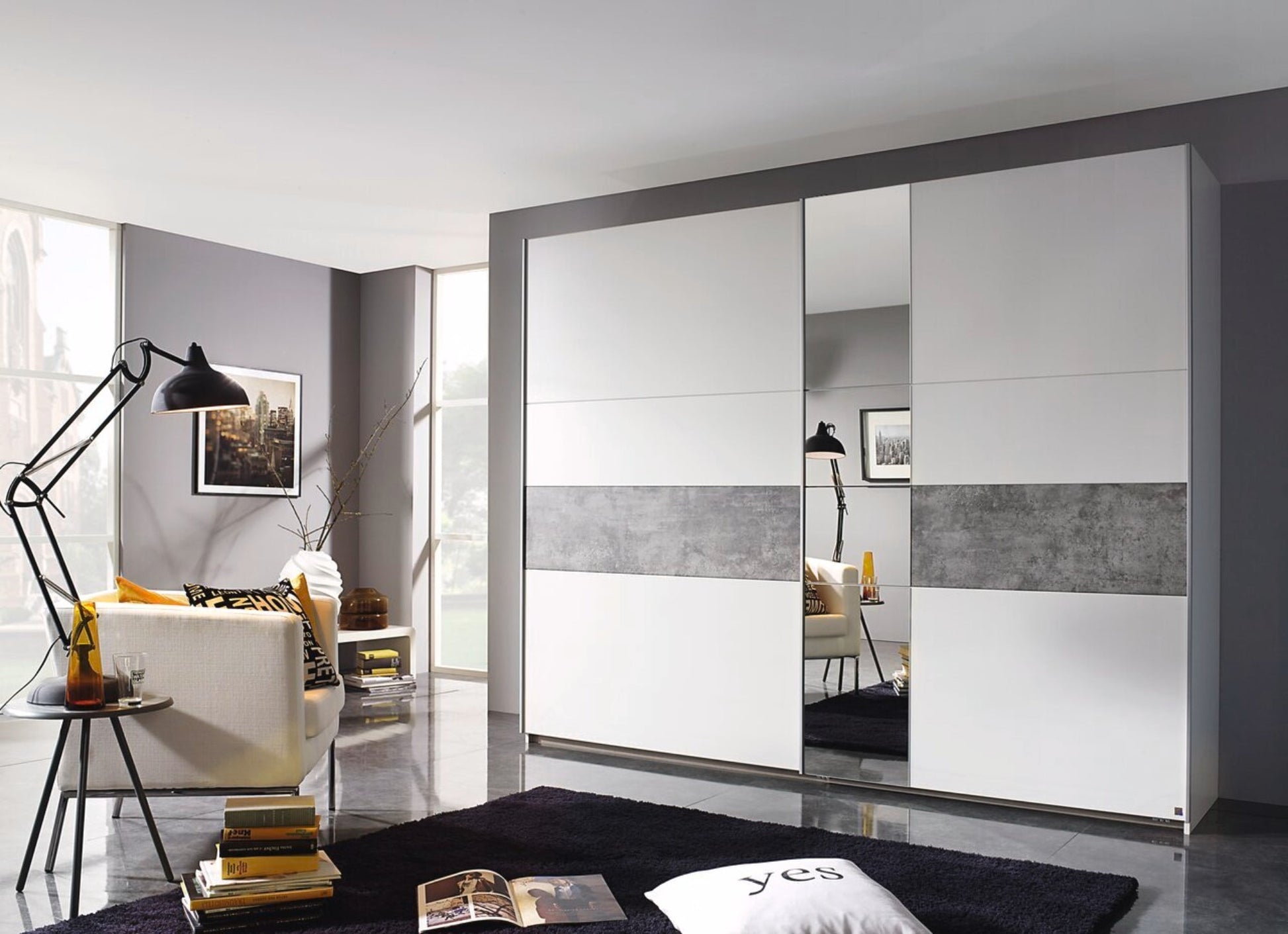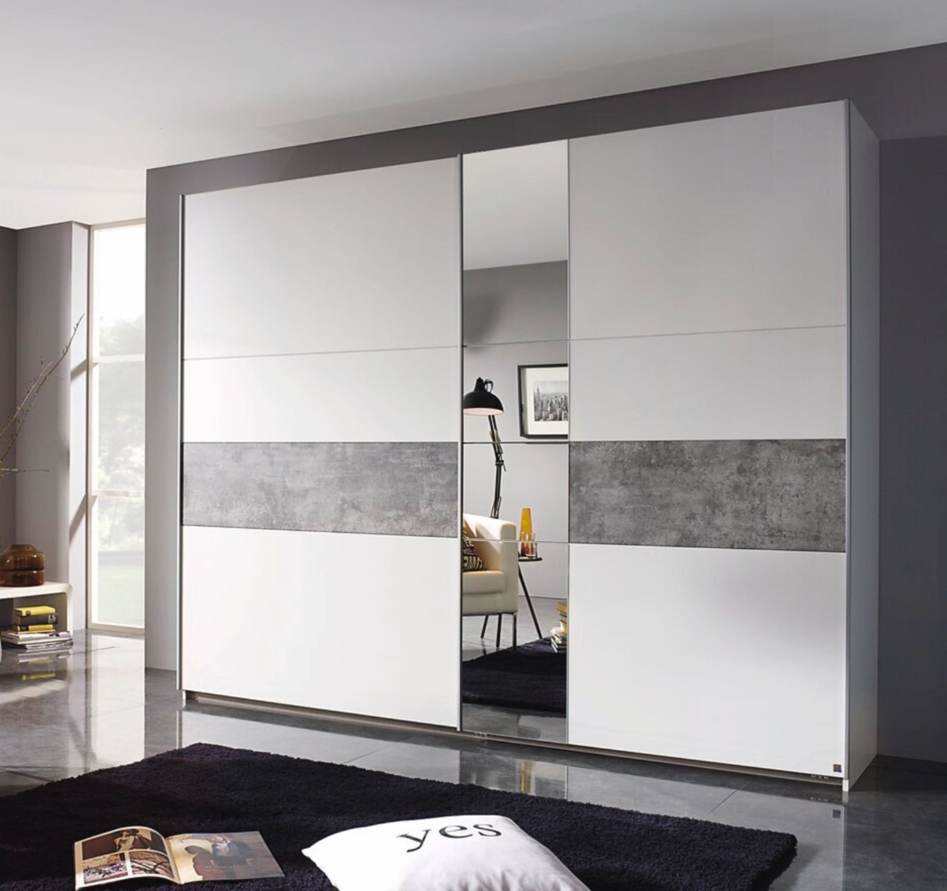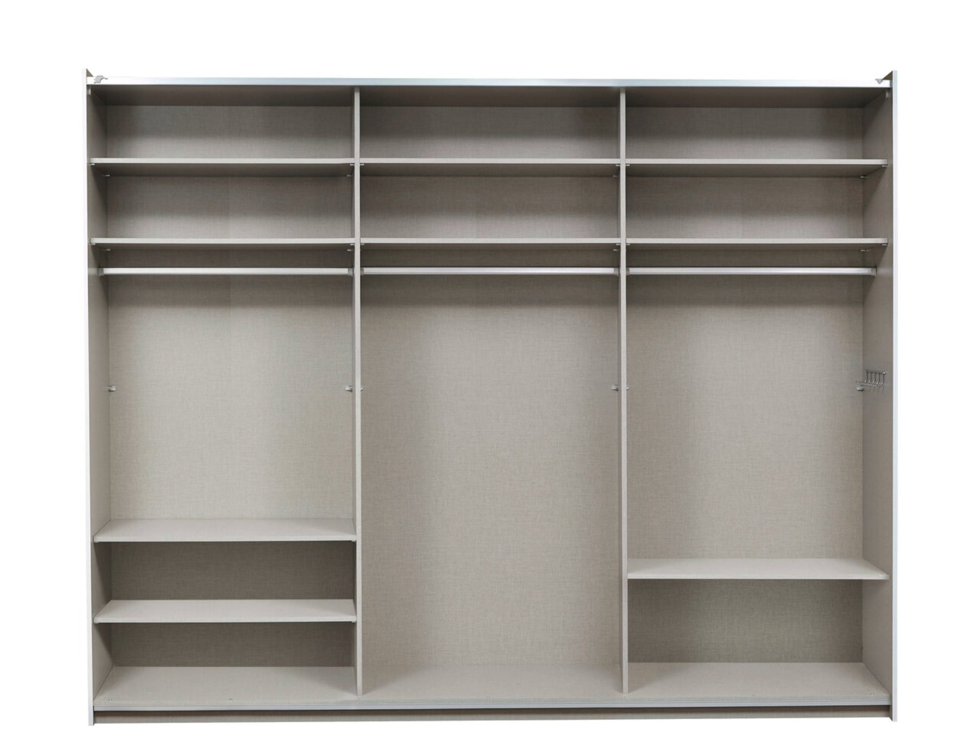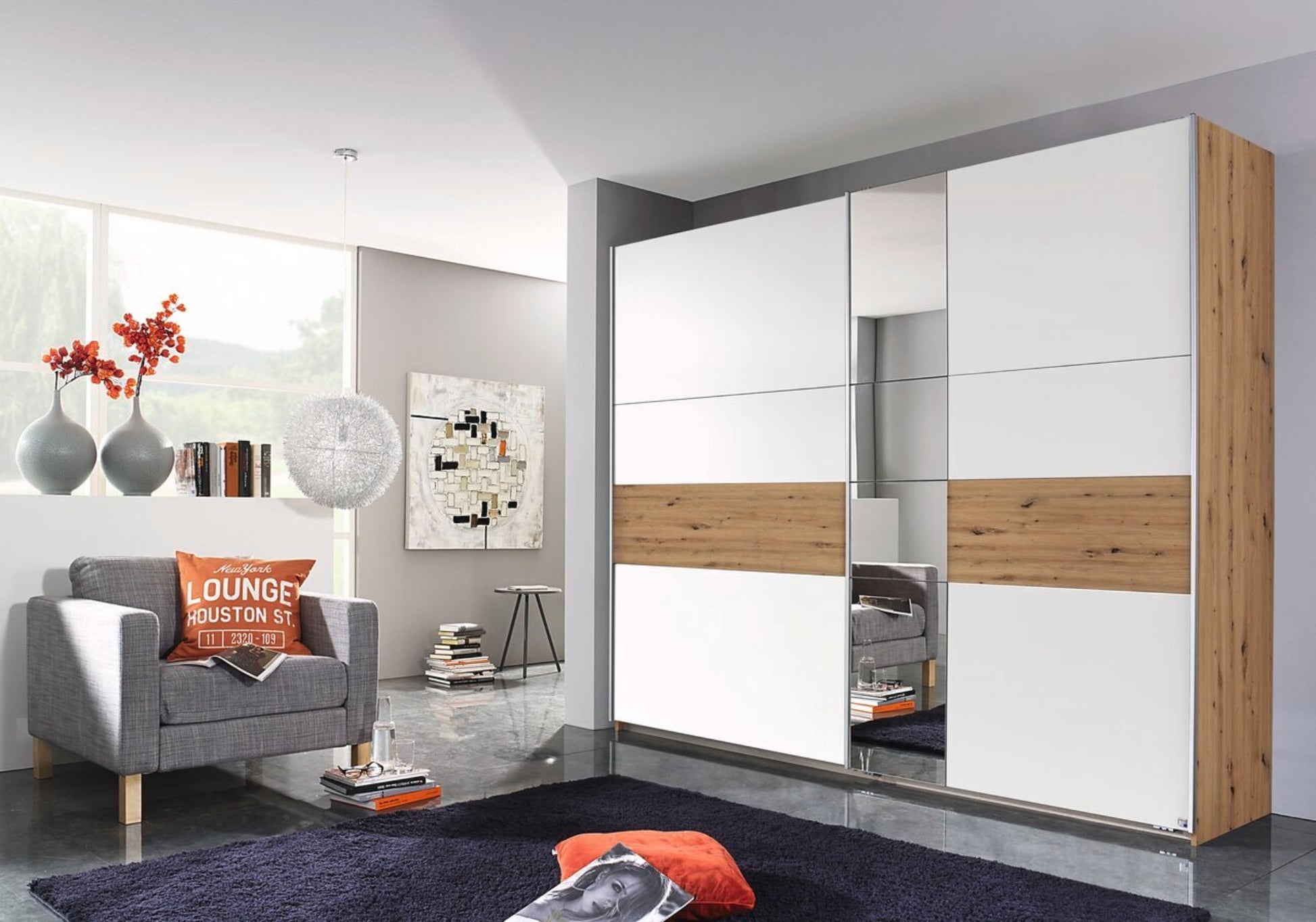 3 Abteilungen inkl. Seiten ca. 87,5/87,5/87,5 cm, Zubehör Premium: inkl. 8 Einlegeböden und 3 Kleiderstangen, inkl. Hakenleiste, inkl. Türendämpfer-Set, inkl. Inneneinteilung mit 2 Fachböden und 2 Stoffkisten. Farbe: Korpus und Front Grau, Absetzung Eiche Artisan Nachbildung. Lieferzeit ca. 4-6 Wochen.