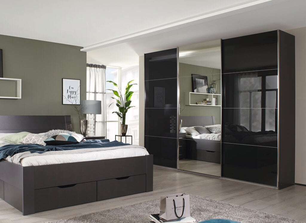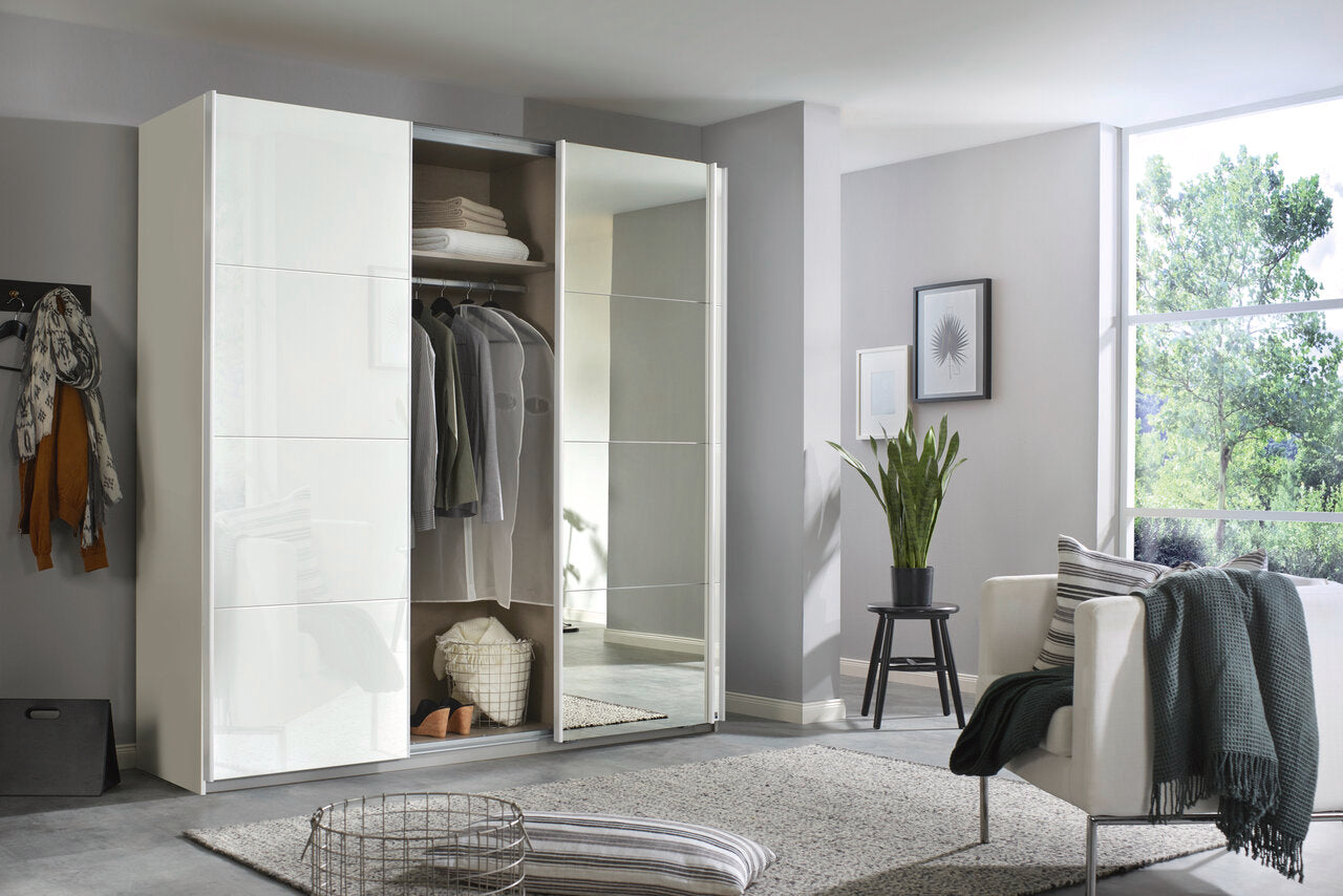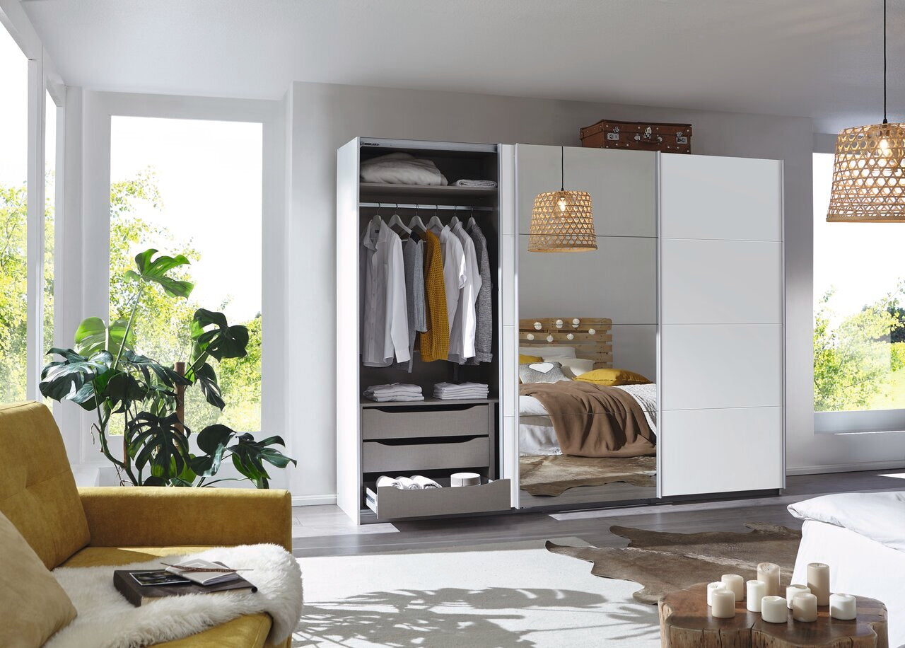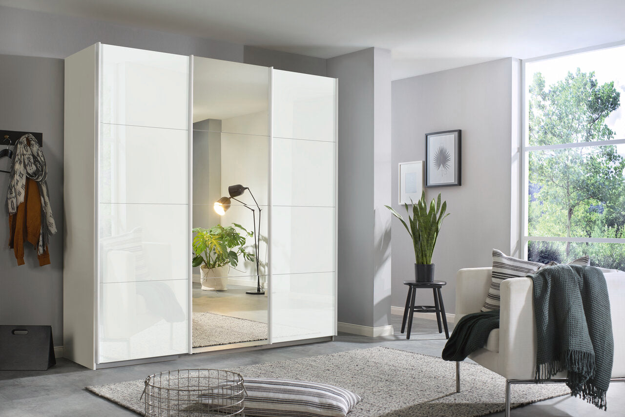 Rauch Schwebetürenschrank Kulmbach Hochglanzfront 3-türig mit Spiegeltür und Premium Zubehörpaket B/H/T ca. 203 x 229 x 62 cm