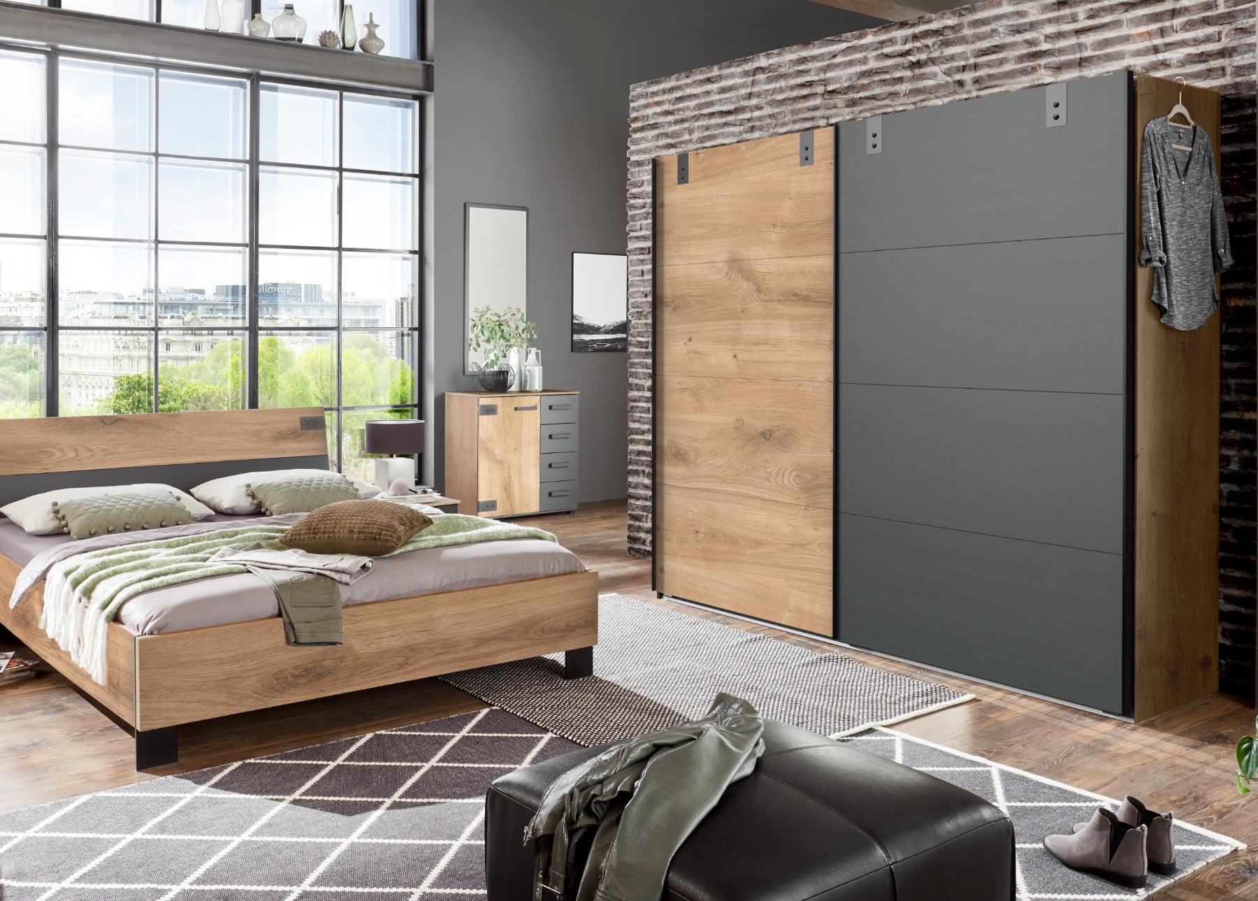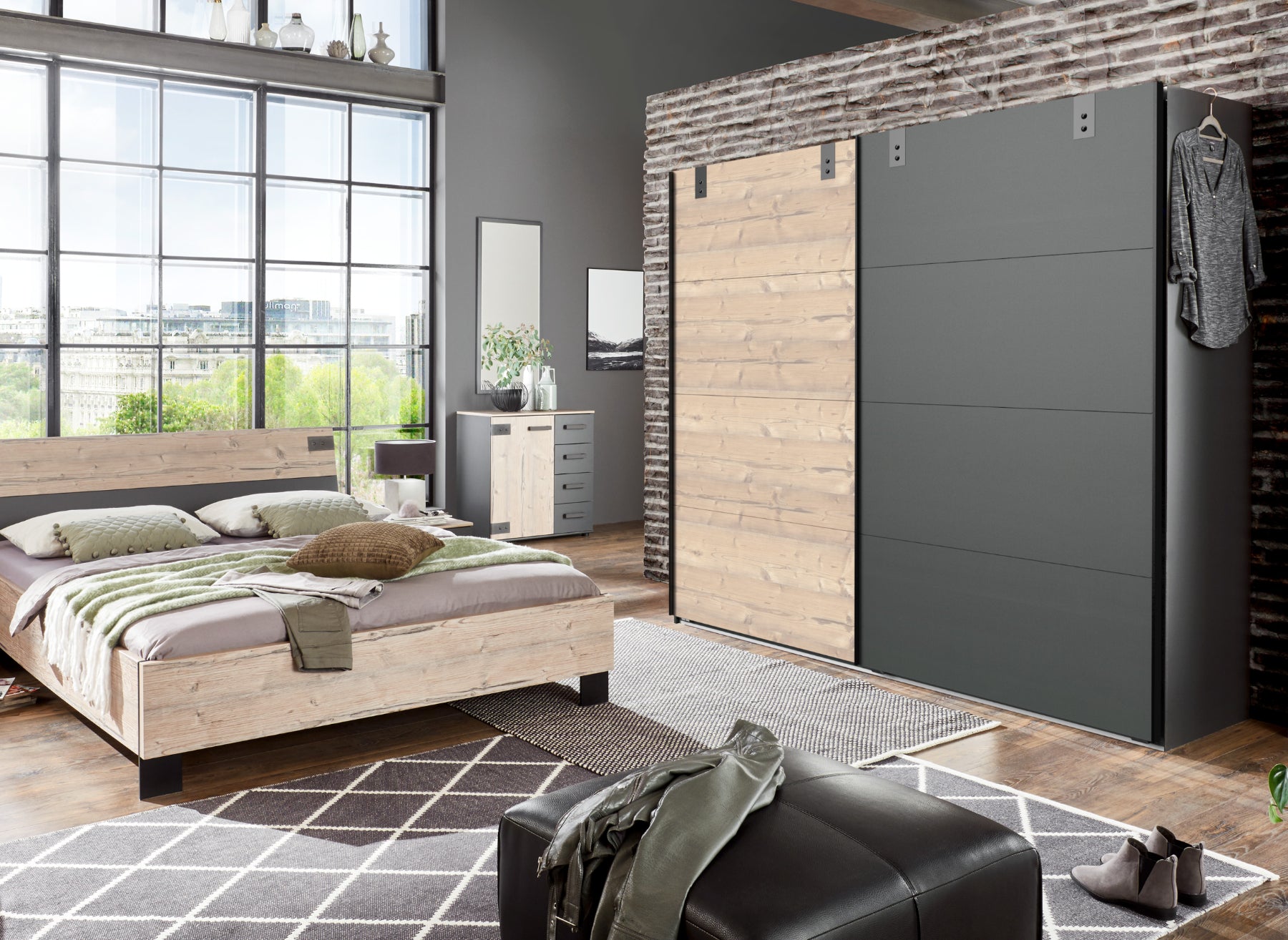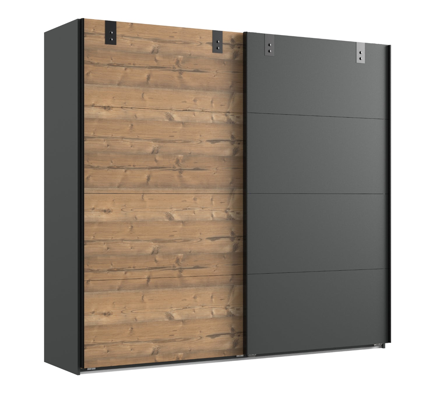 Ohne Passepartout-Rahmen. 2 Abteilungen inkl. Seiten ca. 112,5/112,5 cm, inkl. 2 Einlegeböden und 2 Kleiderstangen. Dekor: Korpus Graphit, Front Silver Fir-Nachbildung, Abs. Graphit.