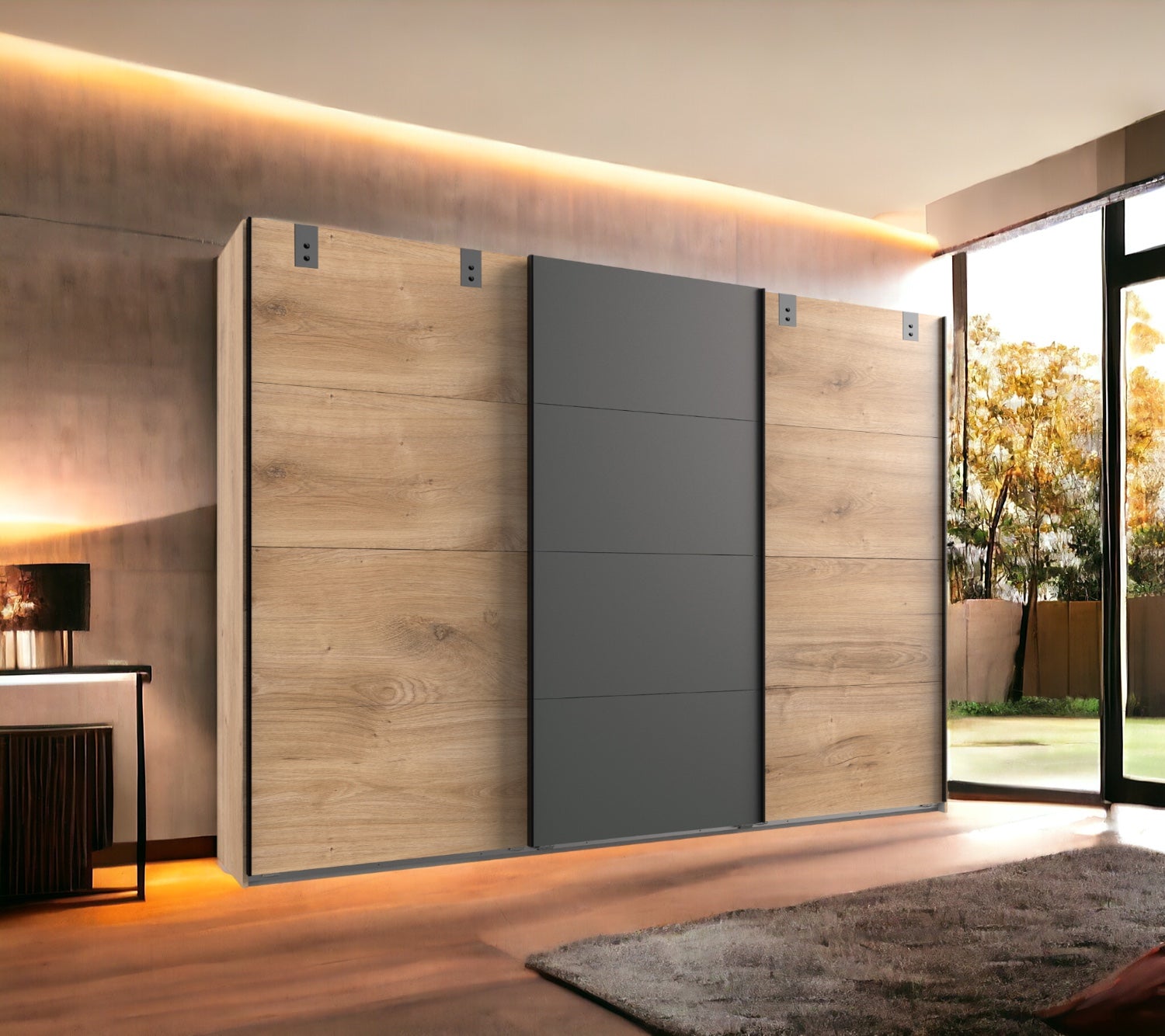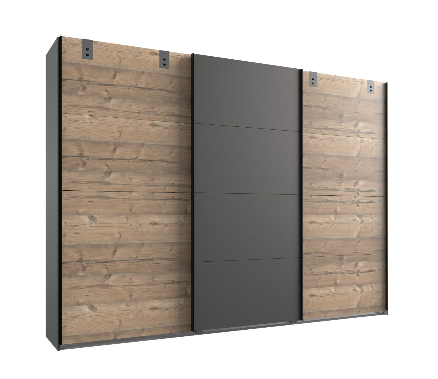 Ohne Passepartout-Rahmen. 3 Abteilungen inkl. Seiten ca. 90/90/90 cm, inkl. 3 Einlegeböden und 3 Kleiderstangen. Dekor: Korpus Graphit, Front Silver Fir-Nachbildung, Abs. Graphit.