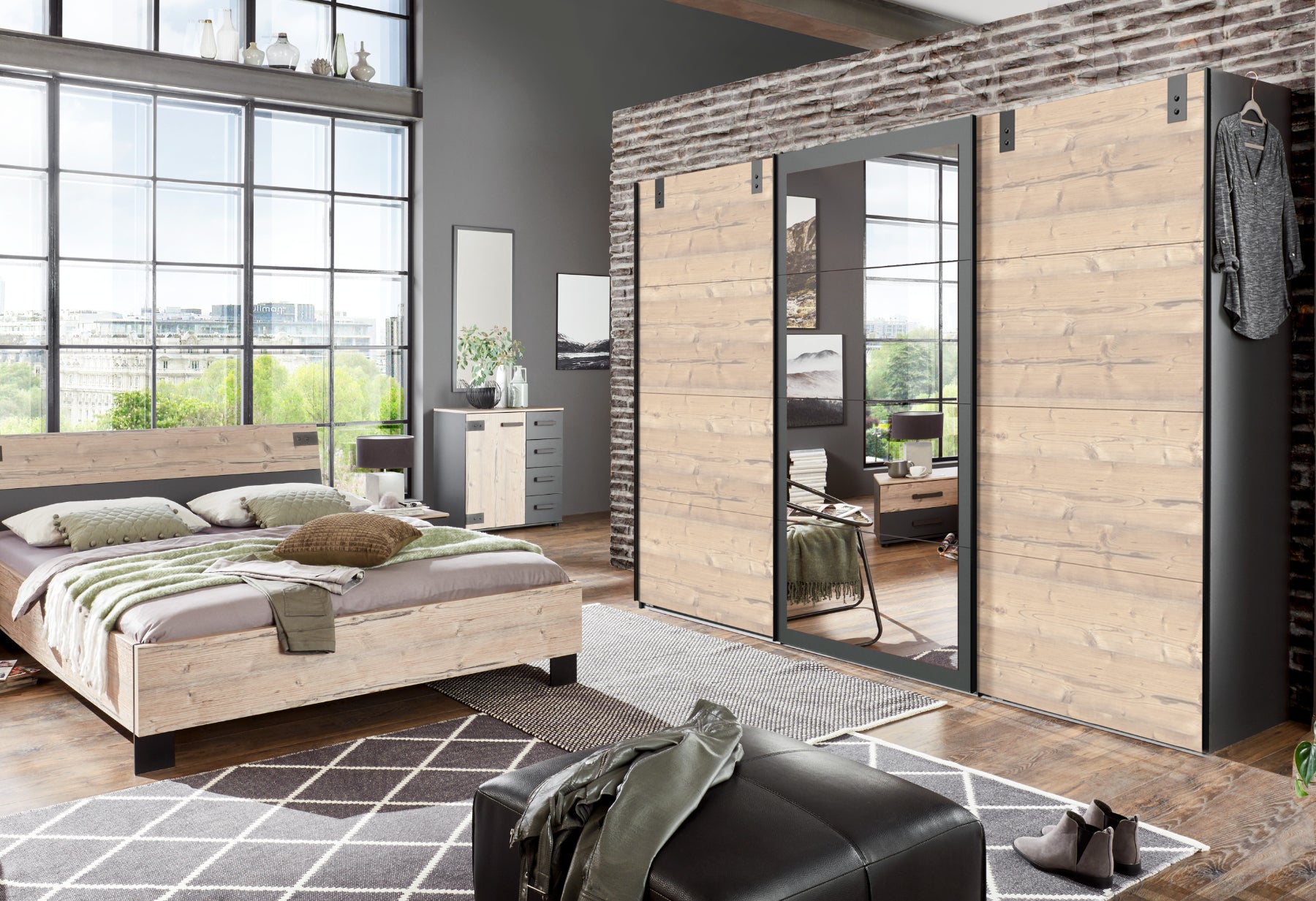 Ohne Passepartout-Rahmen. 3 Abteilungen inkl. Seiten ca. 90/90/90 cm, inkl. 3 Einlegeböden und 3 Kleiderstangen. Dekor: Korpus Graphit, Front Silver Fir-Nachbildung, Abs. Graphit.