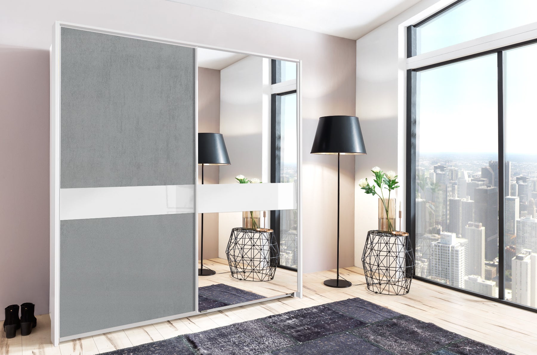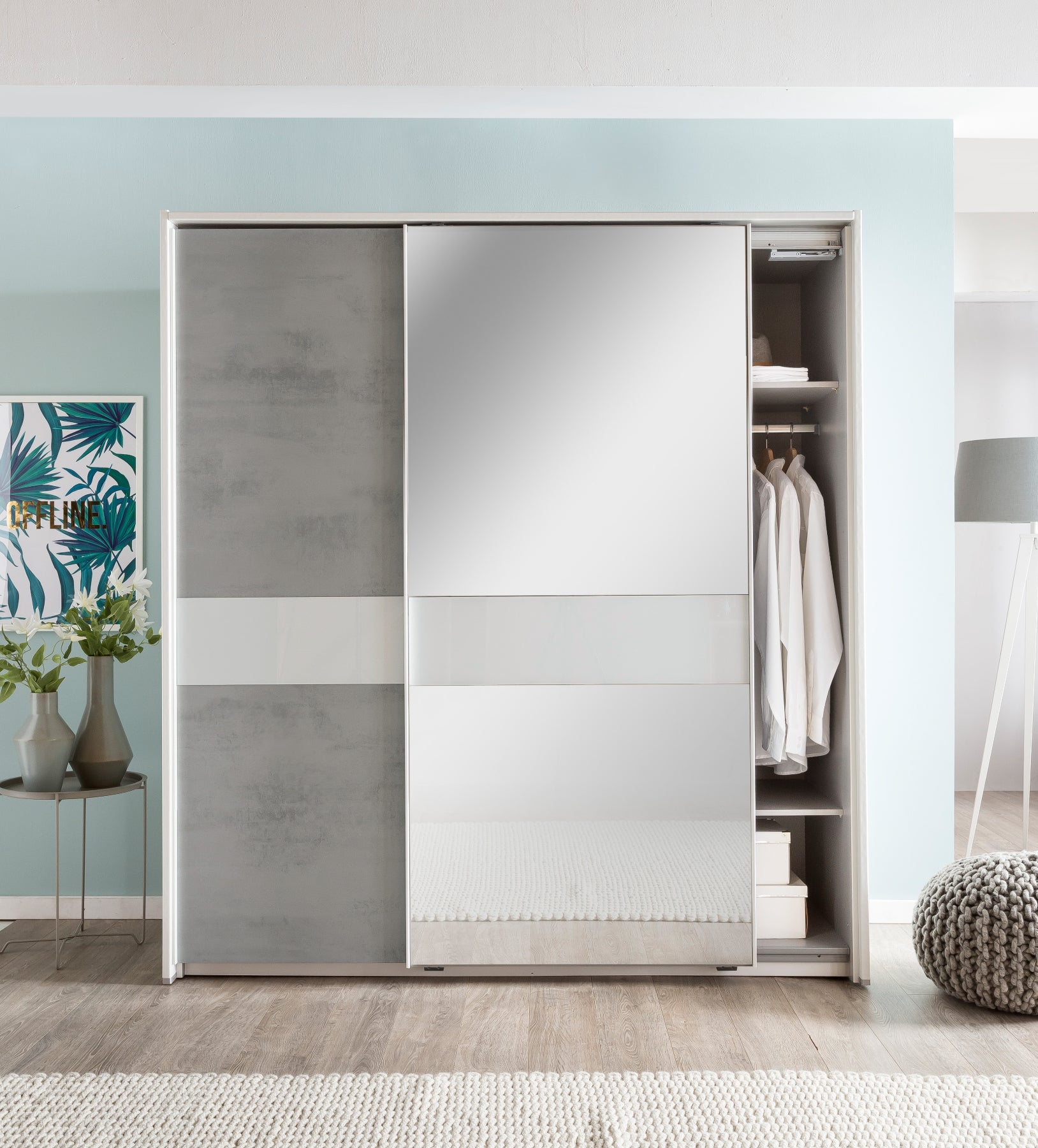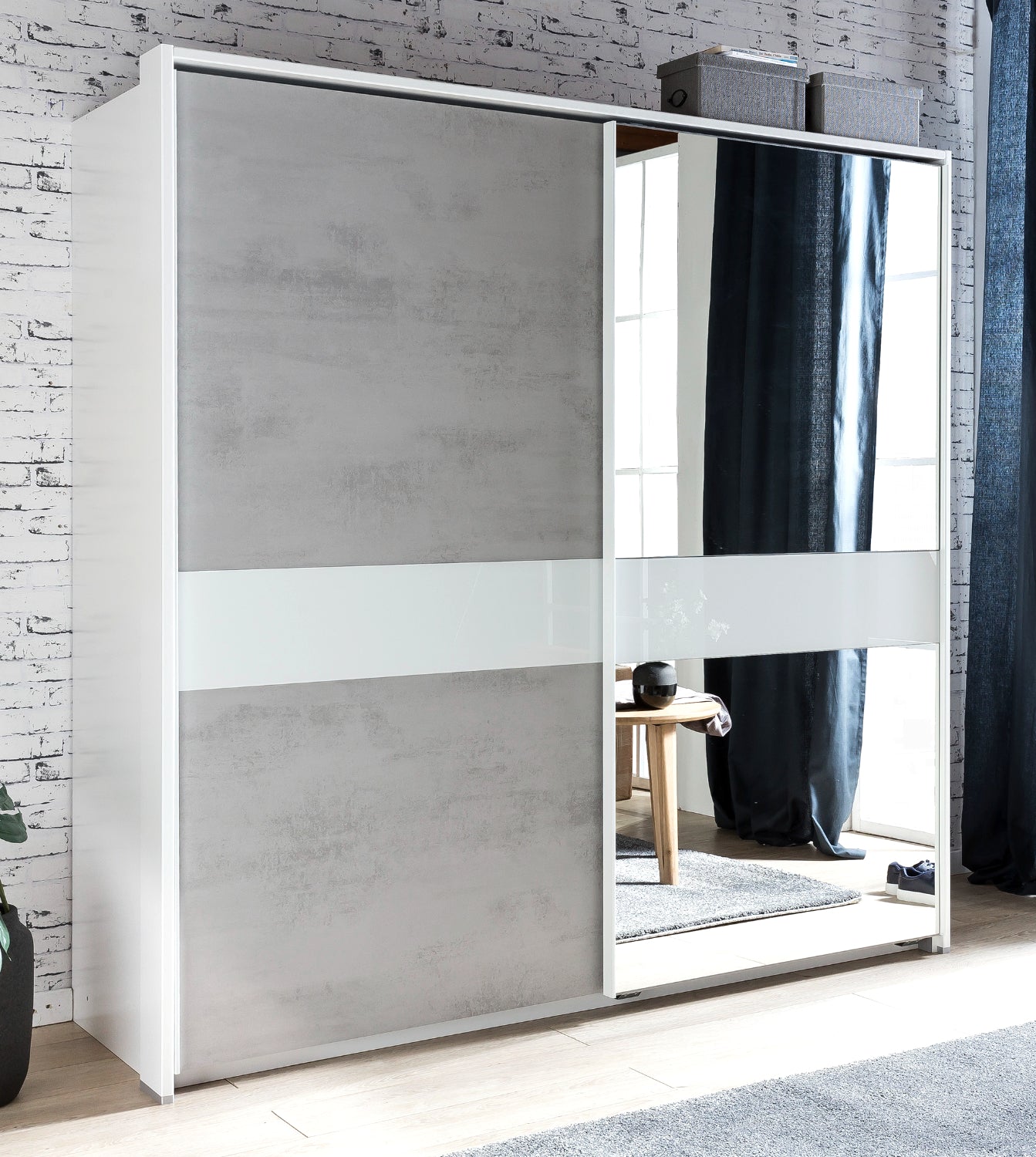 Ohne Passepartout-Rahmen. 2 Abteilungen inkl. Seiten ca.: 90/90 cm, 2 Einlegeböden und 2 Kleiderstangen. Dekor: Korpus Weiß, Front Beton-Nachbildung lichtgrau + Spiegel, Abs. Glas Weiß.